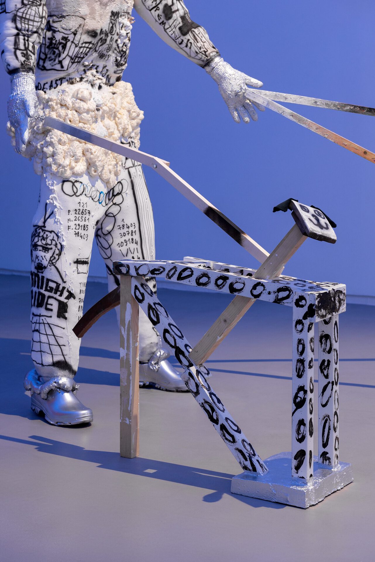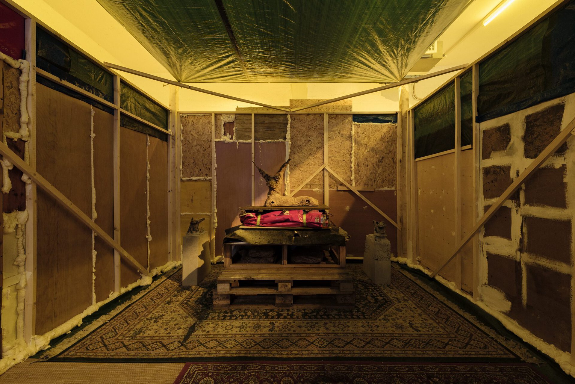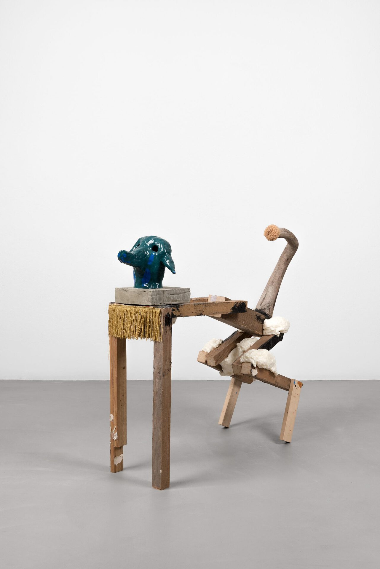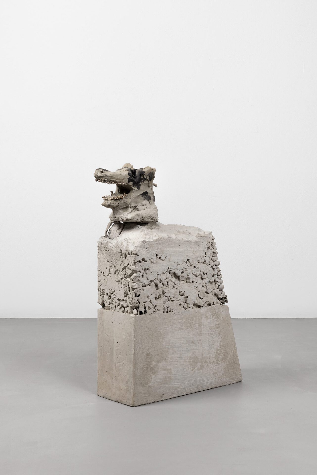 Let’s start from a postcard that draws on decidedly biographical aspects. Roberto Alfano, for those who don’t know him, grew up between the industrialised moors of the sub-rural area par excellence, the Lower Lodigiana, and the livelier and more flooded expanse of the Emilian plain. The postcard in question is an image or a memory that seems at first glance to rummage around with that neo-realist bucolic of the farmyard courtyard, children running in the fields, dogs and walks. And it will immediately seem as if the subjects of Miraggio Inferiore are dogs: dogs of wood, dogs of earth and clay and cement, dogs of cloth and sequins, spotted and striped, motionless and snappy. You will see that there is a shack, just like the abusive ones so often found at the base of motorway overpasses, where you never know whether the mist is actually pollution or vice versa. You will also notice the recurrence of figures and signs with childish features, and this is where we commence.