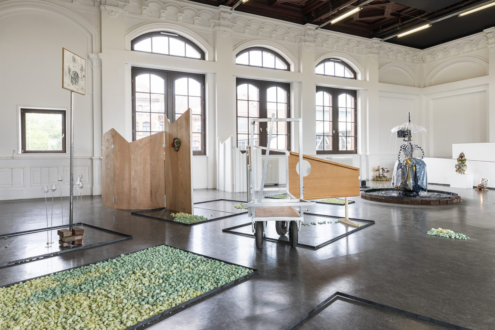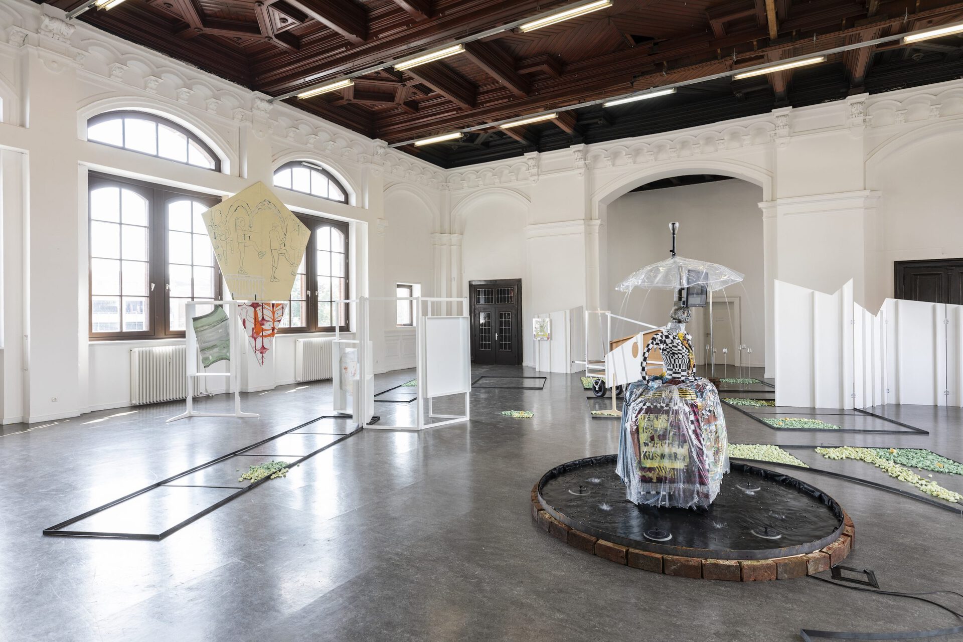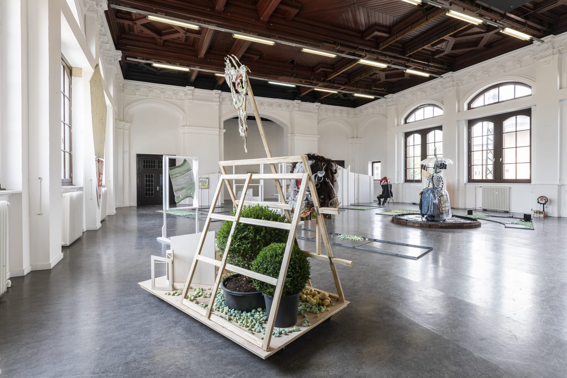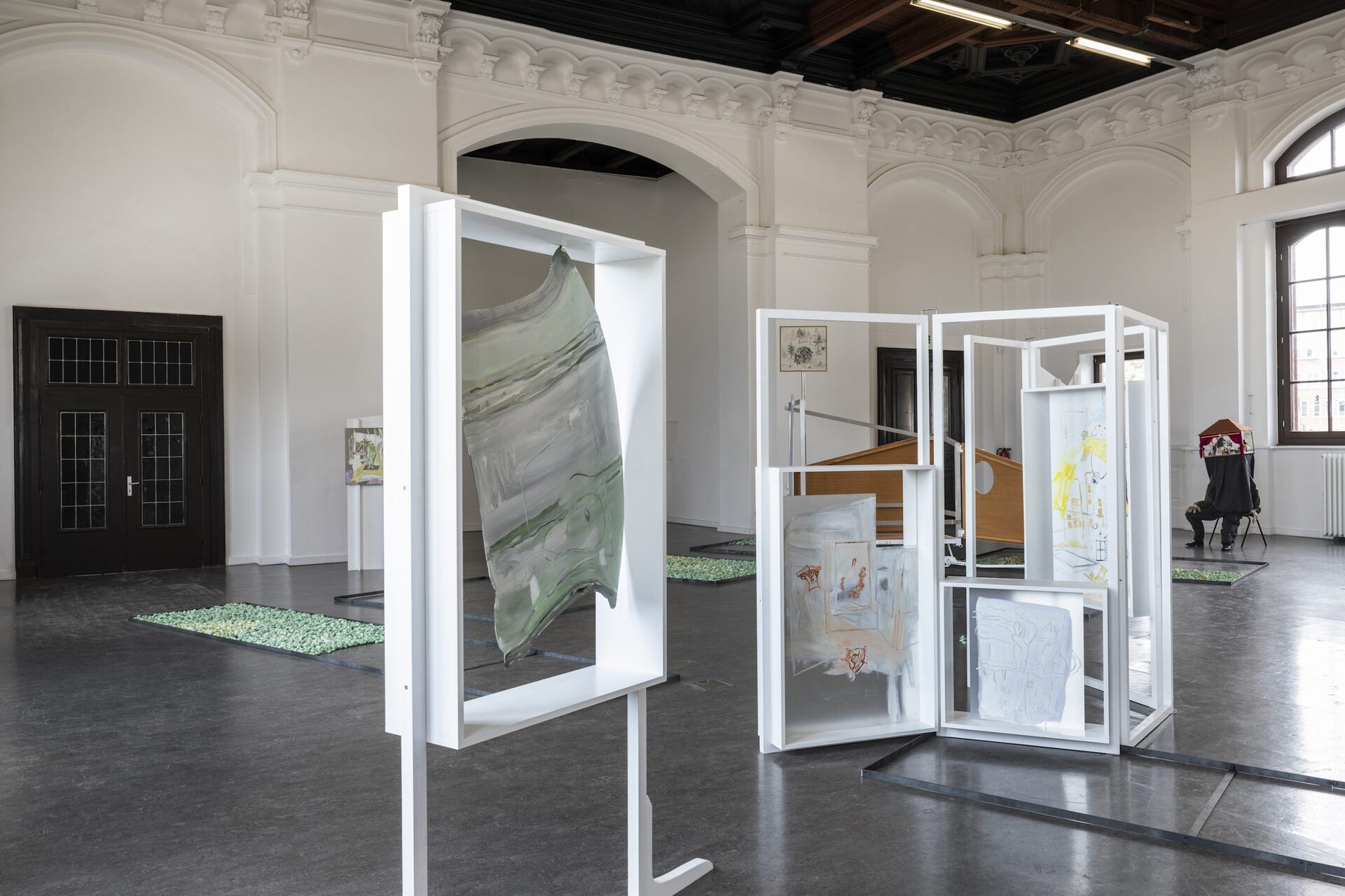 In their exhibition Aha! Laura Ziegler and Maximiliane Baumgartner transform the Kunstverein Harburger Bahnhof into a double or even triple artificial park. Within this, a friendly dialogue takes place between two painters who test and investigate specific approaches to action: in Ziegler's case, often in puppet stages and for her film club, in Baumgartner's work as transient action spaces and settings in collaboration with children and youth. In doing so, the two artists refer to figures such as vagabonds, pedagogues, balladeers, and ornamental hermits who were artistically active in public spaces, parks, and squares, where they assumed positions that were in tension with their social surroundings. The two artists each do so in their individual expanded notions of painting. These figures are part of Baumgartner and Ziegler's dialogue about role models for artists, forms of knowledge production and self-organization, as well as about viewer roles and artistic forms of action.