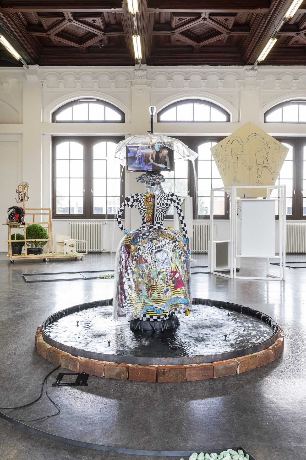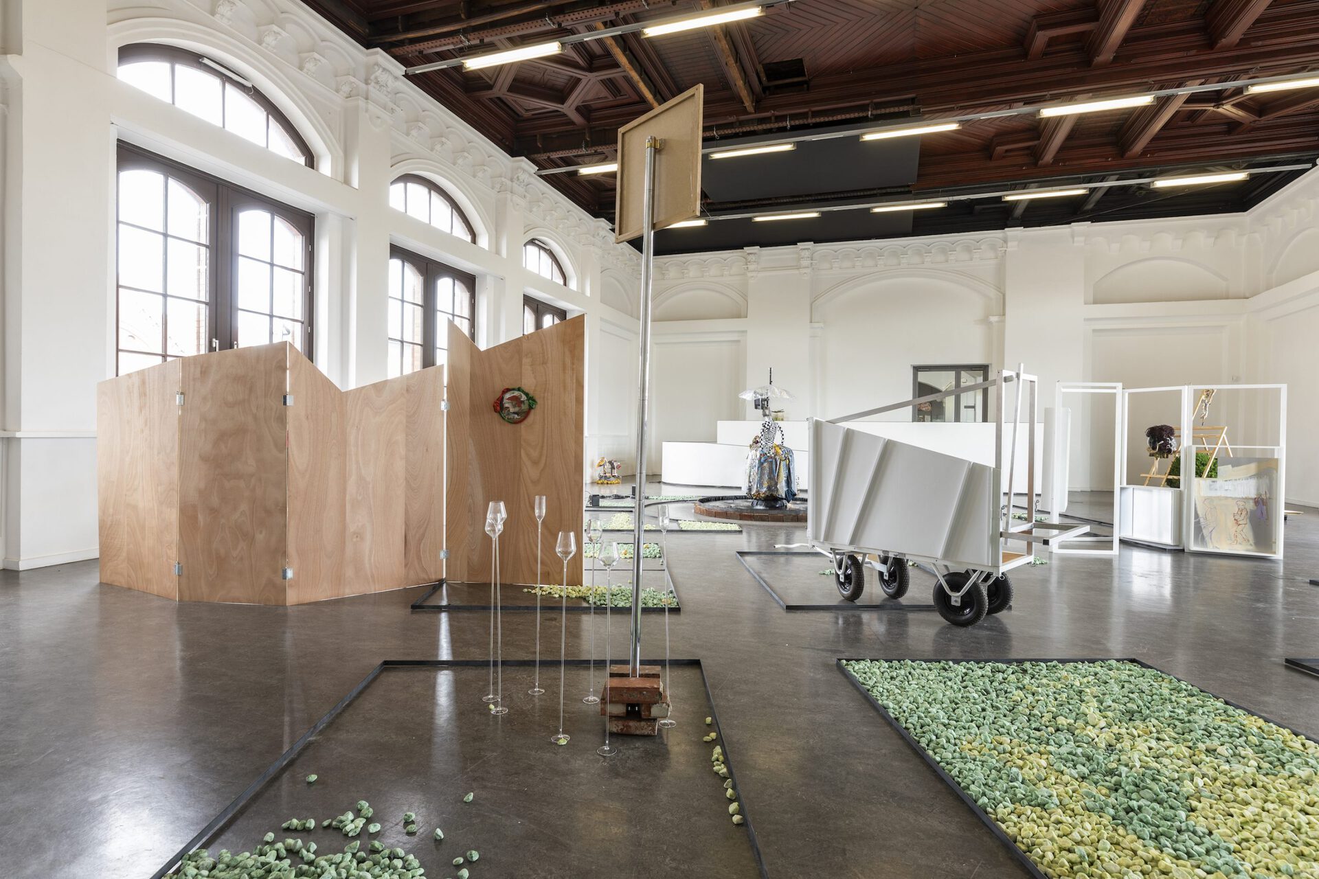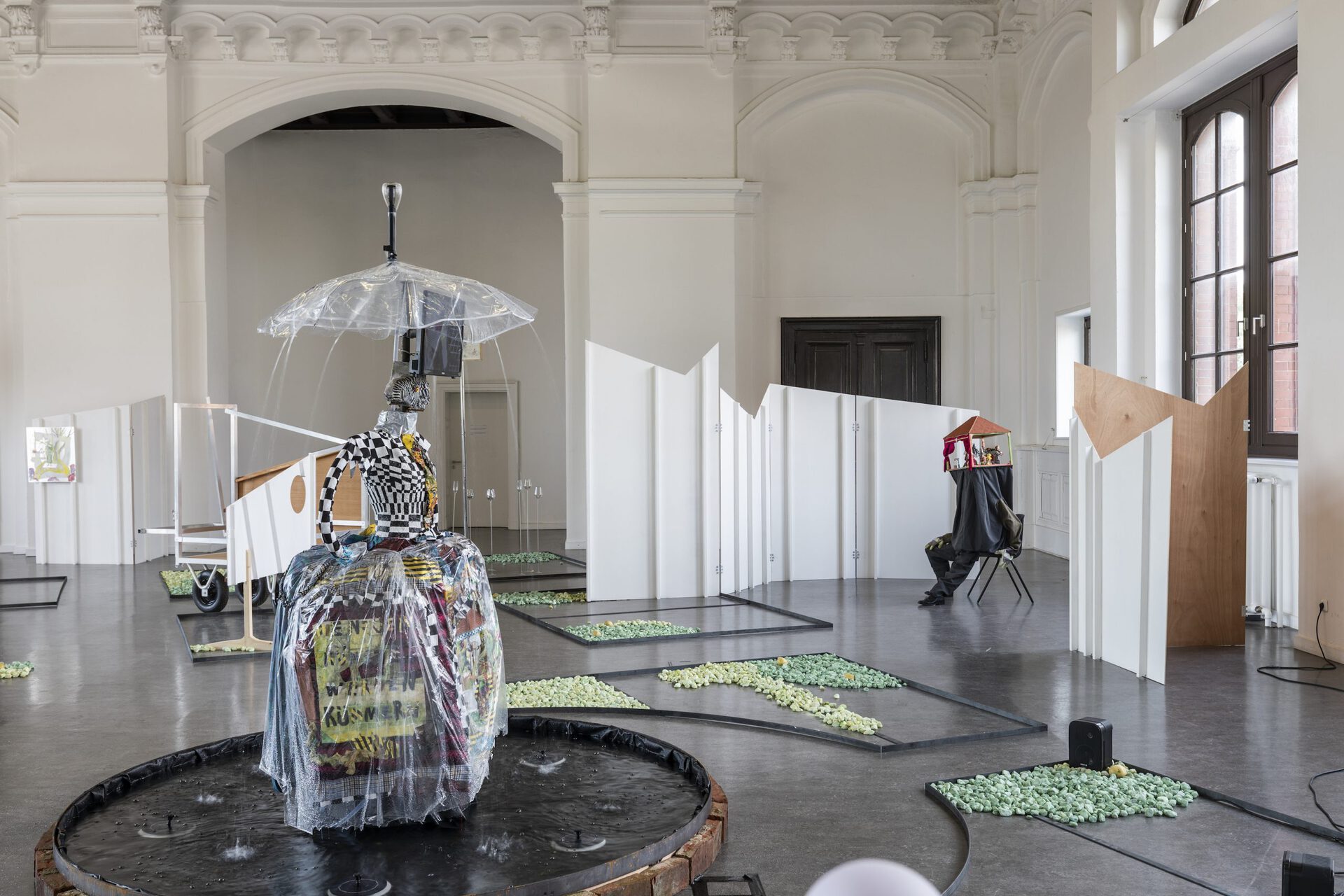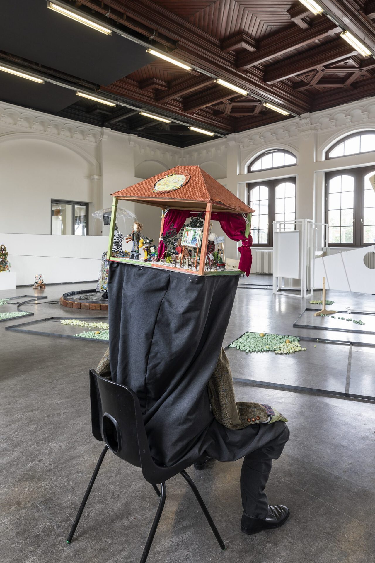 In their exhibition Aha! Laura Ziegler and Maximiliane Baumgartner transform the Kunstverein Harburger Bahnhof into a double or even triple artificial park. Within this, a friendly dialogue takes place between two painters who test and investigate specific approaches to action: in Ziegler's case, often in puppet stages and for her film club, in Baumgartner's work as transient action spaces and settings in collaboration with children and youth. In doing so, the two artists refer to figures such as vagabonds, pedagogues, balladeers, and ornamental hermits who were artistically active in public spaces, parks, and squares, where they assumed positions that were in tension with their social surroundings. The two artists each do so in their individual expanded notions of painting. These figures are part of Baumgartner and Ziegler's dialogue about role models for artists, forms of knowledge production and self-organization, as well as about viewer roles and artistic forms of action.
