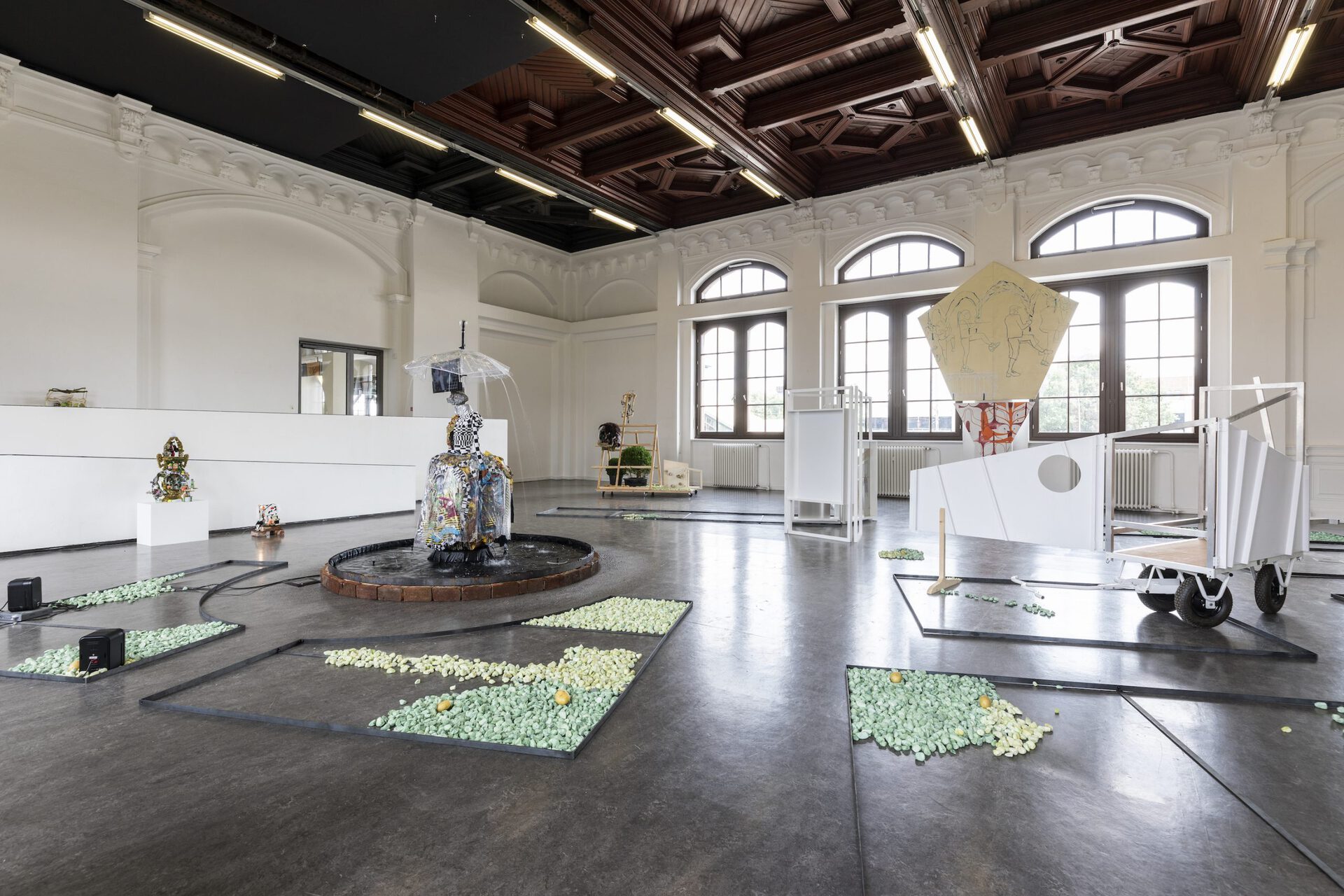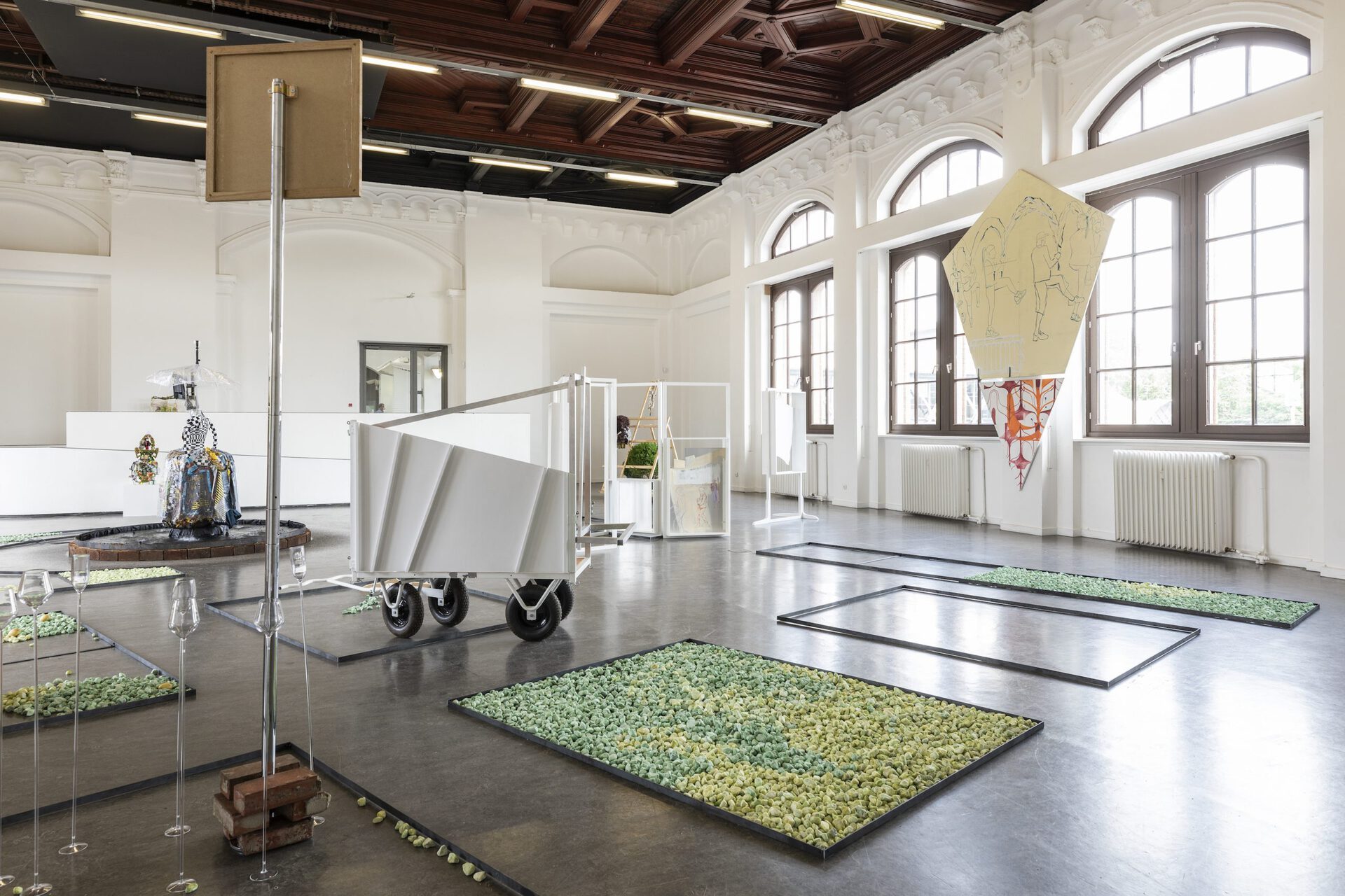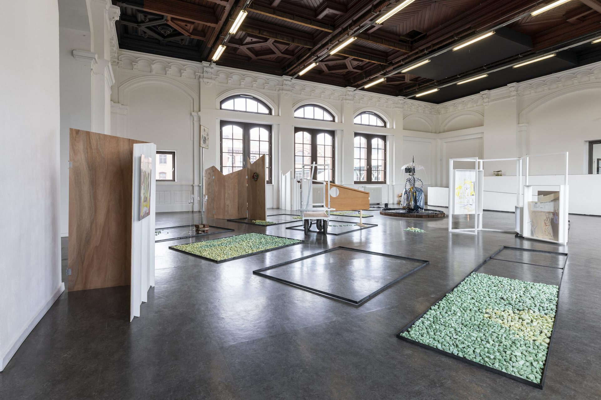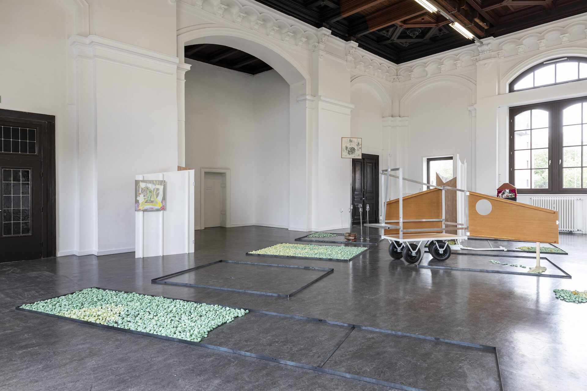 With the exhibition title Aha! Baumgartner and Ziegler refer to a surprisingly visible type of trench which suggests openness, yet simultaneously is a culturally created restriction. The Aha, like other design devices in the formal vocabulary of parks, aims to evoke certain effects and behaviors and thus exemplifies forms of social disciplining and hierarchization. Baumgartner and Ziegler's park setting suggests a reinterpretation and different use thereof. In addition to appropriations of park grammars in plots "overgrown" with gravel and moss or, for example, a TV fountain by Ziegler, the exhibition space contains elements of a pedagogical architecture that point to Baumgartner's upcoming as well as past actions. They use their "park" and their extended painterly practices as scenic elements to question artistic modes of action.