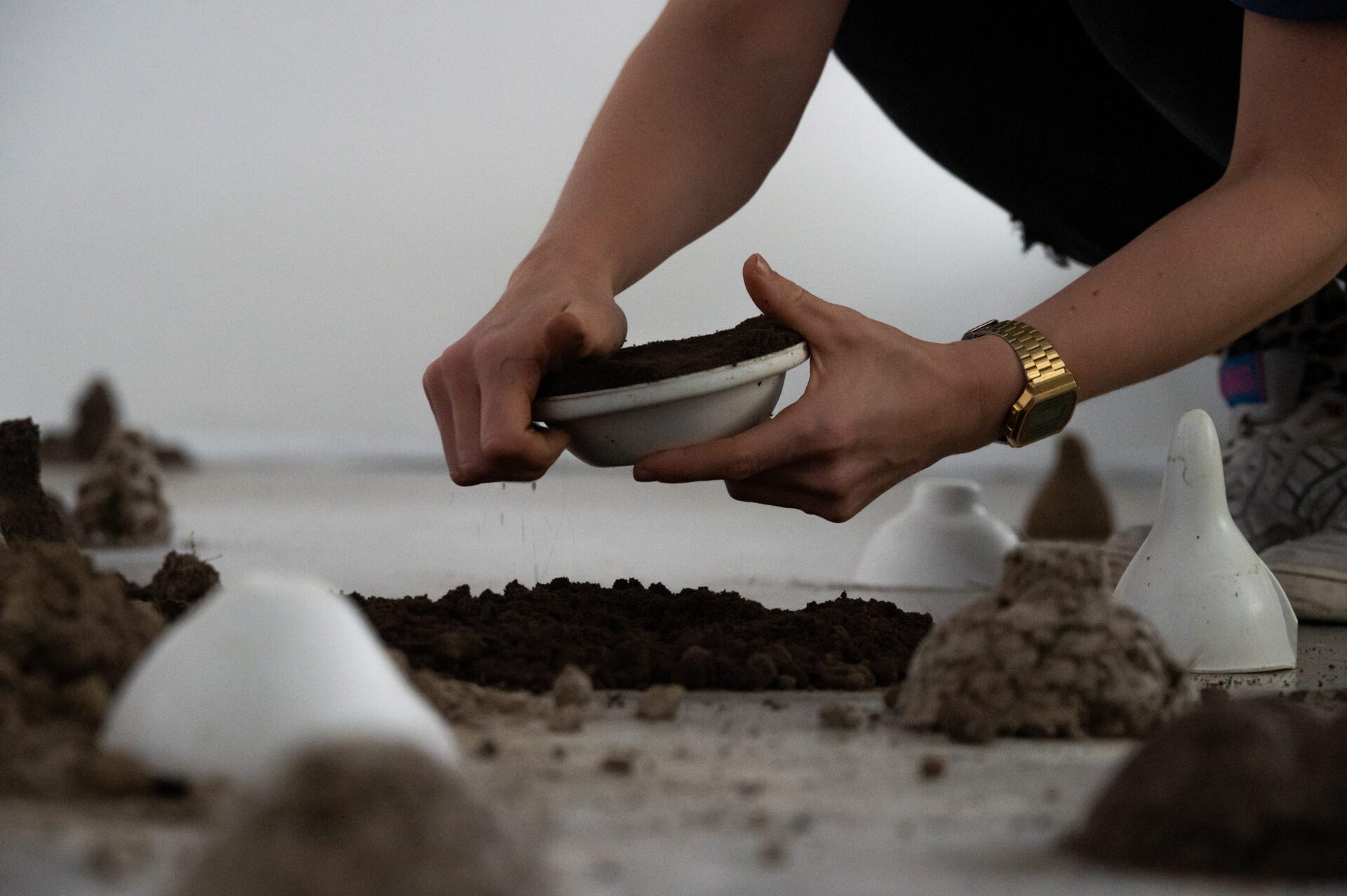 Auf dem Boden des Ausstellungsraums fffriedrich ist ein kleiner Hügel aus Erde aufgehäuft, um ihn herum liegen weiße Förmchen, die an Sandkastenspielzeug erinnern. Besucher*innen haben sie mit Erde gefüllt und kleine Skulpturen geschaffen, die sich überall im Raum verteilen. Einige sammeln sich in der Mitte, vereinzelt findet man sie auch etwas abseits in den Ecken, auf der Heizung, am Fensterbrett. Obwohl sie denselben Formen entstammen, sehen die kleinen Gebilde sehr unterschiedlich aus. Je nachdem, wie lange sie schon dort stehen, sind ihre Konturen klar zu erkennen oder beginnen, dünne Risse zu bekommen und auseinanderzufallen. Einige Besucher*innen nutzen die Form nur als Ausgangspunkt, um eigene Erdskulpturen zu schaffen, indem sie sie erweitern, kleine Stöcke hineinstecken oder an bereits bestehende Skulpturen anbauen. Die interaktive Installation shaping (2021) der Künstlerin Ludmila Hrachovinová ist ständig in Veränderung. Auf Grundlage der Formen, die die Künstlerin aus persönlichen Erinnerungen entwickelte, gestalten die Ausstellungsbesucher*innen sie jeden Tag neu. Im Mittelpunkt von Hrachovinovás künstlerischer Arbeit steht die Malerei, die sie jedoch immer wieder in Beziehung zu skulpturalen Objekten und performativen Elementen setzt und dabei den Entstehungsprozess von Formen hinterfragt.