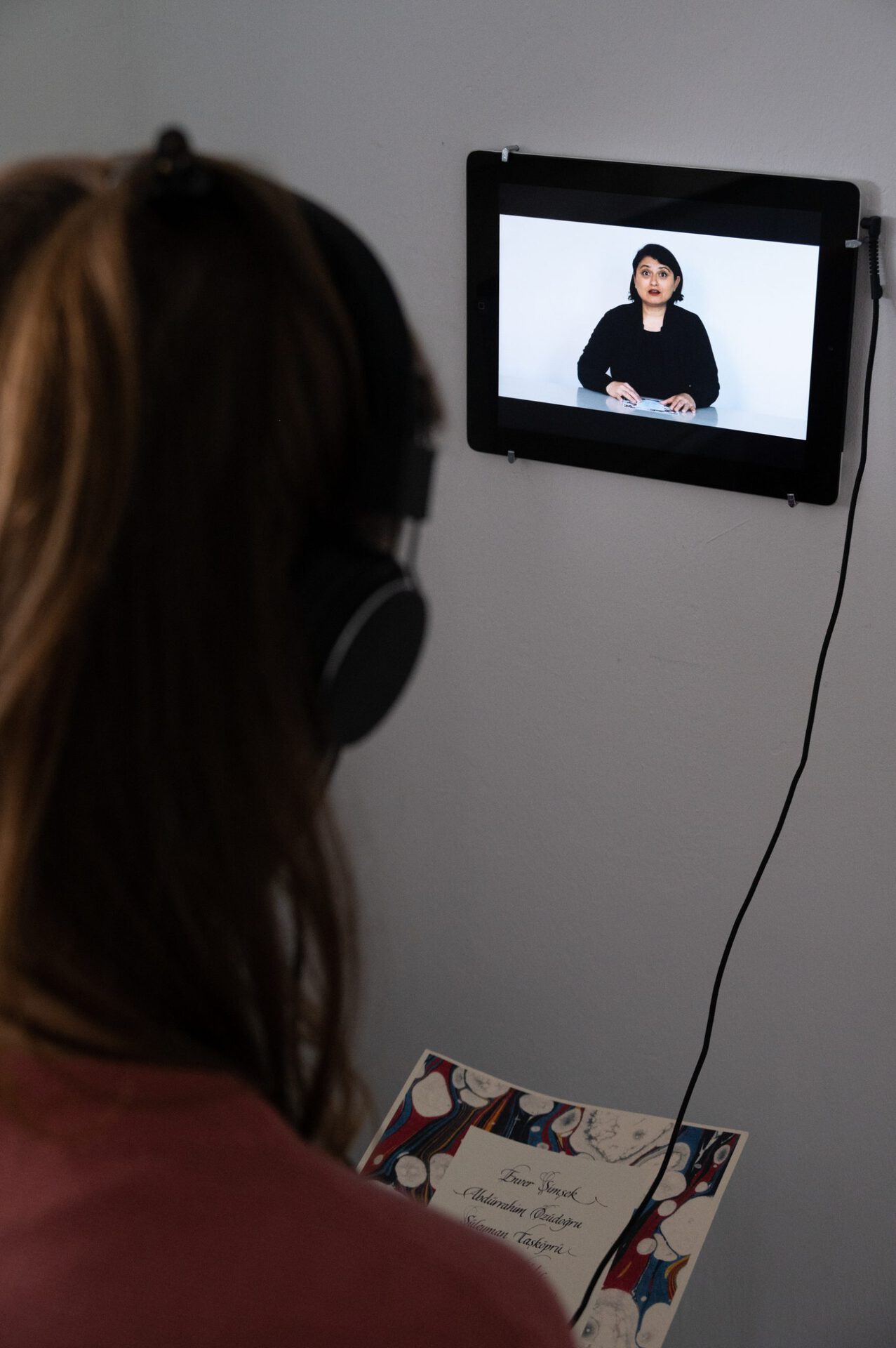 Nimmt man auf einem Hocker in einer Nische des Ausstellungsraums Platz, begegnet man der Künstlerin in einer gesprächsähnlichen Situation. Auf einem Bildschirm, der auf Augenhöhe an der Wand angebracht ist, spricht Süngün vor weißem Hintergrund frontal in die Kamera. Sie beginnt mit der Aussprache einzelner Buchstaben und spricht im Anschluss die zehn Namen. Die Betrachter*innen sind aufgefordert, diese mitzusprechen. Mit ausdrucksstarker Mimik und Gestik begleitet Süngün einzelne Laute – das „ı“ holt sie mit ihrer linken Hand aus dem Zwerchfell nach oben, ein Close-up zeigt die Vibration ihrer Zunge, wenn sie das „r“ rollt. Die langsame, beständige Wiederholung überartikulierter Laute in einem freundlichen aber dennoch bestimmten Tonfall erinnert dabei an den belehrenden Gestus, dem viele Migrant*innen alltäglich begegnen. In Süngüns TUTORIAL kollidiert er mit der Unfähigkeit von Mitgliedern der deutschen Mehrheitsgesellschaft, die Namen derjenigen zu kennen und korrekt auszusprechen, mit denen sie seit Jahrzehnten zusammenleben. Die Aufforderung der Künstlerin, sich dem eigenen Unbehagen zu stellen und die Namen der Ermordeten laut zu sprechen, ist zugleich ein Appell, diese im kollektiven Gedächtnis zu verankern und in gemeinsamer Erinnerung gegen das Vergessen zu arbeiten.