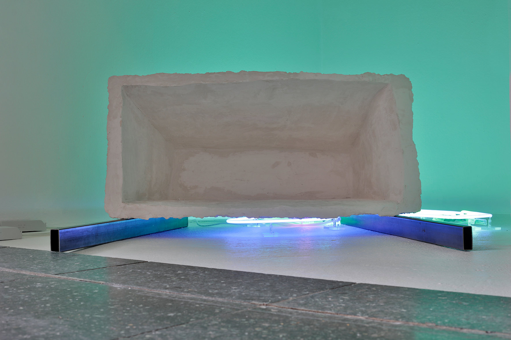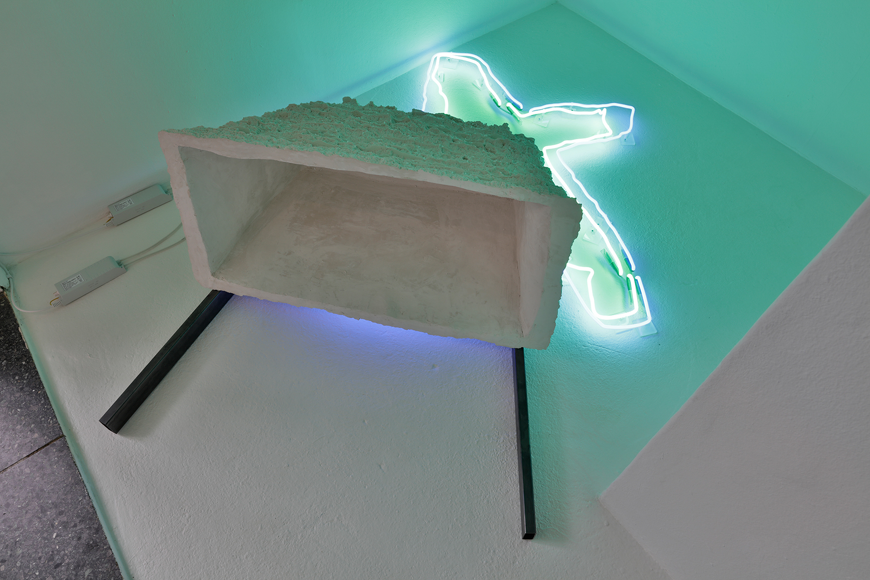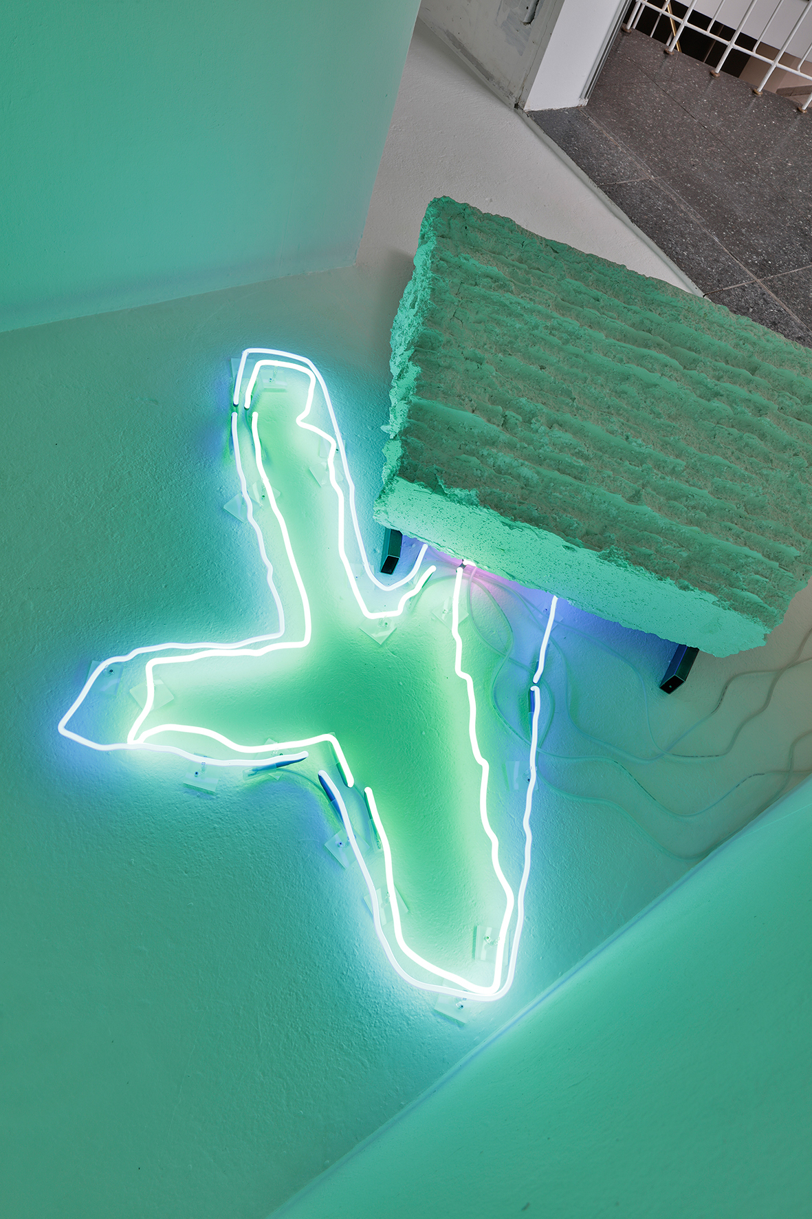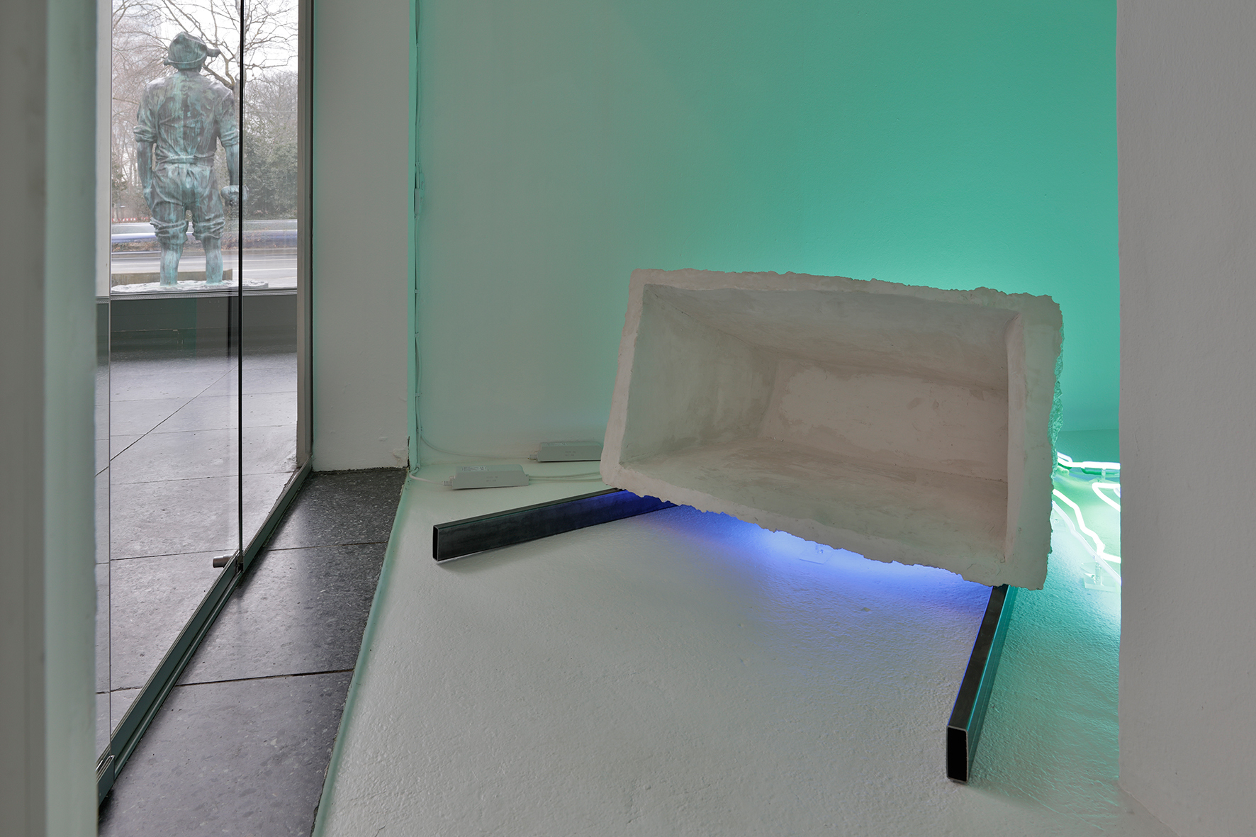 MOTHER” the artist is however not aiming to establish a specific reference to traditional representations of the human figure; rather, by combining his previous artistic explorations he has condensed the relationship in particular between his sculptural and his painted work. In the glass case in the foyer of the Hentrichhaus he presents a hollow plaster object, rectangular and tapering in shape, which is supported by two steel beams. The inside of the sculpture is smooth, while its exterior presents a rough and jagged texture. Its appearance is reminiscent of a toppled plinth, or perhaps a loudspeaker. On the ground below the described element lies a two-coloured fragment of an oversized figurative drawing by Matthias Grotevent. For this piece the artist has translated the sketched body to a new material. Neon light now radiates up from the ground, over the plinth and into the entire room, dividing the exhibition space into a green and a neutral area. This location-specific installation alludes to the vertical as a characteristic property of the statue.