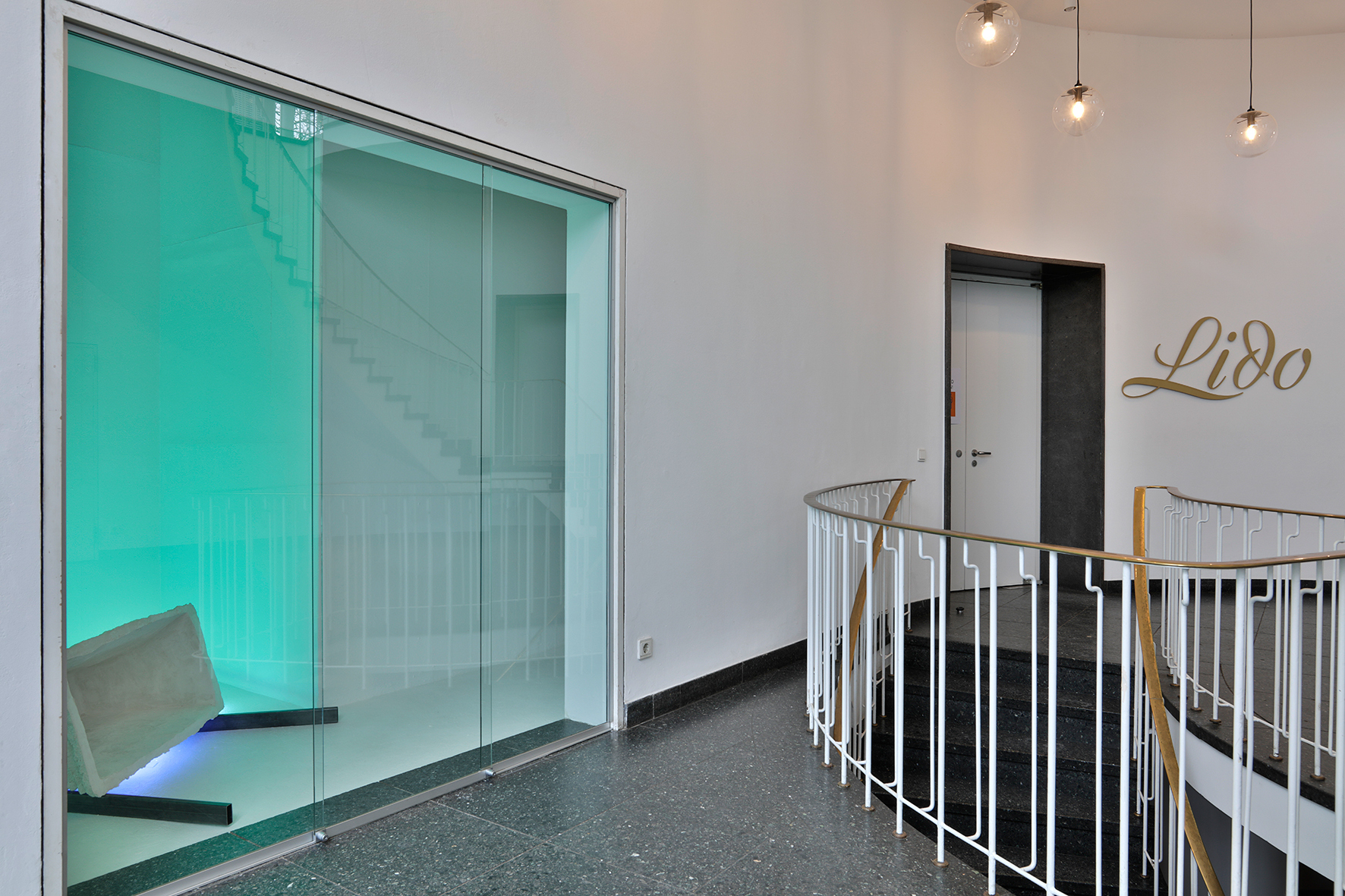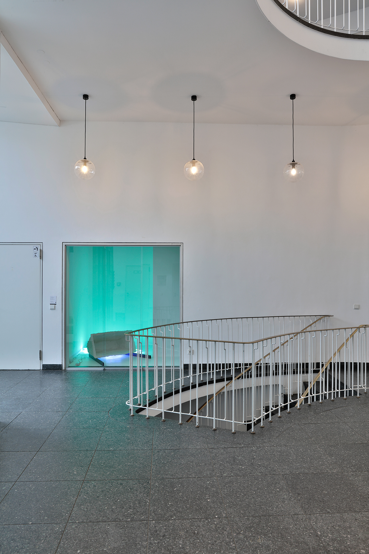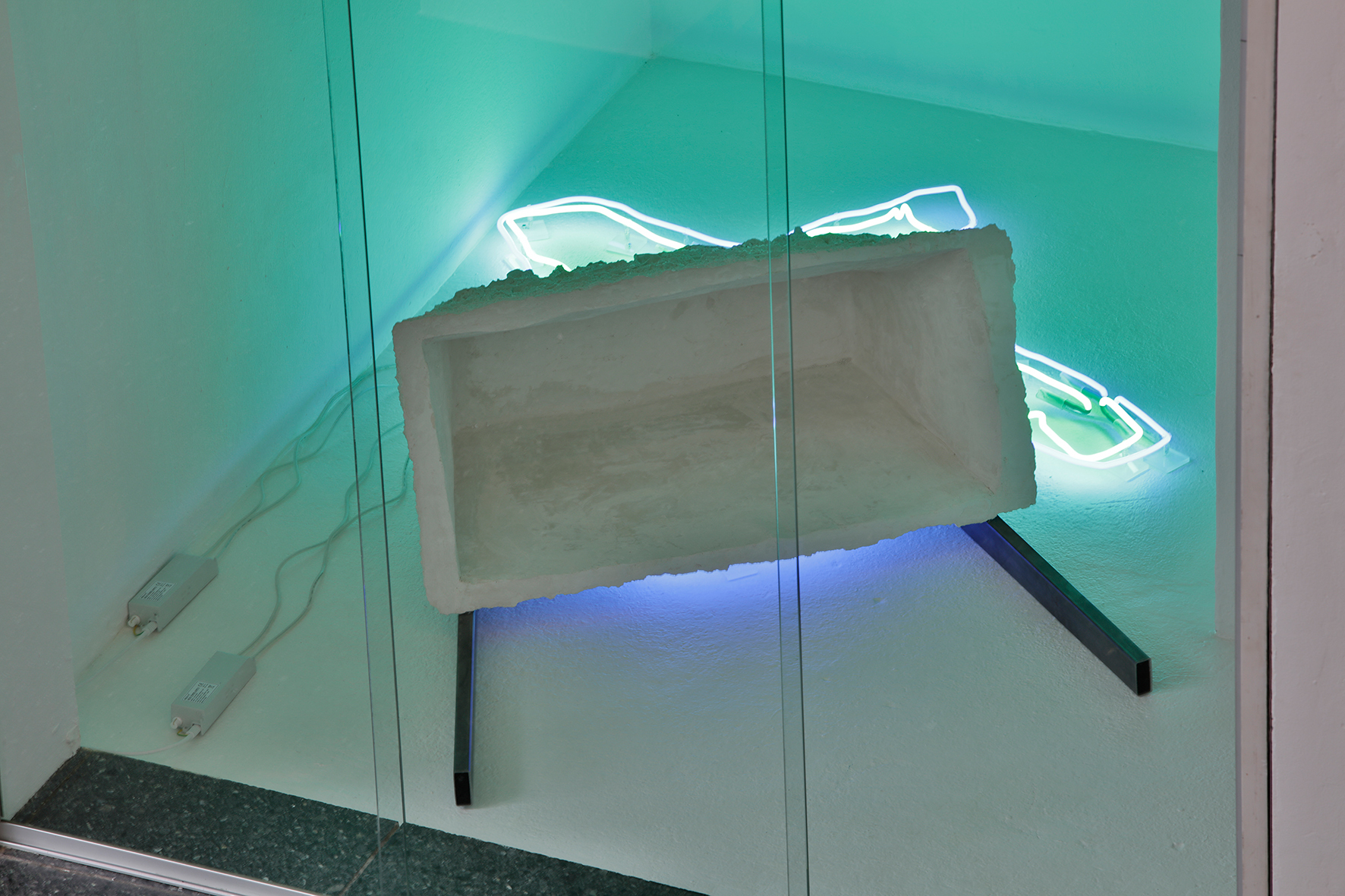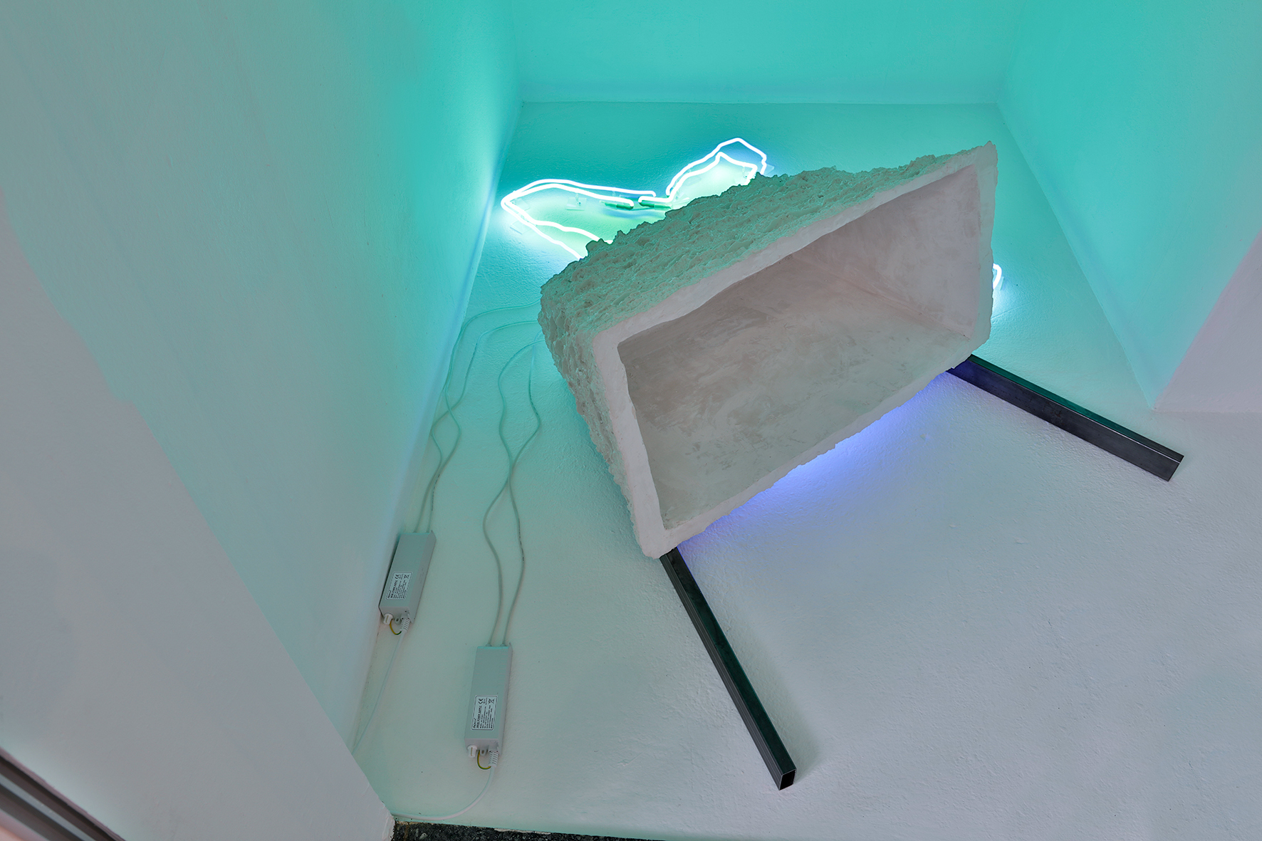 MOTHER” the artist is however not aiming to establish a specific reference to traditional representations of the human figure; rather, by combining his previous artistic explorations he has condensed the relationship in particular between his sculptural and his painted work. In the glass case in the foyer of the Hentrichhaus he presents a hollow plaster object, rectangular and tapering in shape, which is supported by two steel beams. The inside of the sculpture is smooth, while its exterior presents a rough and jagged texture. Its appearance is reminiscent of a toppled plinth, or perhaps a loudspeaker. On the ground below the described element lies a two-coloured fragment of an oversized figurative drawing by Matthias Grotevent. For this piece the artist has translated the sketched body to a new material. Neon light now radiates up from the ground, over the plinth and into the entire room, dividing the exhibition space into a green and a neutral area. This location-specific installation alludes to the vertical as a characteristic property of the statue.