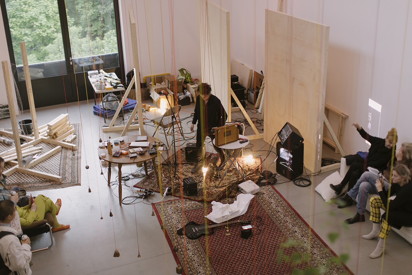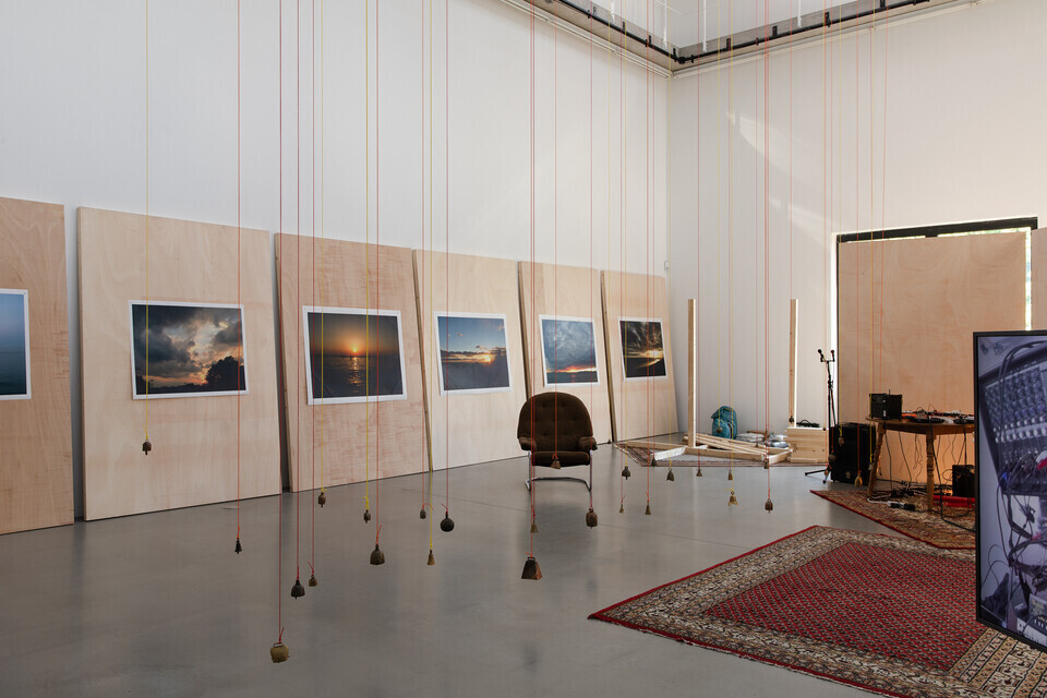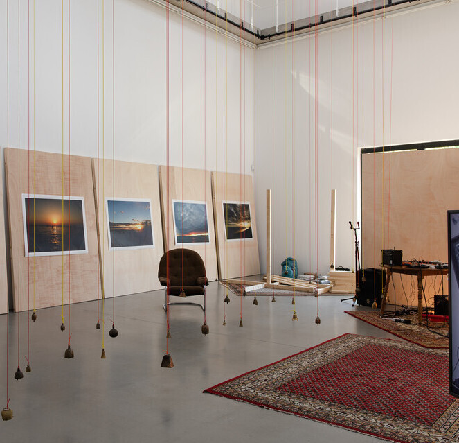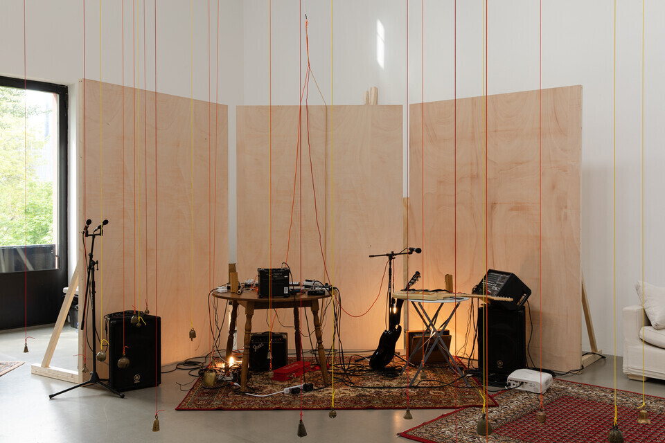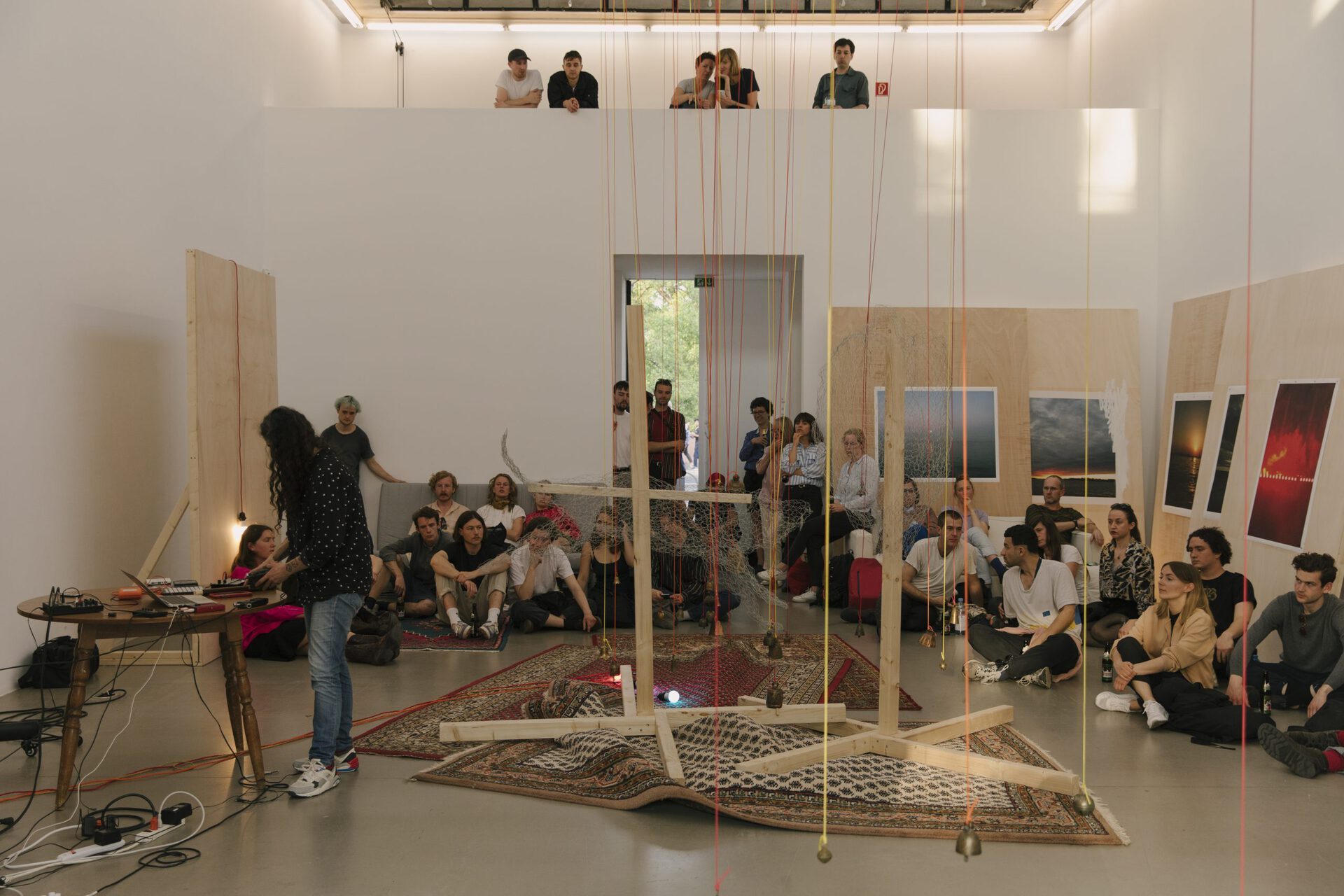 Überschreitet der_die Besucher_in die Schwelle des Ausstellungsraumes, ist er_sie vorerst mit Chaos konfrontiert: in der Mitte des Raumes baumeln von der Decke bis beinahe auf den Boden herabhängende Glocken. Links wie rechts befinden sich angelehnte, gestapelte oder freistehende Stellwände aus Holz, an einigen von ihnen sind großformatige Bilder von Sonnenuntergängen angebracht. Die klebrigen Leimspuren sind noch sichtbar. Mit dem Verlauf der Zeit wurden es mehr Bilder. Nach Kasper sind die Stellwände nicht nur Bildträger, sondern können in der Vertikalen zu Bühnen transformiert werden: die visuellen Codes, wie die des Sonnenaufgangs, werden von den Performances überschrieben. Weiterhin im Raum verteilt liegen ornamentale Teppiche, diverse Sitzgelegenheiten, ein großer, runder Tisch, auf dem Mischpult, Gitarre, Verstärker, und weitere Gegenstände abgelegt sind. Alles ist oder wird künftig Teil des performativen Agierens. Mit Kaspers künstlerischem Arbeiten im Raum ändert sich das Arrangement jener Gegenstände stetig. Die Kuratorin der Ausstellung, Christina Lehnert, legt wöchentlich aktualisierte Raumpläne aus, die im Rückblick das Zeugnis dieser Veränderungen sind. Kasper selber befindet sich irgendwo im Raum, selten hat sie gefehlt, und begrüßt jede_n Besucher_in mit einem freundlichen „Hey, how are you doing?“, um ein Gespräch zu beginnen. Hier beginnt nun etwas, das sich dem Sichtbaren entzieht: Künstlerin und Rezipient_In gehen ein Verhältnis ein. Kasper hat zwar konzeptuelle Notizen für „The Wolf and The Head On Fire“ entwickelt, dennoch bleibt der Verlauf der Ausstellung offen. Jeder Kontakt, jeder Besuch hinterlässt Spuren.