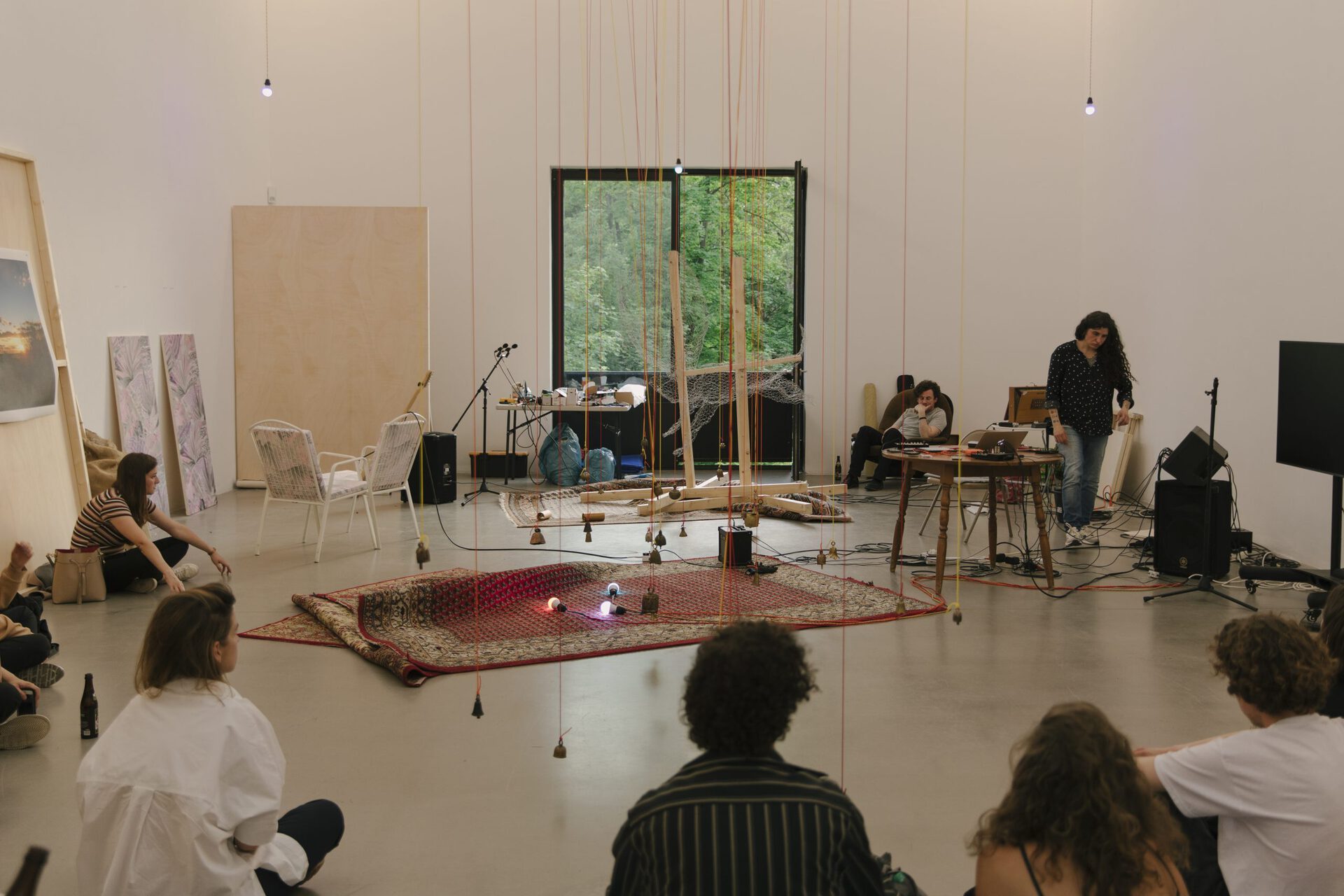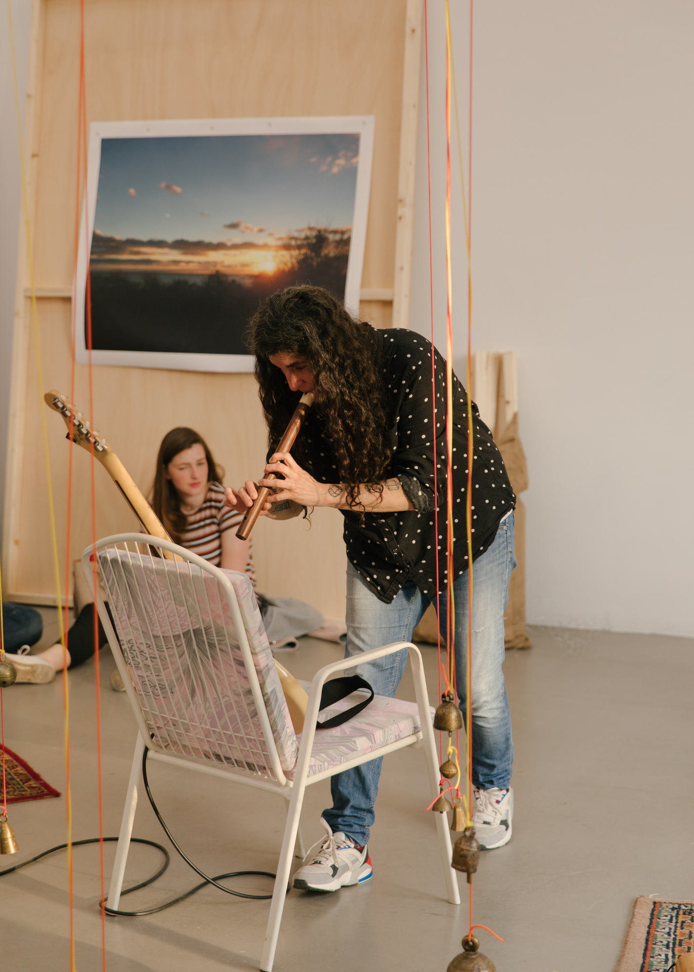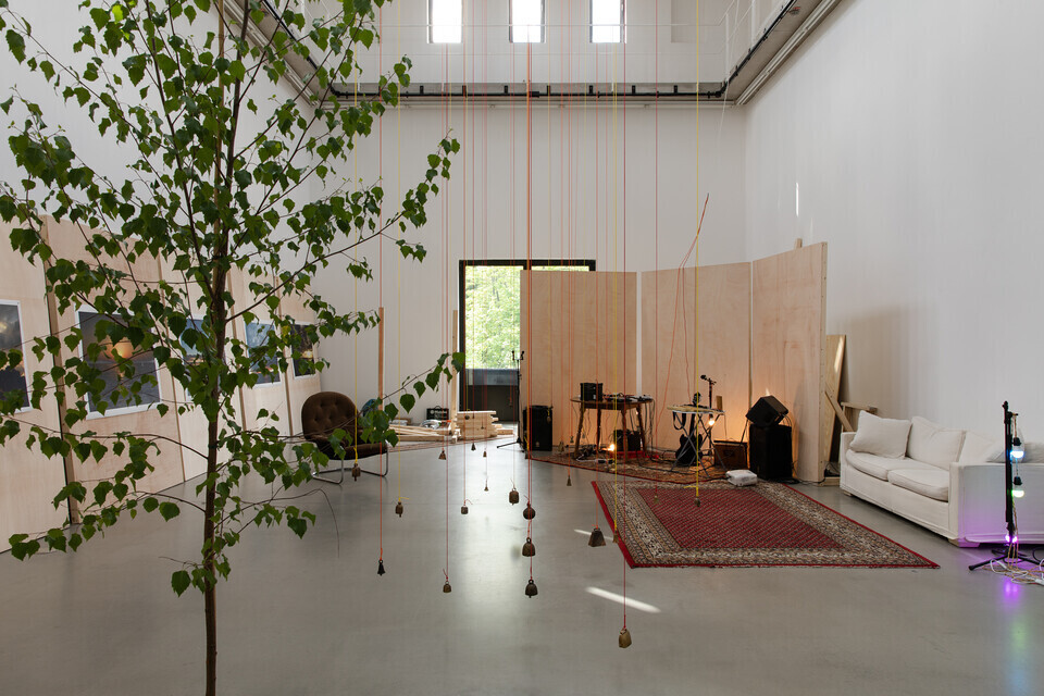 Überschreitet der_die Besucher_in die Schwelle des Ausstellungsraumes, ist er_sie vorerst mit Chaos konfrontiert: in der Mitte des Raumes baumeln von der Decke bis beinahe auf den Boden herabhängende Glocken. Links wie rechts befinden sich angelehnte, gestapelte oder freistehende Stellwände aus Holz, an einigen von ihnen sind großformatige Bilder von Sonnenuntergängen angebracht. Die klebrigen Leimspuren sind noch sichtbar. Mit dem Verlauf der Zeit wurden es mehr Bilder. Nach Kasper sind die Stellwände nicht nur Bildträger, sondern können in der Vertikalen zu Bühnen transformiert werden: die visuellen Codes, wie die des Sonnenaufgangs, werden von den Performances überschrieben. Weiterhin im Raum verteilt liegen ornamentale Teppiche, diverse Sitzgelegenheiten, ein großer, runder Tisch, auf dem Mischpult, Gitarre, Verstärker, und weitere Gegenstände abgelegt sind. Alles ist oder wird künftig Teil des performativen Agierens. Mit Kaspers künstlerischem Arbeiten im Raum ändert sich das Arrangement jener Gegenstände stetig. Die Kuratorin der Ausstellung, Christina Lehnert, legt wöchentlich aktualisierte Raumpläne aus, die im Rückblick das Zeugnis dieser Veränderungen sind. Kasper selber befindet sich irgendwo im Raum, selten hat sie gefehlt, und begrüßt jede_n Besucher_in mit einem freundlichen „Hey, how are you doing?“, um ein Gespräch zu beginnen. Hier beginnt nun etwas, das sich dem Sichtbaren entzieht: Künstlerin und Rezipient_In gehen ein Verhältnis ein. Kasper hat zwar konzeptuelle Notizen für „The Wolf and The Head On Fire“ entwickelt, dennoch bleibt der Verlauf der Ausstellung offen. Jeder Kontakt, jeder Besuch hinterlässt Spuren.