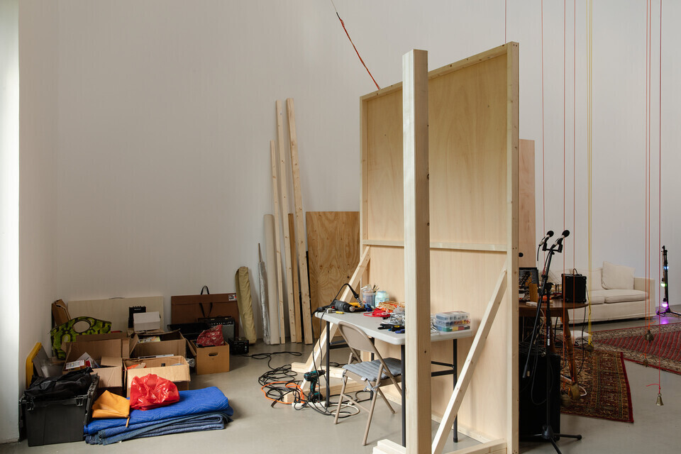 Die Künstlerin ist während der Laufzeit der Ausstellung permanent anwesend im Ausstellungsraum, macht Musik, spricht mit den Besucher_innen, arrangiert Objekte, schafft Neues, reißt es wieder ab und baut es wieder auf. Jeden Tag arbeitet sie in der Halle des Portikus als wäre es ihr Atelier. Dawn Kasper nennt dieses künstlerische Verfahren, das sie seit 2008 praktiziert, Nomadic Studio Practice. Ihre Ausstellungsräume werden dabei zu ihren Produktionsstätten: die Künstlerin eignet sich Routine und Ritual, Performance und Akt als ihr Material an. Zugleich steht sie selber im Mittelpunkt – in ihrer gegenwärtigen Anwesenheit.