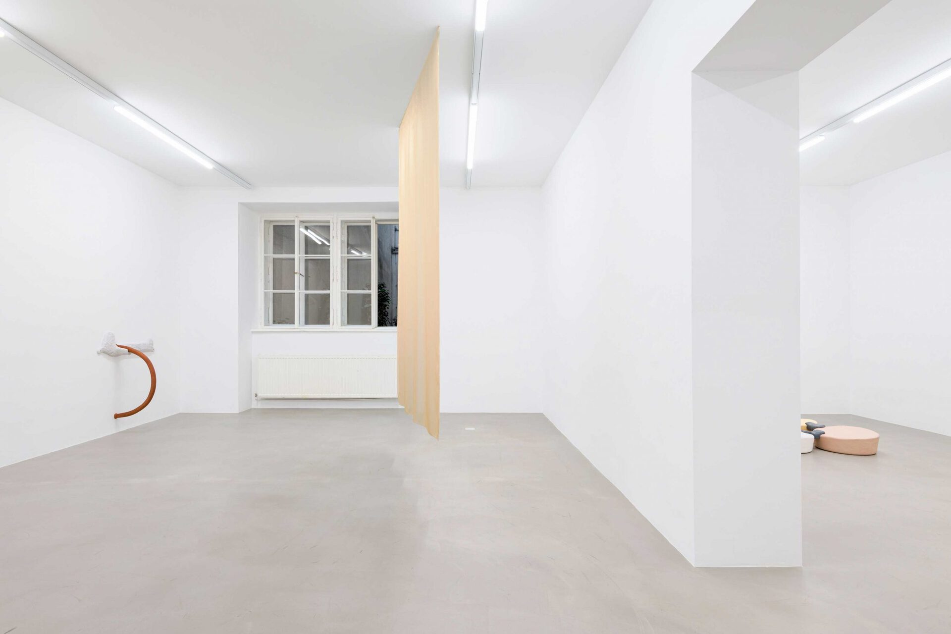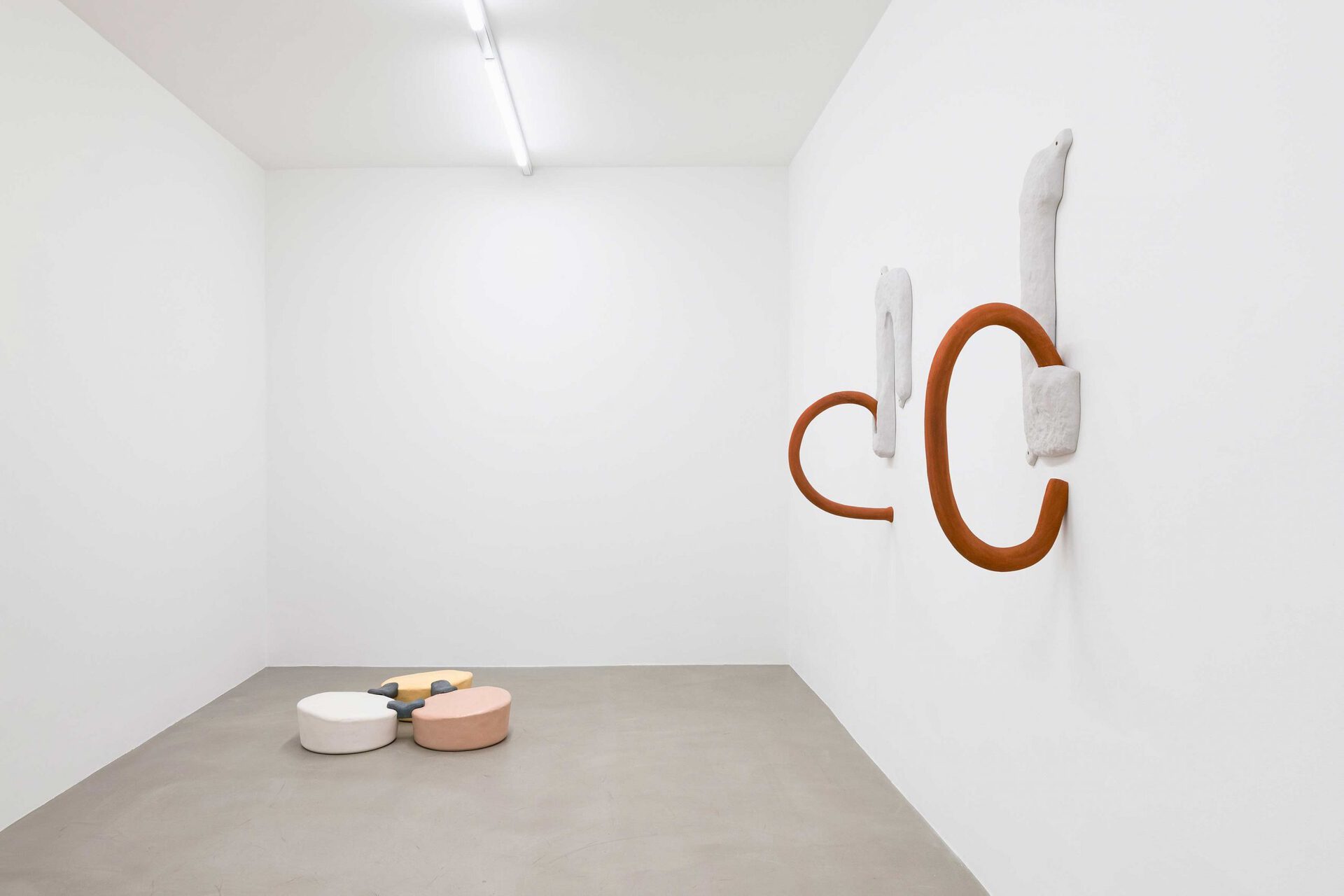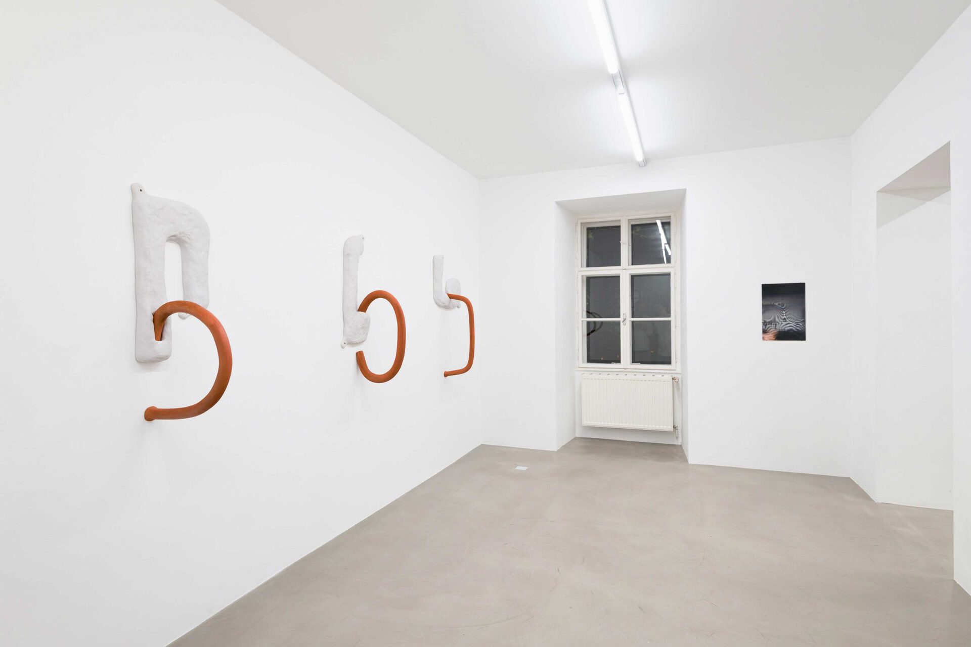 This hybrid quality between function, communication, and contemplation is exploited by Cypriot artist Phanos Kyriacou in his “Common Handles” series. But there is also a play on words in Kyriacou’s use of the handle: In computer science, a handle refers to a reference value to a system resource managed by the operating system. In addition to “Common Handles,” titles such as “Low Network” or “standingfoot021” also refer to tools and structures of that technological reality which we use every day and within which we lead ever greater parts of our lives. In a kind of language game, Kyriacou takes up concepts from our digital everyday life and transfers them in a literal way into a sculptural language, turning them into objects, as it were. The central character of this operation lies in the awkwardness of this parallel movement – its simultaneous presence as abstract concepts, only indirectly familiar to us from our experience with the diverse user interfaces of a virtual world that is intangible to us, and as concrete sculptural objects that, we can experience in an immediate spatial situation. Simultaneously, these hybrids point in one direction to a virtual user experience external to them – and in the other to their physical presence in the instantaneous situation. In this way, they make the absurdity of our hybrid living conditions, which always takes place between the immediacy of human perception and its technological-linguistical mediation, accessible to a physical-spatial experience. At the same moment, Kyriacou’s works also refer to the architectural space, play with the historicity of the materials used – for example, where the traditional material terracotta meets the contemporary material polyurethane –, and appear like ciphers of a mysterious sculptural language. In the network between the works that communicate with each other, in the successive discovery of this multiplicity of aspects and functions, a complex space of experience opens up that goes far beyond a binary idea of the hybrid.