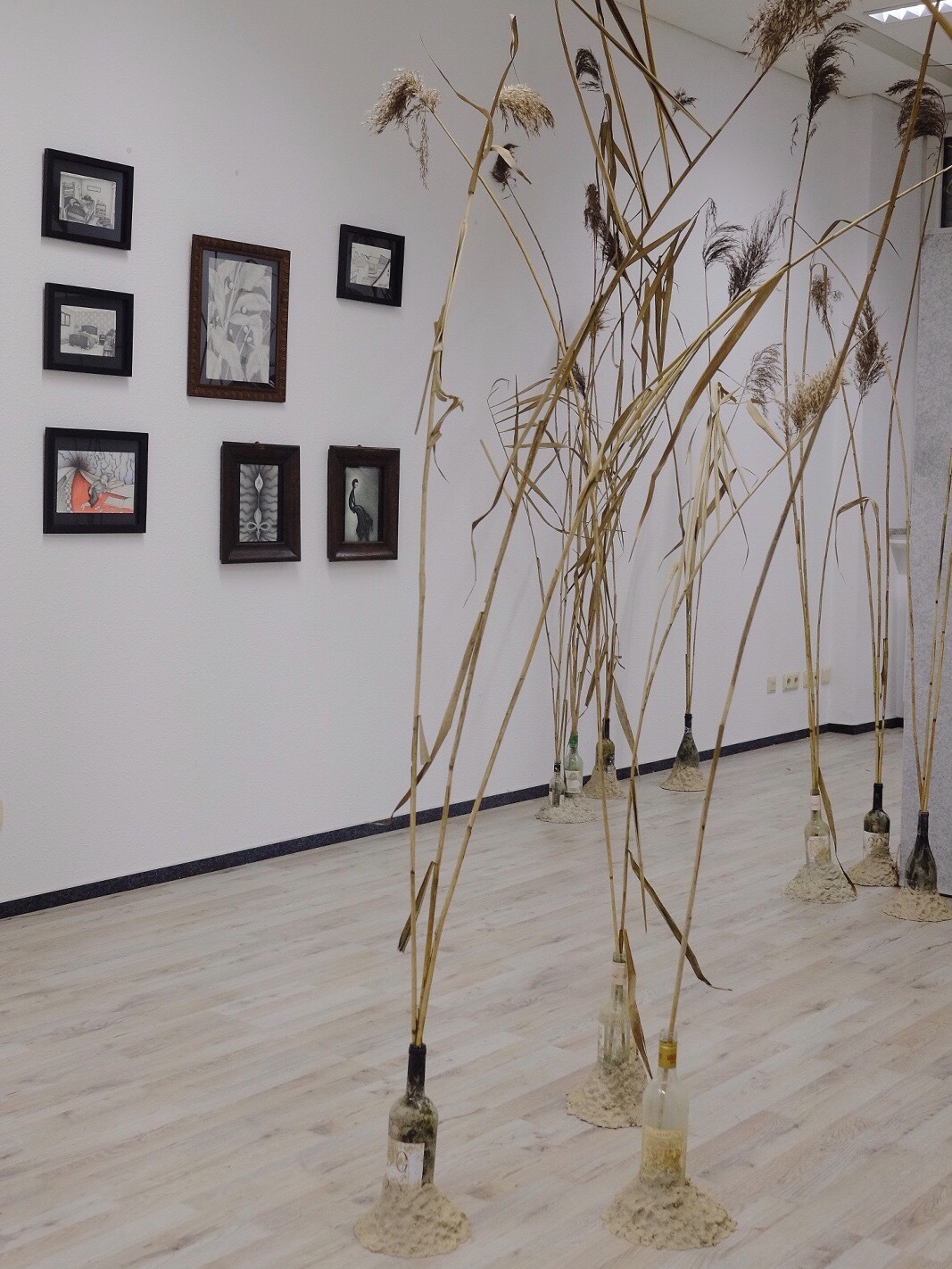 Mit ihrer begehbaren Installation, geht sie auf Tuchfühlung mit dem Widerspruch zwischen Heimat und der Fremde. Dazu verwendet sie Schilfmaterialien, die sich im Laufe der Ausstellung auch verändern dürfen.
