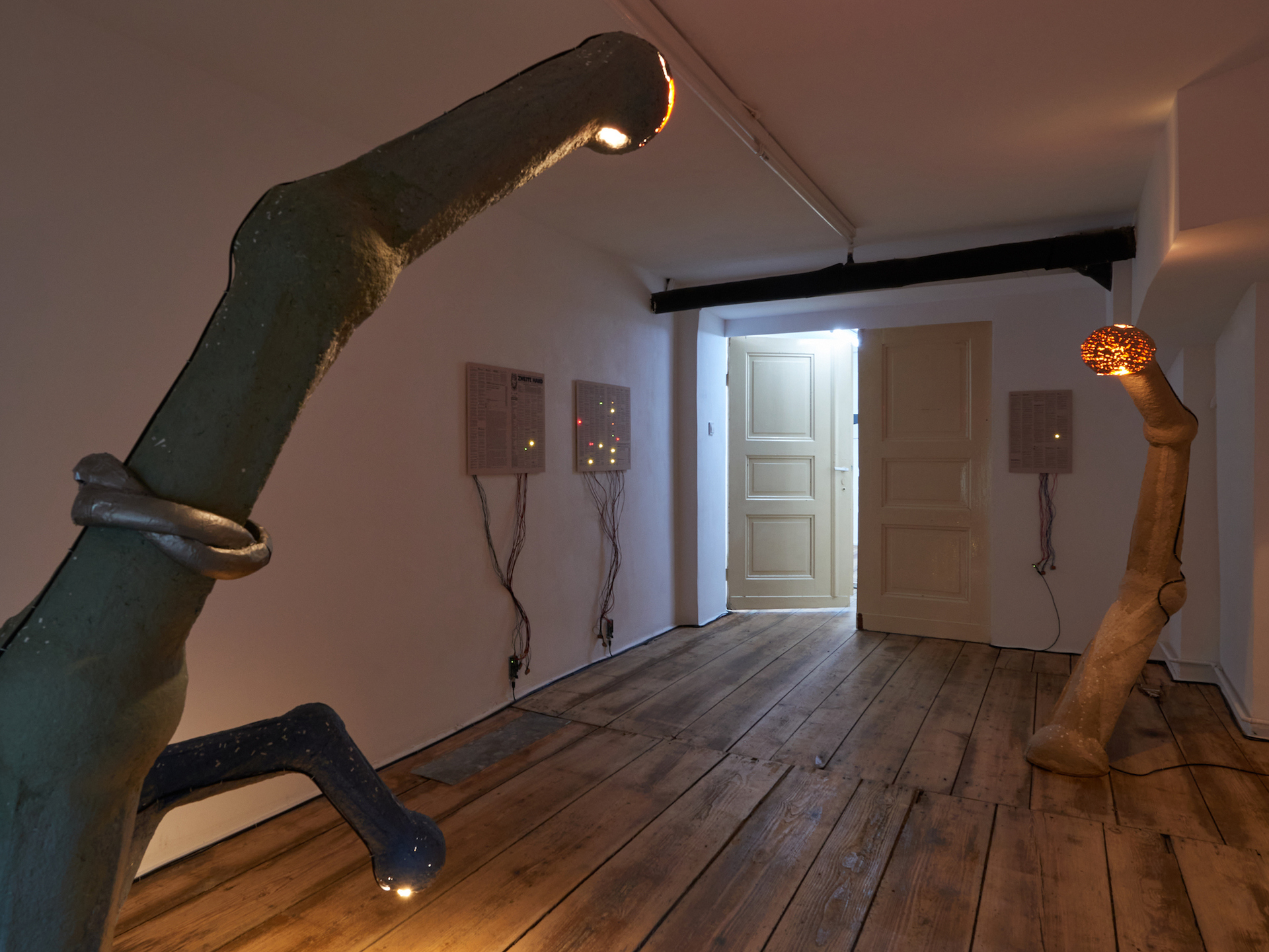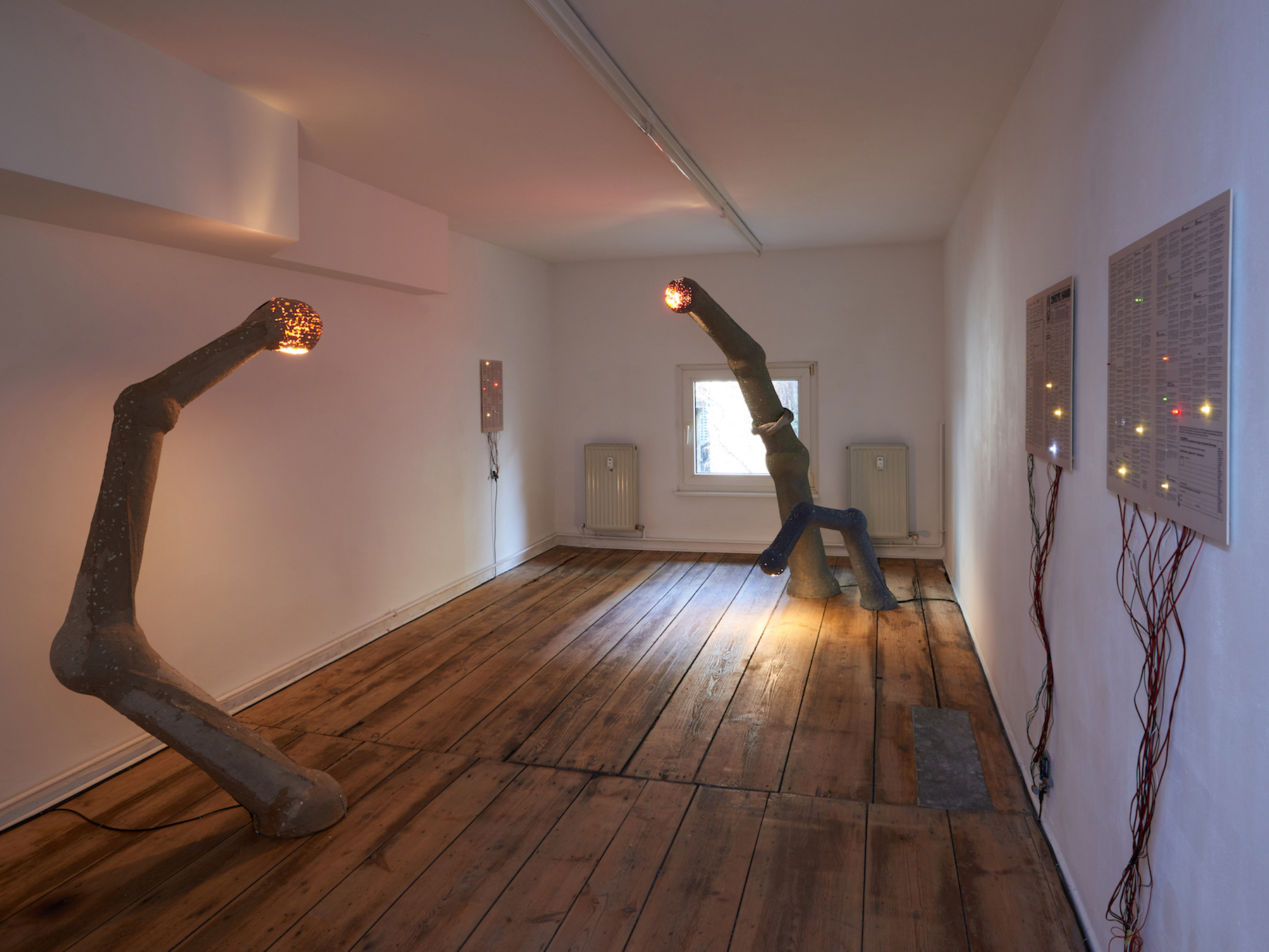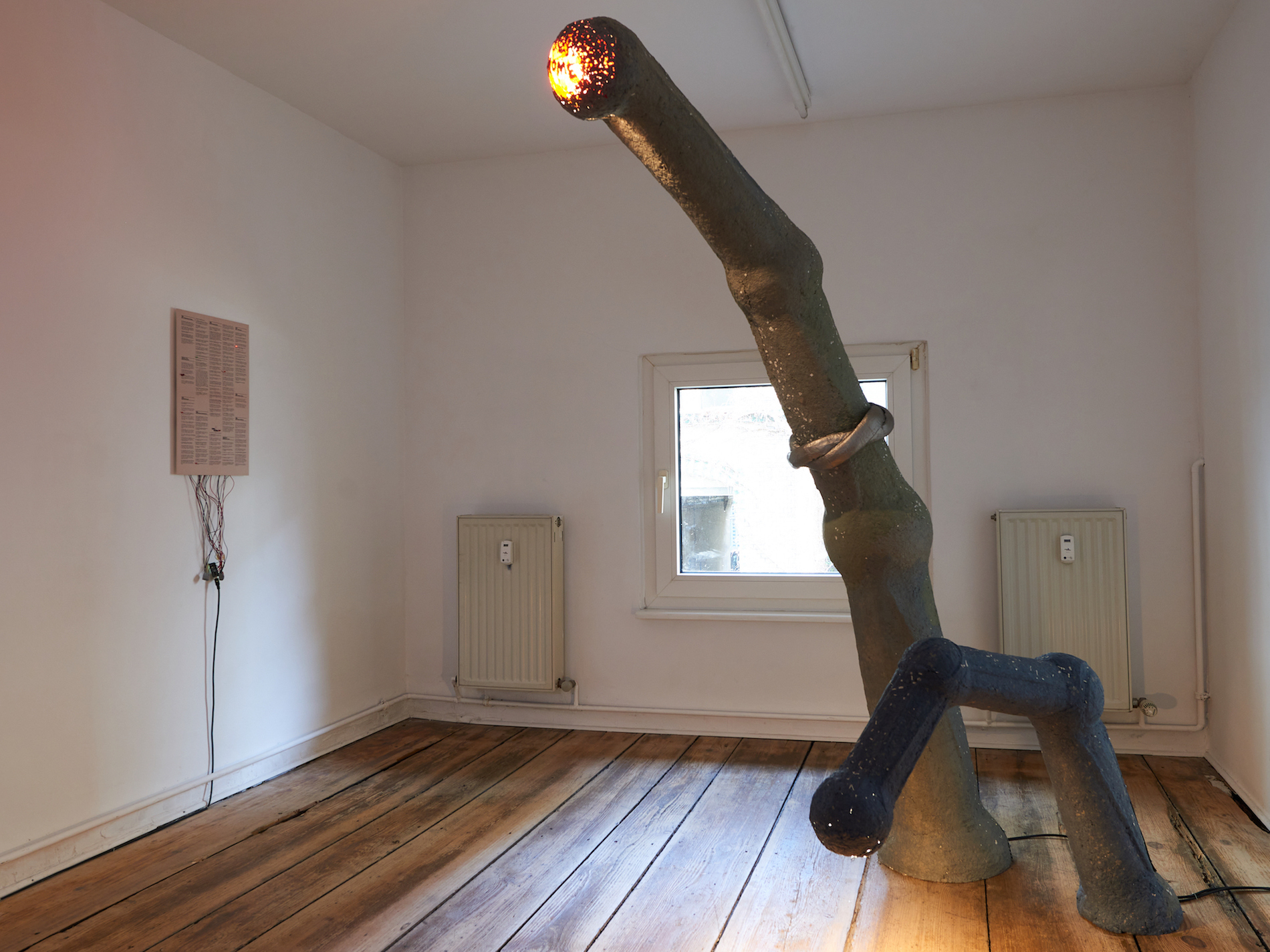 In recent works, Niclas Riepshoff has been dealing with those stages of life that biopolitics are most concerned with: reproduction, infanthood and old age. In Vitro (2019) depicted the moment of artificial fertilization, interpreting the design of the classic Wilhelm Wagenfeld lamp as a steel cannula entering the vitreous ovum, injecting LED sperm. 3 Poses for a Newborn (2018) plays with the narrative of artworks being the artist’s offspring, raising questions about queer parenthood, aesthetics of authenticity and signature styles. Absolutes Gehör (2019) consisted of a group of sculptures modelled after hearing aids and the artist playing high pitched notes on a ute while wearing prosthetic makeup that had aged him about 50 years.