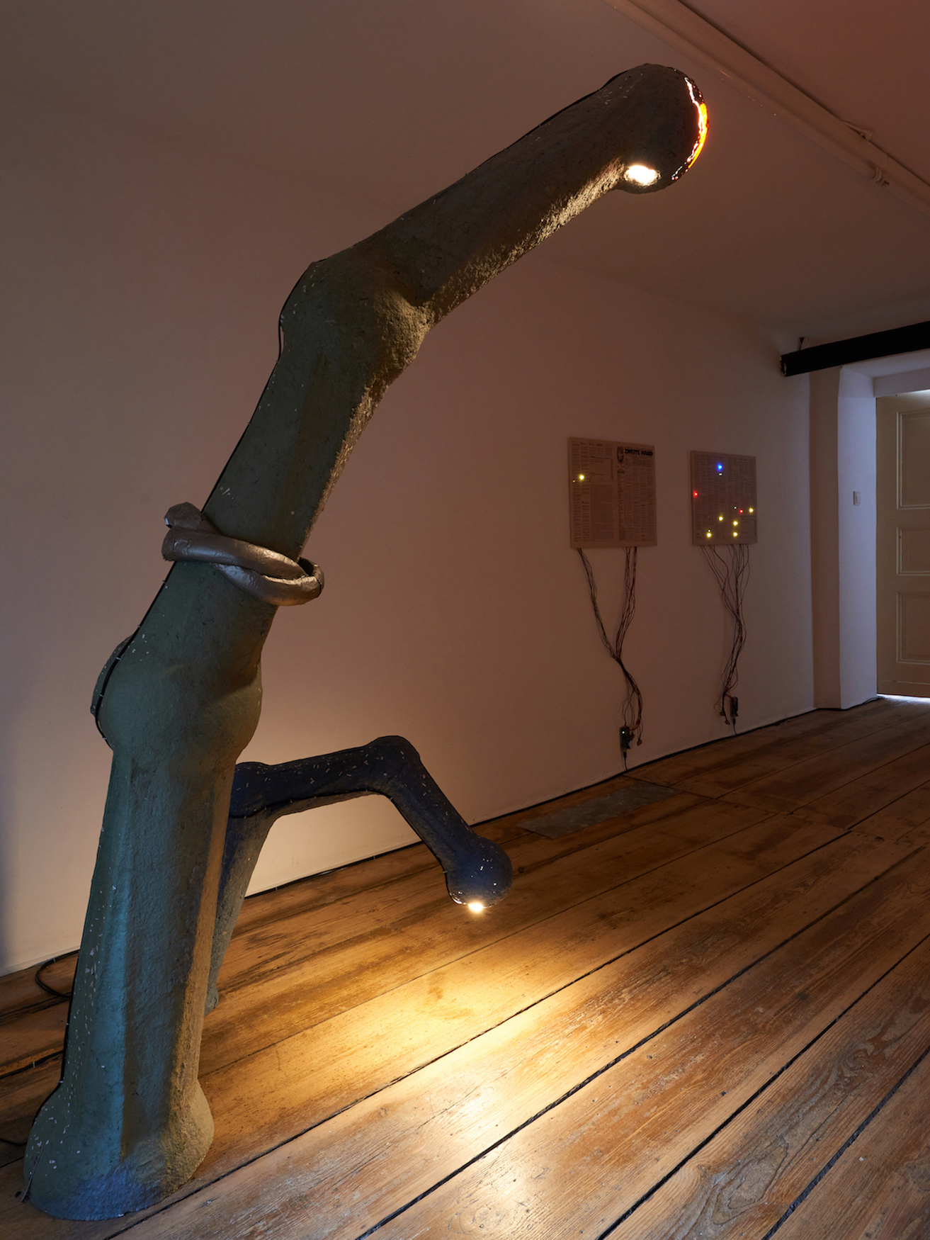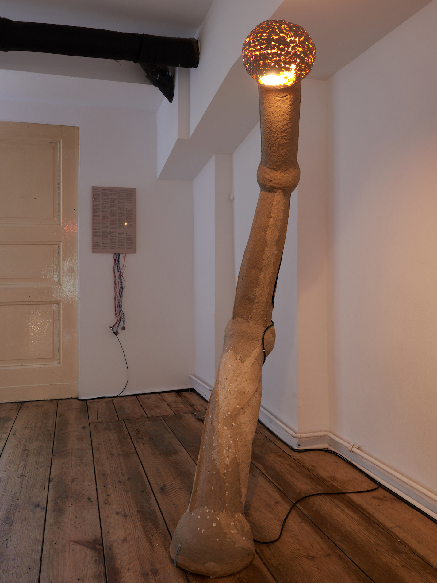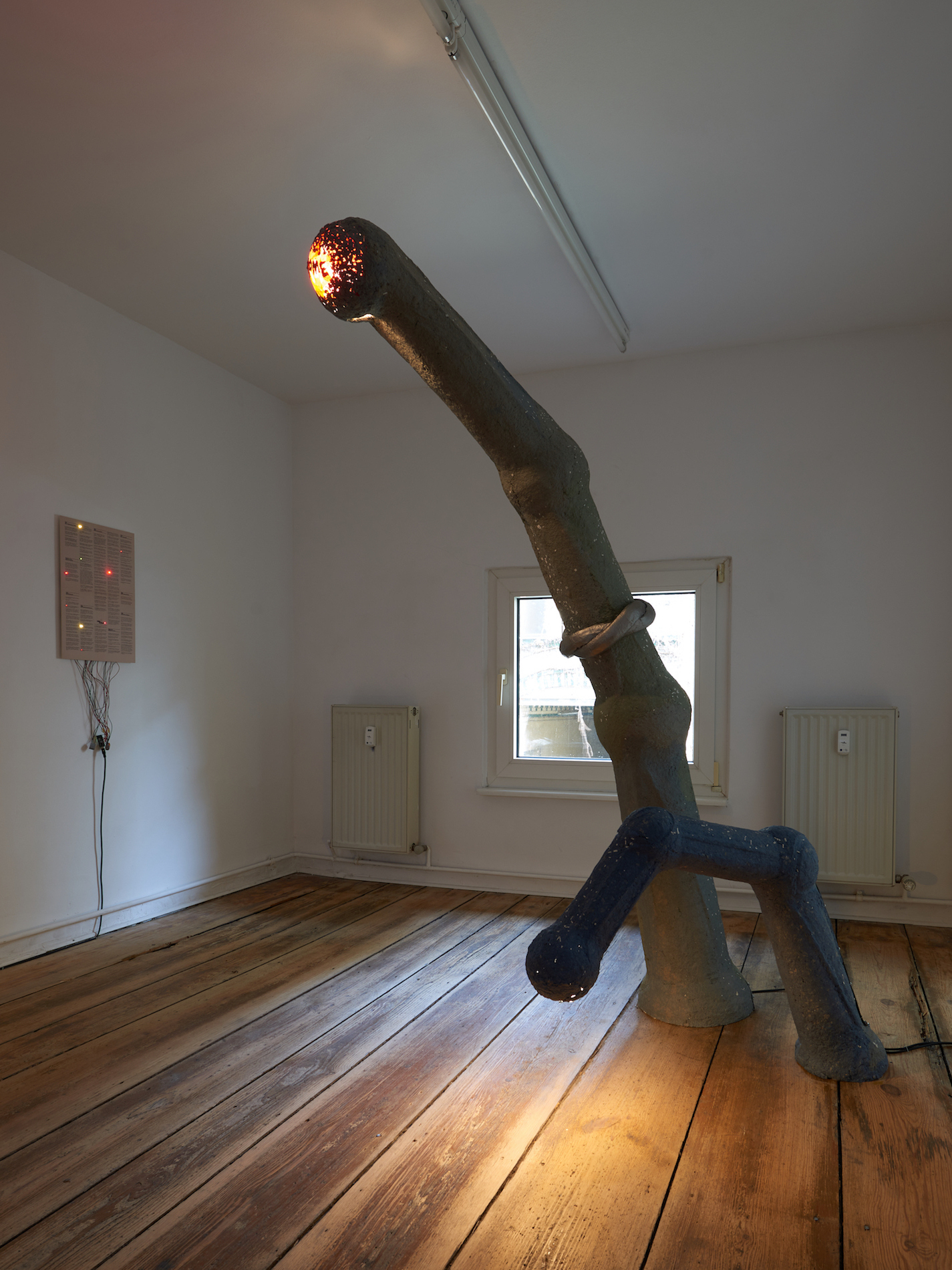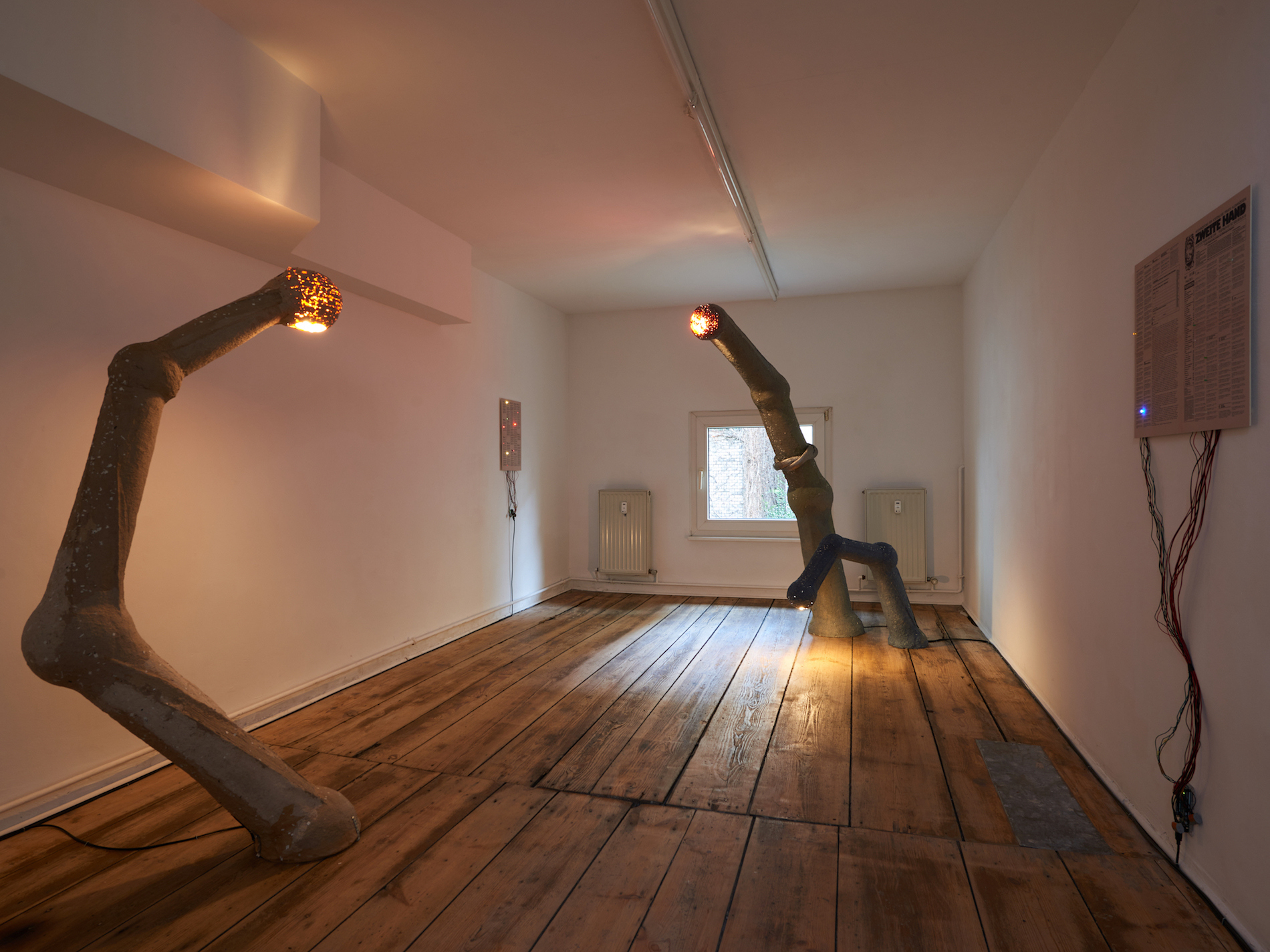 In recent works, Niclas Riepshoff has been dealing with those stages of life that biopolitics are most concerned with: reproduction, infanthood and old age. In Vitro (2019) depicted the moment of artificial fertilization, interpreting the design of the classic Wilhelm Wagenfeld lamp as a steel cannula entering the vitreous ovum, injecting LED sperm. 3 Poses for a Newborn (2018) plays with the narrative of artworks being the artist’s offspring, raising questions about queer parenthood, aesthetics of authenticity and signature styles. Absolutes Gehör (2019) consisted of a group of sculptures modelled after hearing aids and the artist playing high pitched notes on a ute while wearing prosthetic makeup that had aged him about 50 years.