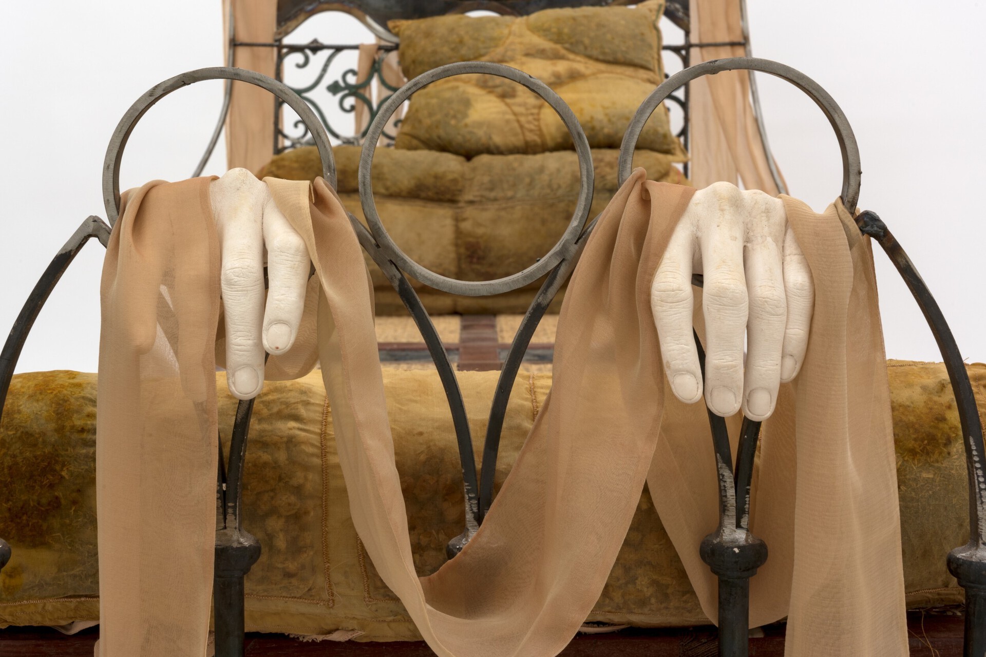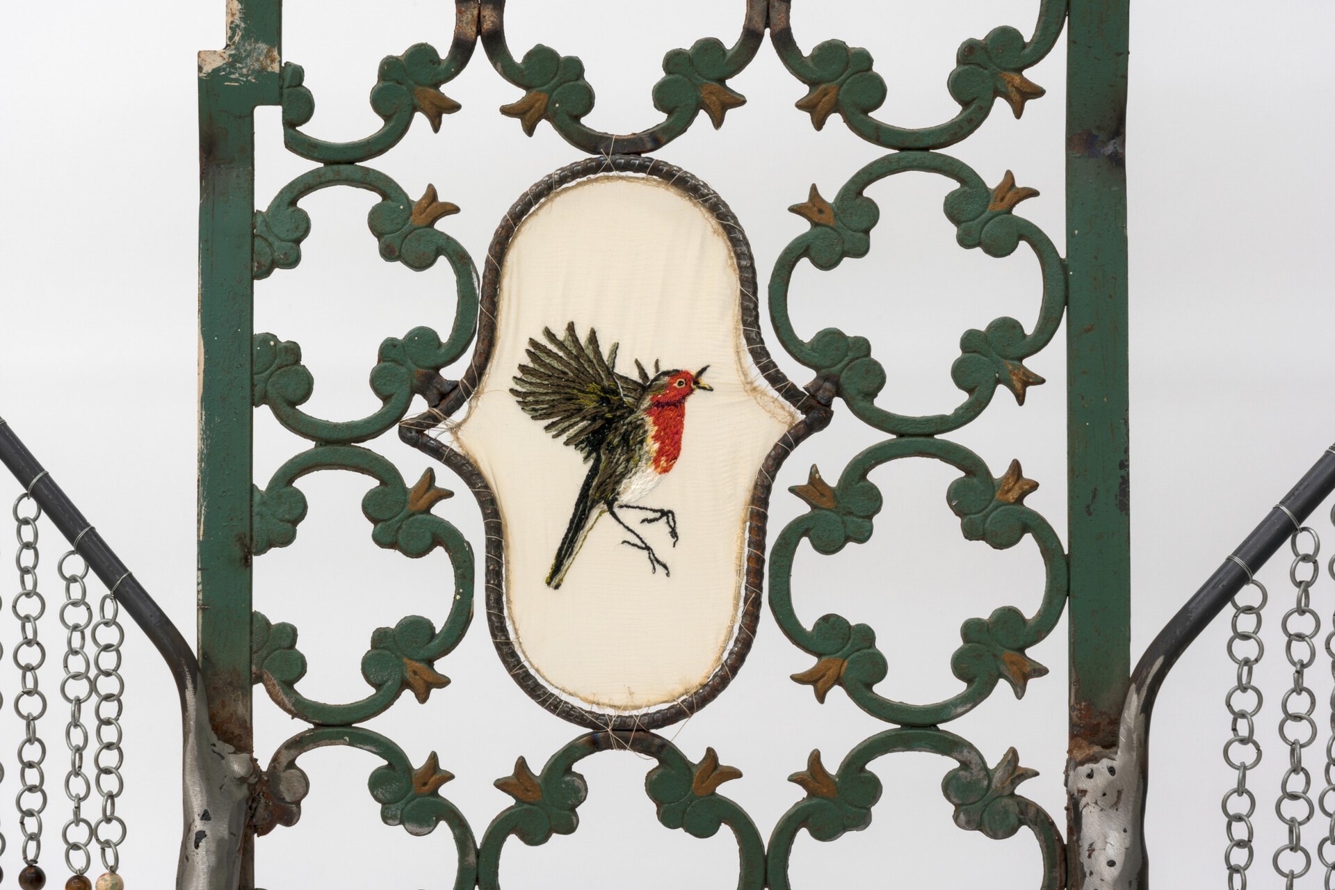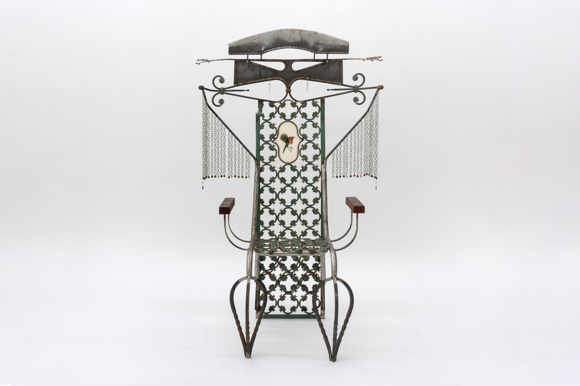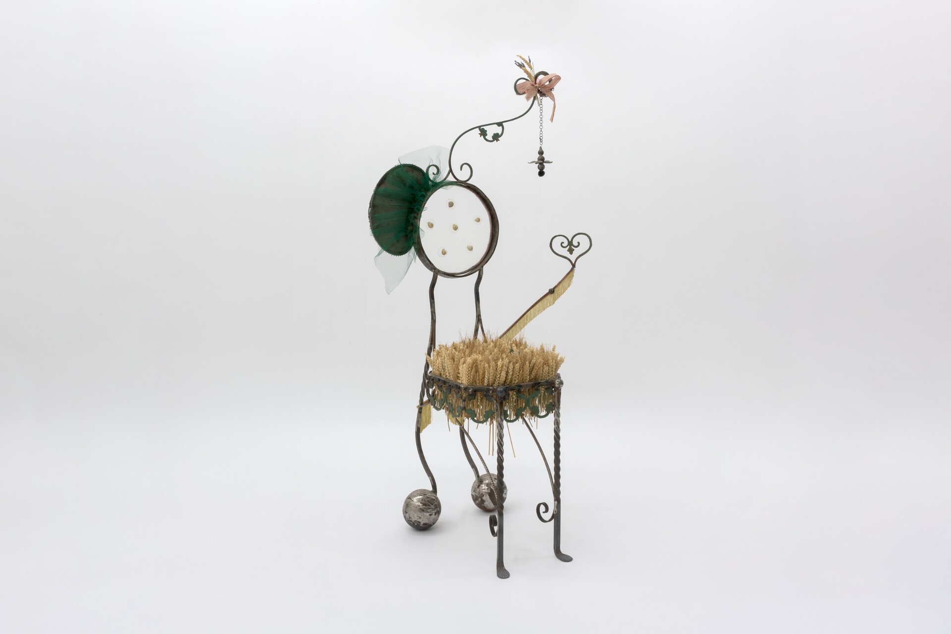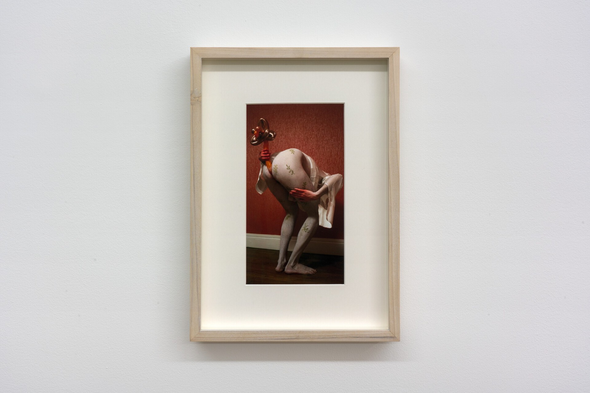 Catabase, from the Greek Katabasis, refers to a journey downward, the equivalent in English to a descent such as the sinking of the sun or crossing into the underworld. The display on the ground floor centres around an alchemical table orbited by peculiar chairs, like three priestesses attending a seance. One features a seat of hay from which a zombified hand emerges, as if to grasp the harvest before being fully devoured by the earth. The back of the chair is delicately embroidered with snail shells gathered by the artist from the beach in Ostend, Belgium on the summer solstice – spiritually charged with the energy of the sun. Beneath the plexiglass tabletop are 64 mirrors embellished using acid and silver, which represent the 64 hexagrams from the I Ching, or Book of Change, the ancient Chinese cosmological text. A series of small-scale photographs on the wall make the room an eerie boudoir. Featuring balloon flowers and bright body paint, they are more camp and disturbing than erotic or pornographic – a failed attempt at a magic trick.