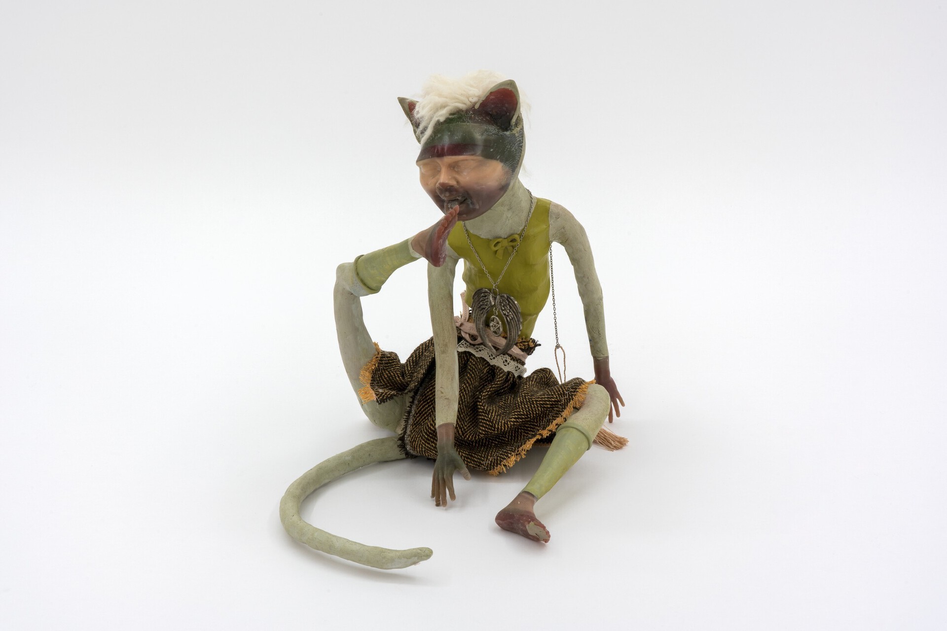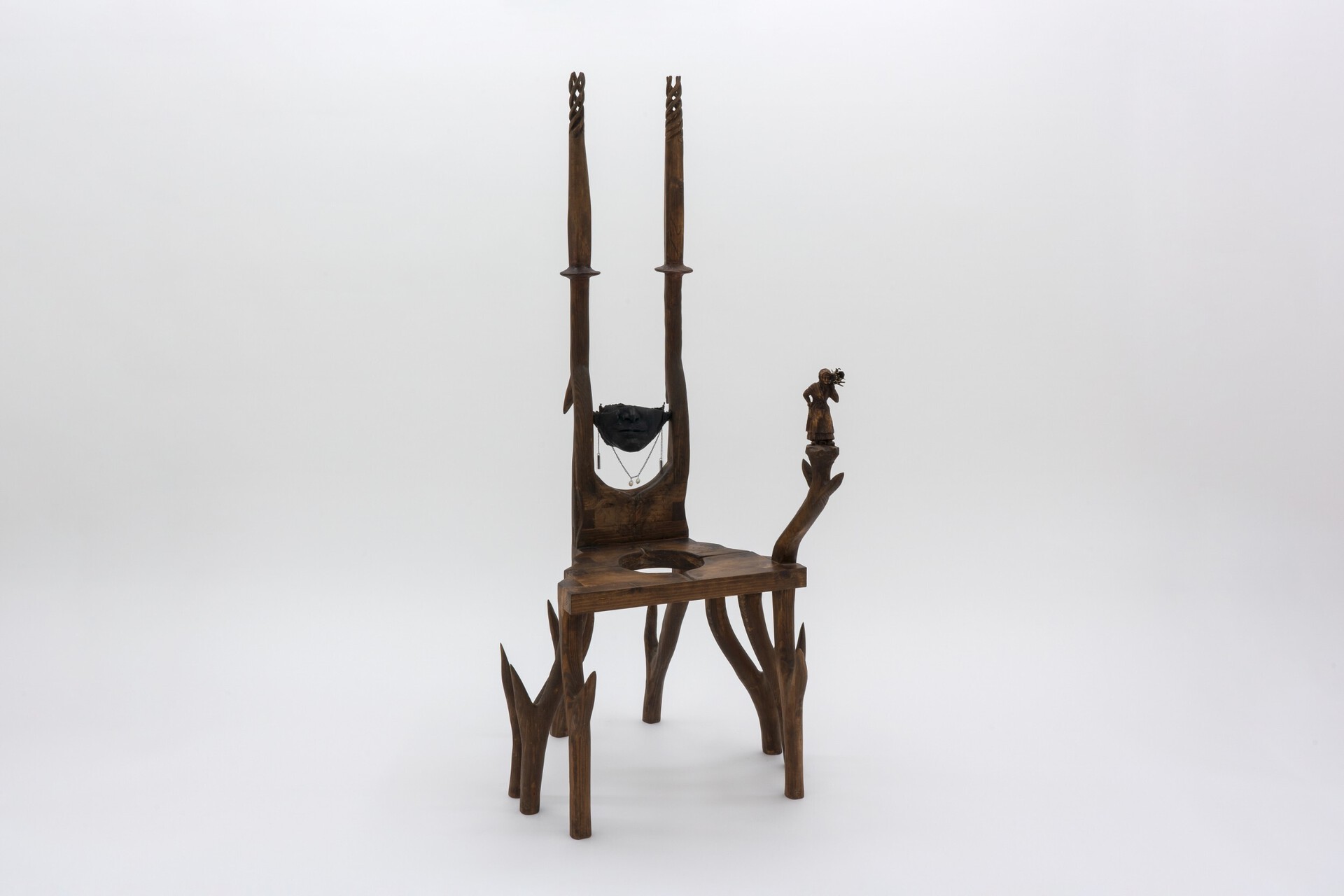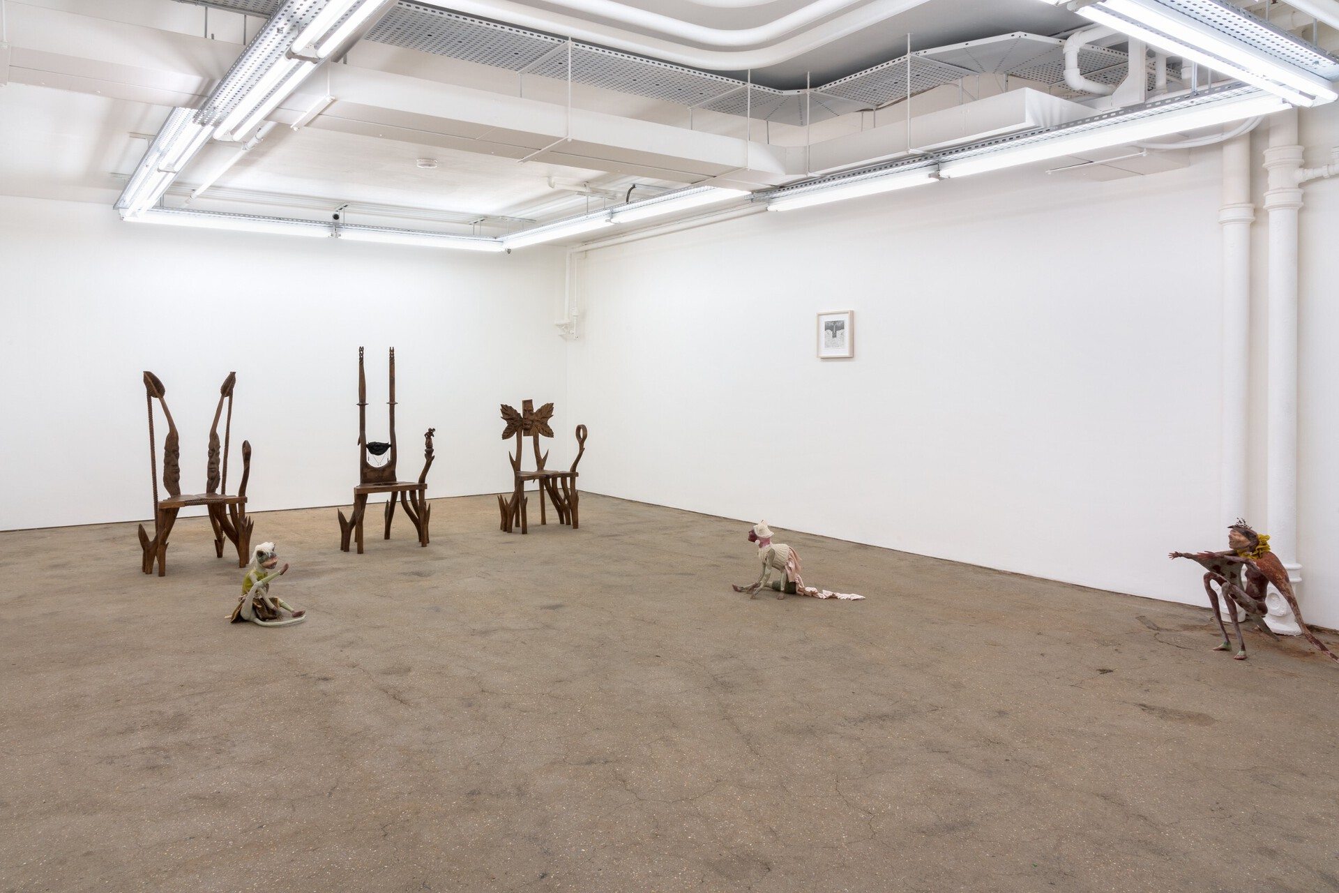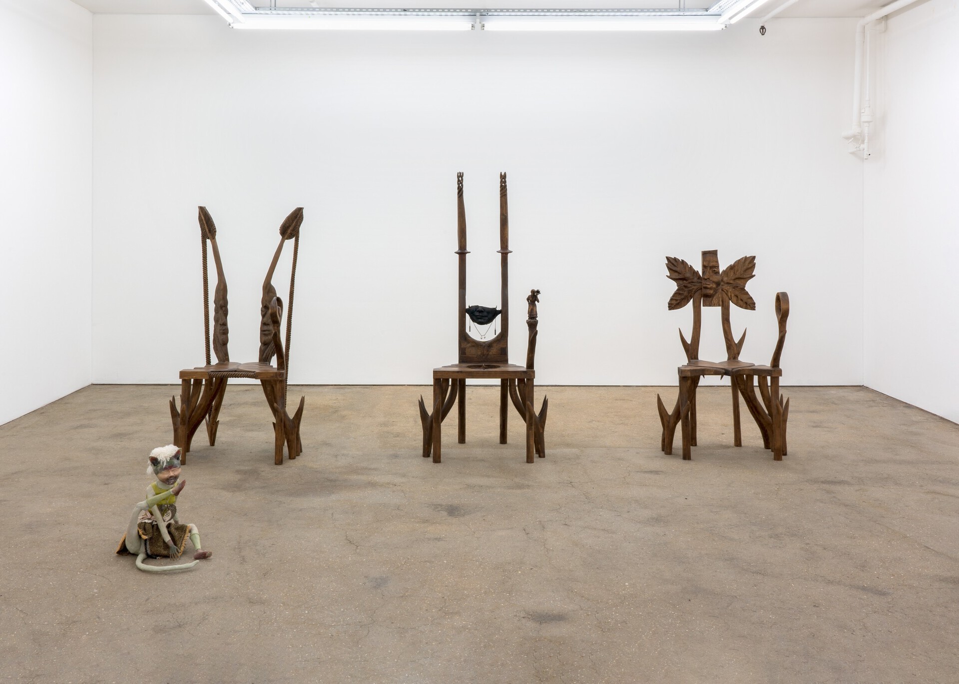 In the basement, three carved wooden chairs inspired by furniture designer Carlo Bugatti stand tall. Positioned horizontally they appear like thrones and personify the three Greek goddesses of the moon, Selene, Artemis and Hecate. Nearby are three sculptures of small cats dressed in clothes that are simultaneously cute and demonic – like haunted familiars. The artist describes the rebellious nature of cats, who have managed to remain semi-feral even after thousands of years of living alongside humans. Also on view are two drawings of the brain and nervous system, stripped from the rest of the body and floating in outer space on a wooden panel. These organisms appear fragile and alien, sad and alone without a body to surround them – desperate to disentangle themselves from the material world.