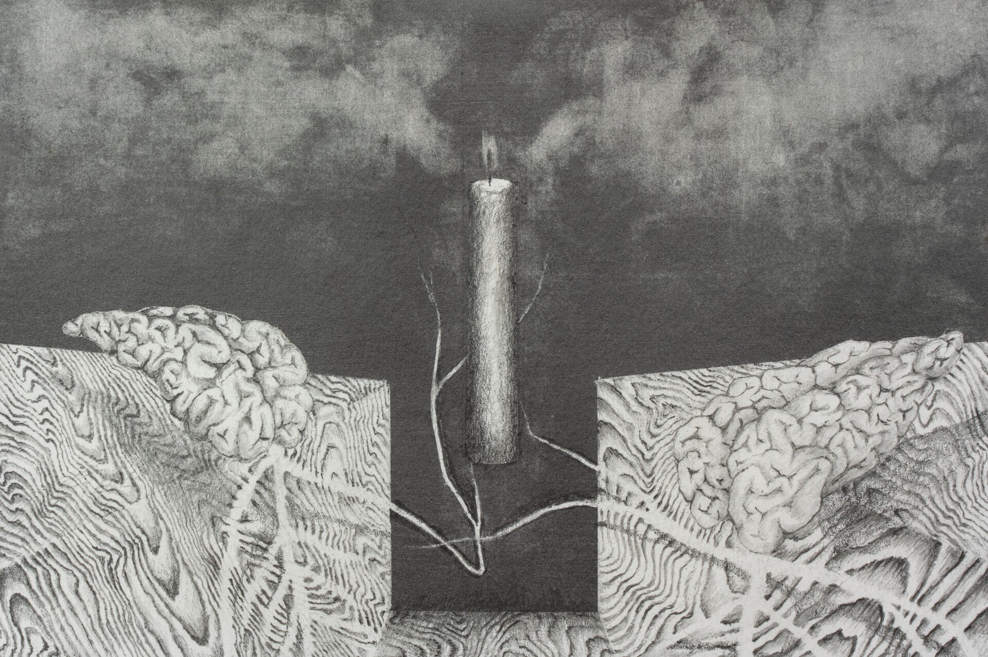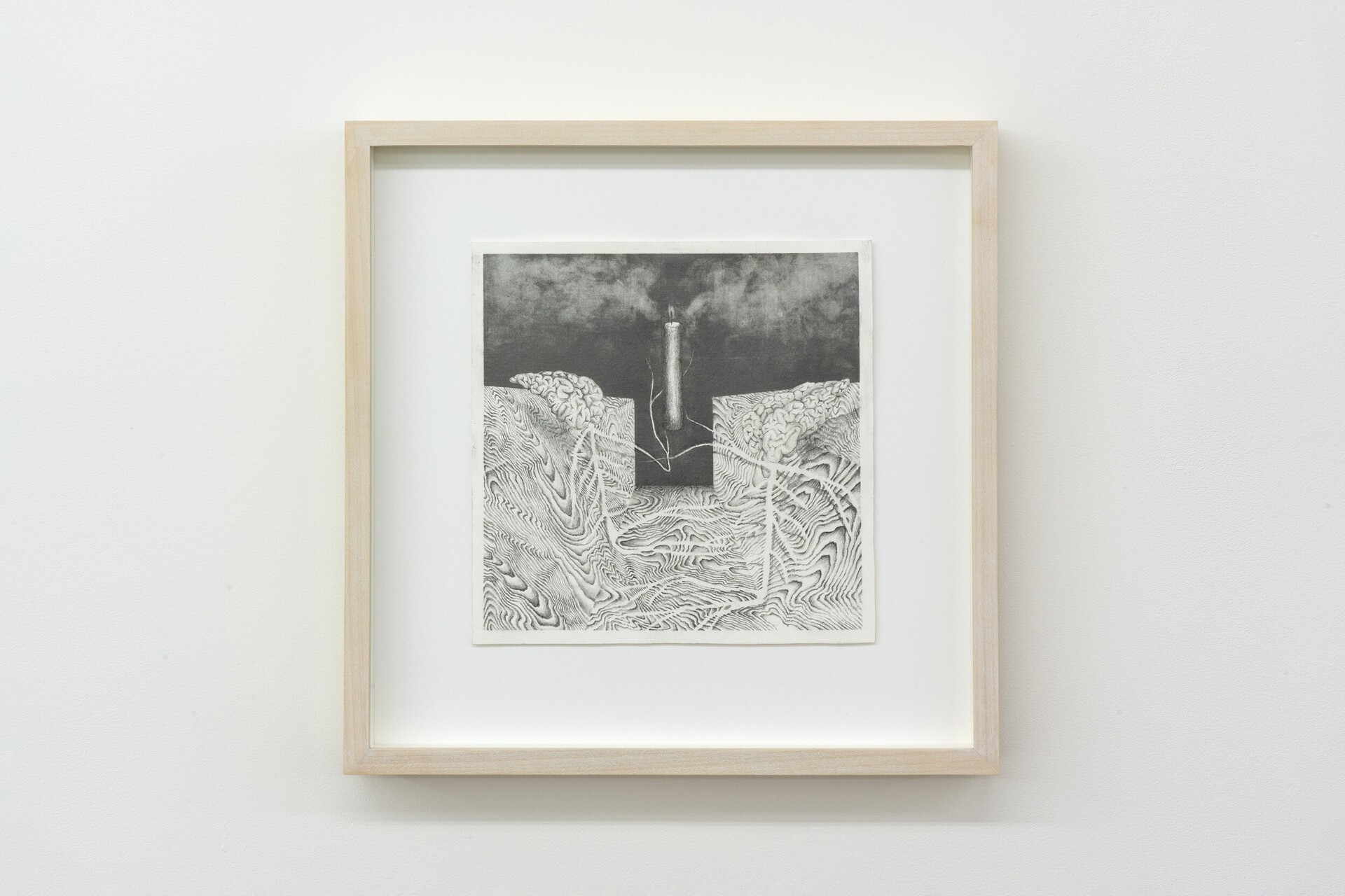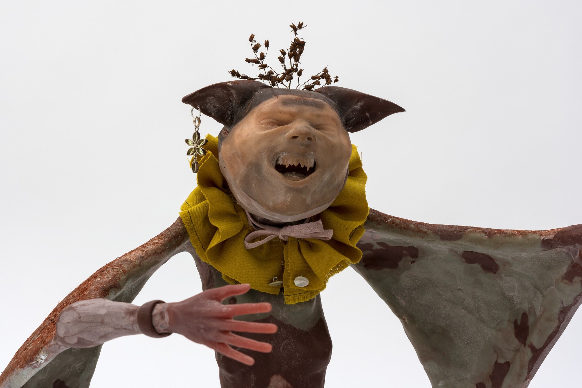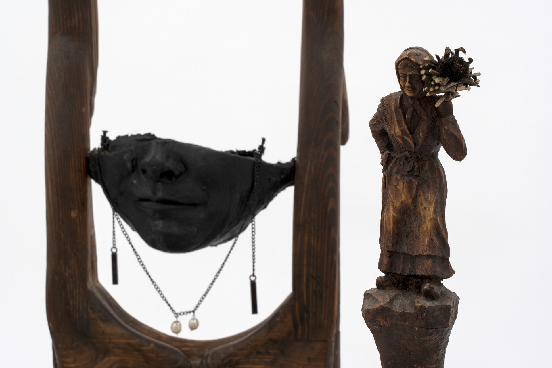 In the basement, three carved wooden chairs inspired by furniture designer Carlo Bugatti stand tall. Positioned horizontally they appear like thrones and personify the three Greek goddesses of the moon, Selene, Artemis and Hecate. Nearby are three sculptures of small cats dressed in clothes that are simultaneously cute and demonic – like haunted familiars. The artist describes the rebellious nature of cats, who have managed to remain semi-feral even after thousands of years of living alongside humans. Also on view are two drawings of the brain and nervous system, stripped from the rest of the body and floating in outer space on a wooden panel. These organisms appear fragile and alien, sad and alone without a body to surround them – desperate to disentangle themselves from the material world.