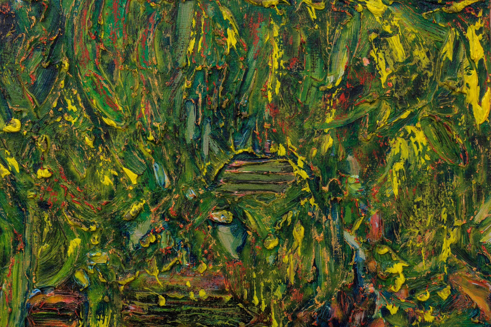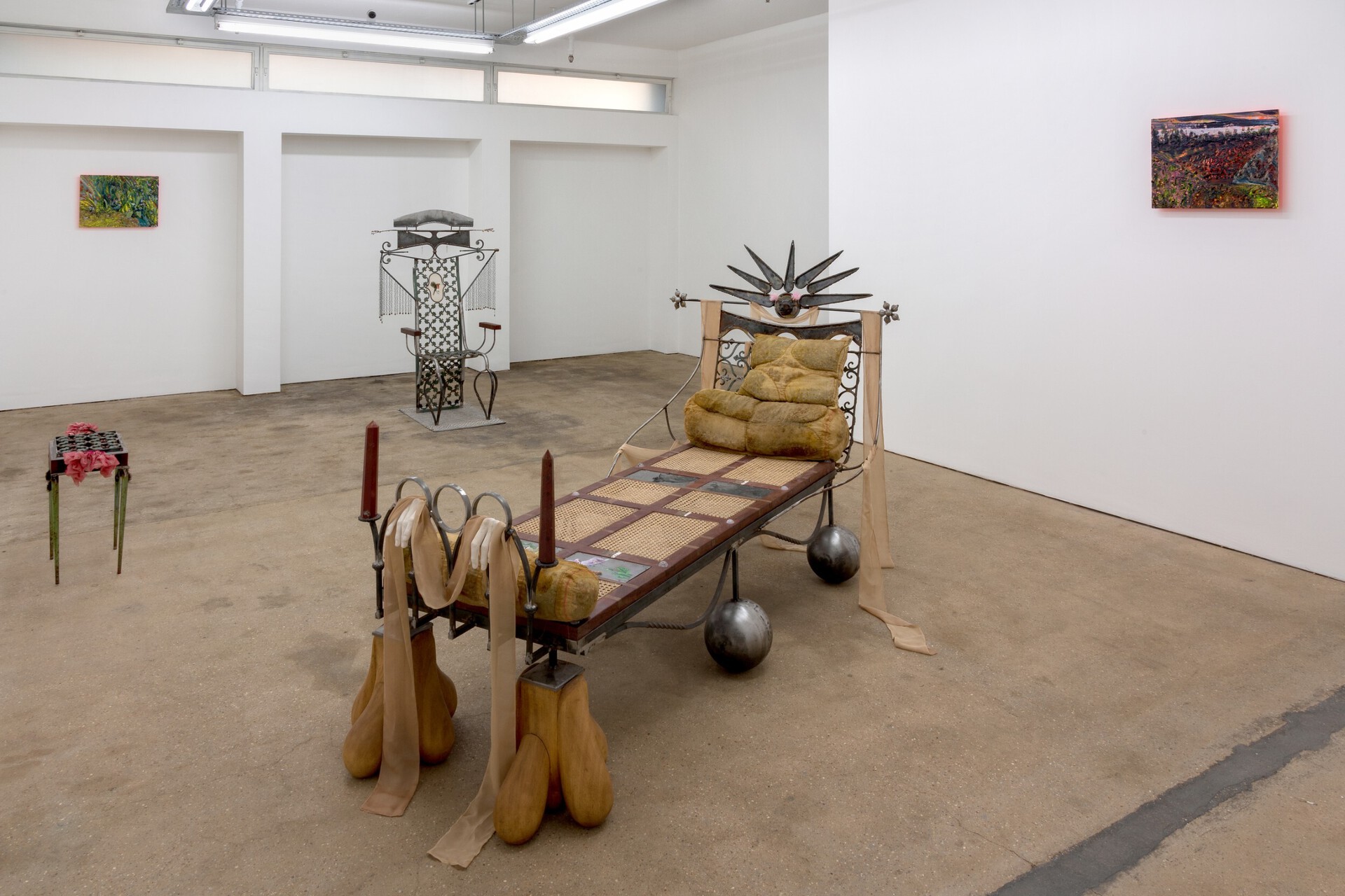 The ensemble of furniture on the first floor includes a semi-figurative daybed based on Heliogabalus, the Roman emperor whose reign was steeped in religious controversy and sexual scandal. He is known for bringing a Syrian sun cult to Rome, which is said to have involved priests conducting frenzied, ritualistic ceremonies where men castrated themselves while in a collective trance. In this room are also three paintings by the artist’s friend Marieke Bernard-Berkel. Alix-Tabeling is attached to the idea of kinship in his practice, and the addition of these beloved works brings a salon-quality to the space. These are hypnotic, yet the idealised landscapes are disturbed by the meandrous, textured paintwork. The pieces reflect on trauma and death, and they seem to exist in a state of flux – the bright colours turn into a grey mud from which new visions emerge. They function almost as a warning: the most beautiful scenery may transform into a memento of sadness.