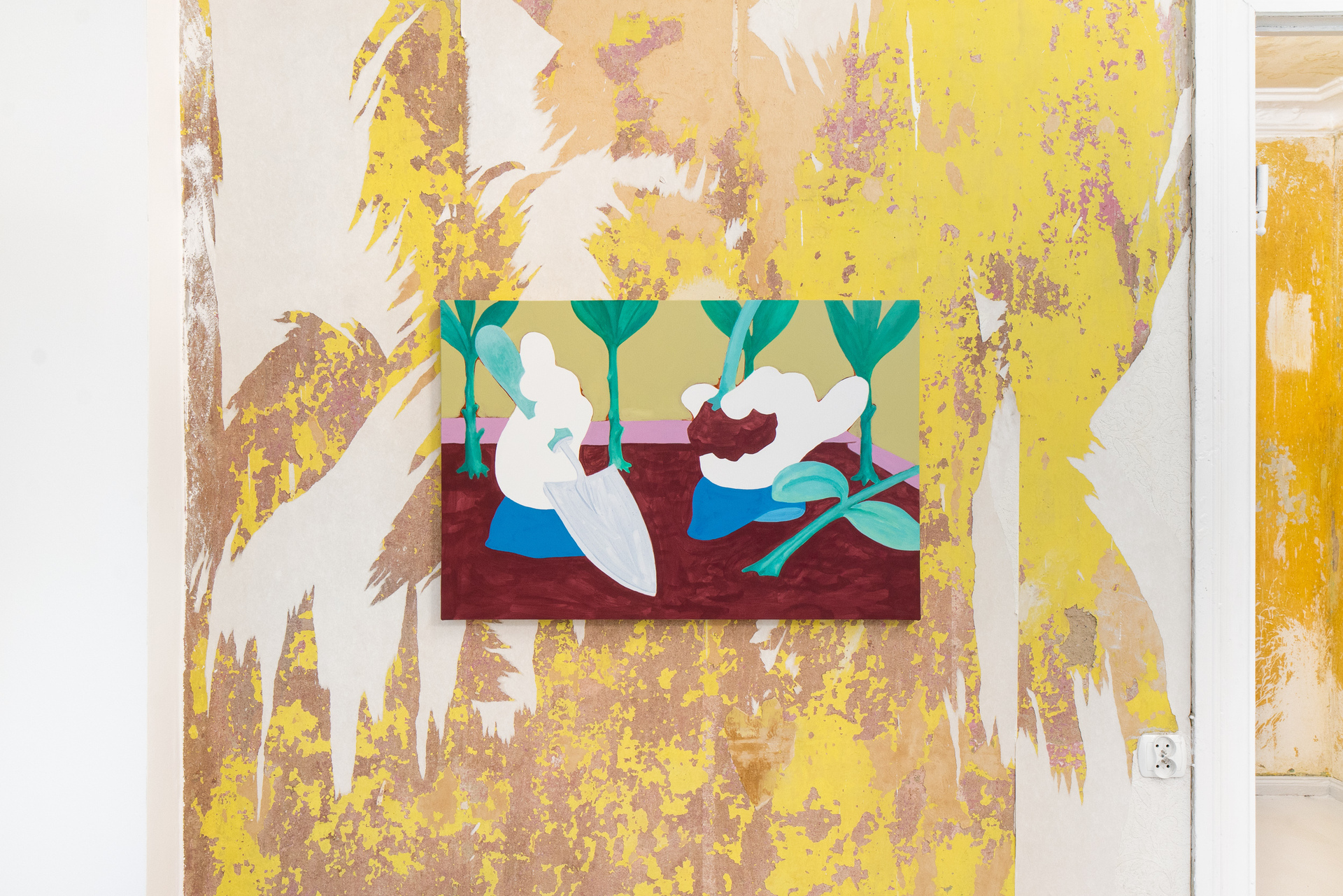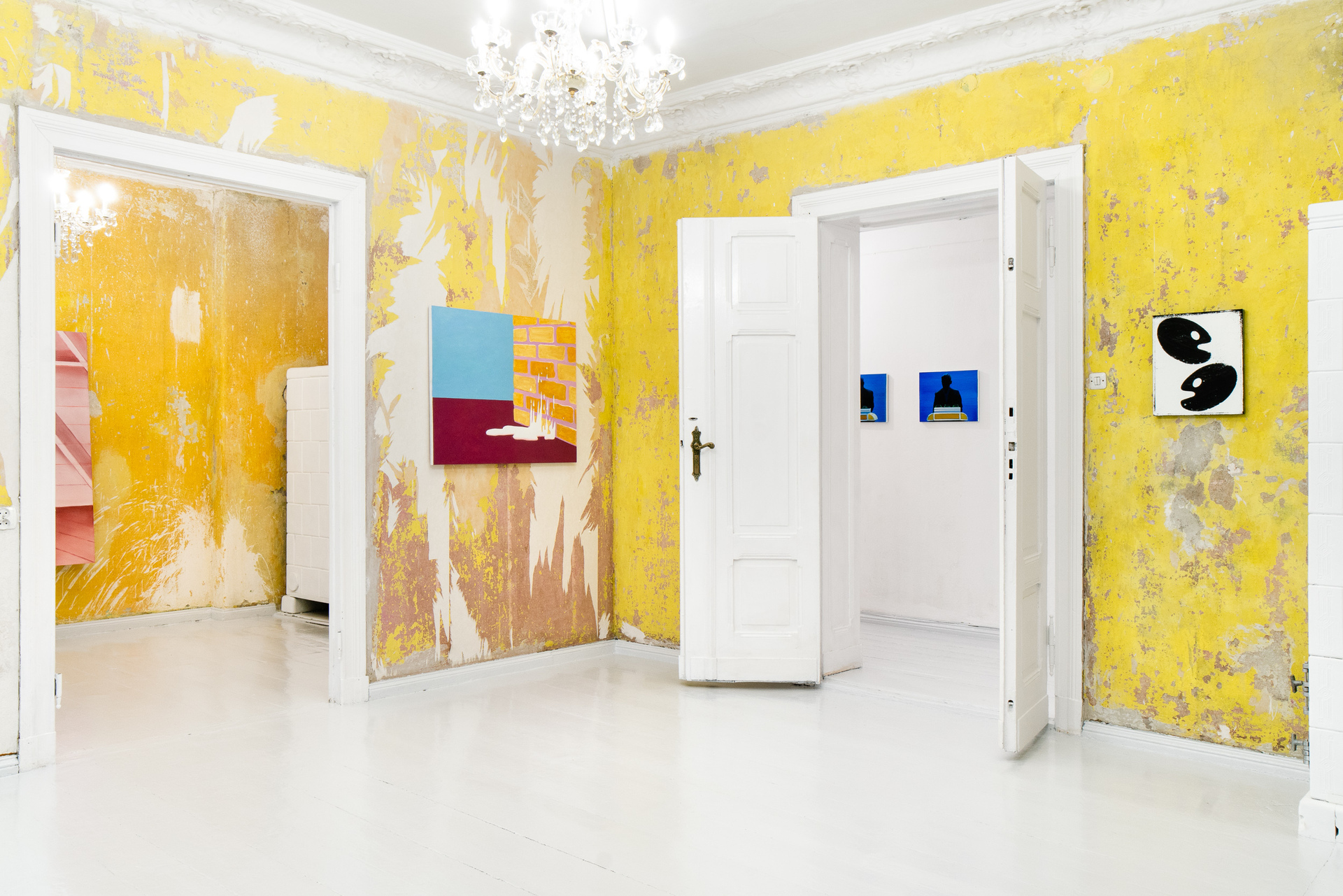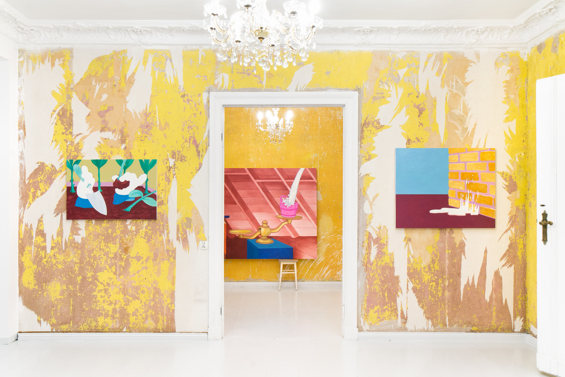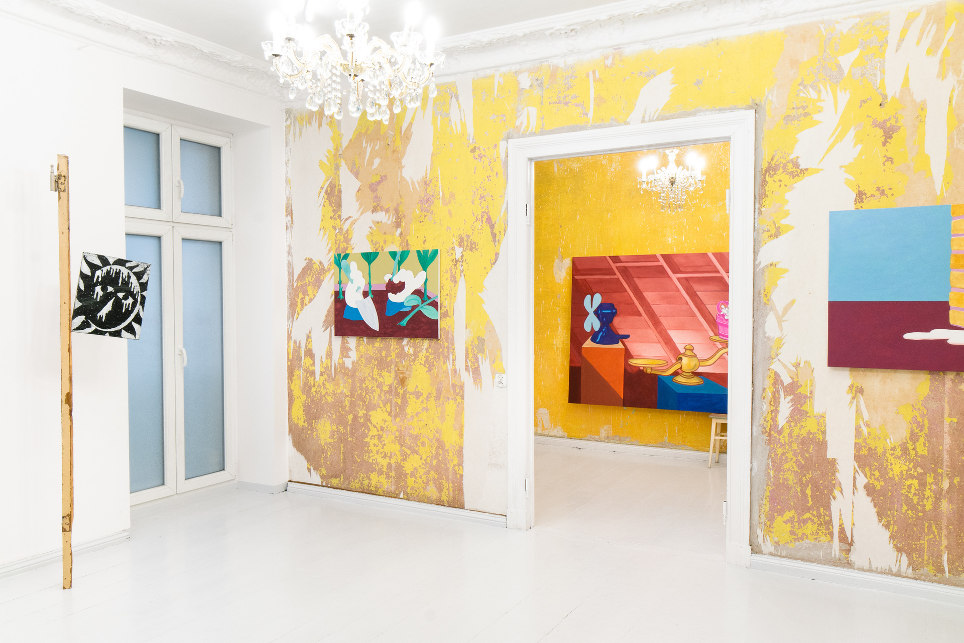 „Not those eyes anymore” is the first duo exhibition at Pani Domu – an artist-run gallery located in Poznan, Poland. The exhibition presents paintings by Mateusz Piestrak and Krzysztof Mętel that were created in response to the passing of an elderly co-tenant. The artworks refer to the past of the historic apartment, as well as to the personal stories collected by the artists over the years of their daily residence in this place. In a selected set of works, the artists reflect on the boundaries between memory and imagination and find symbolic or fantastic meanings in everyday objects.