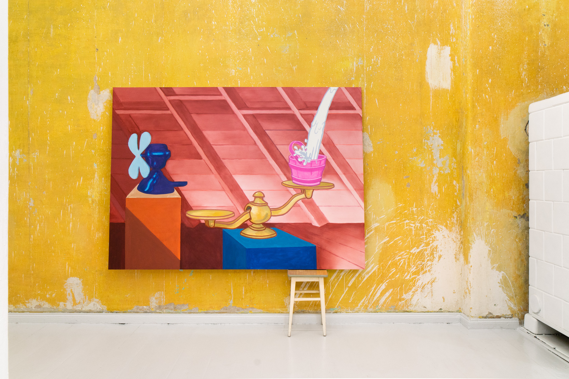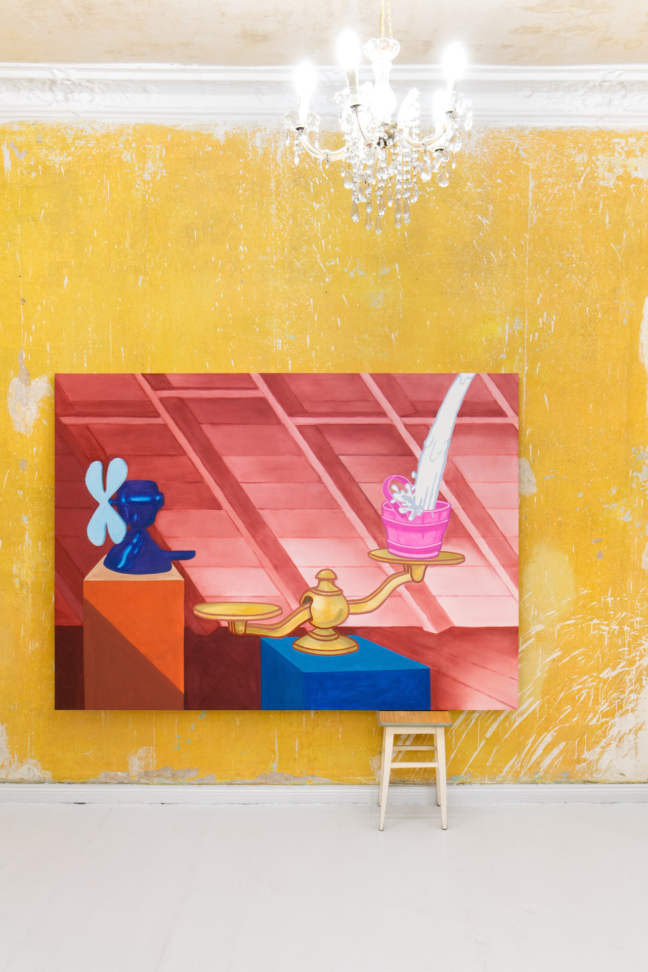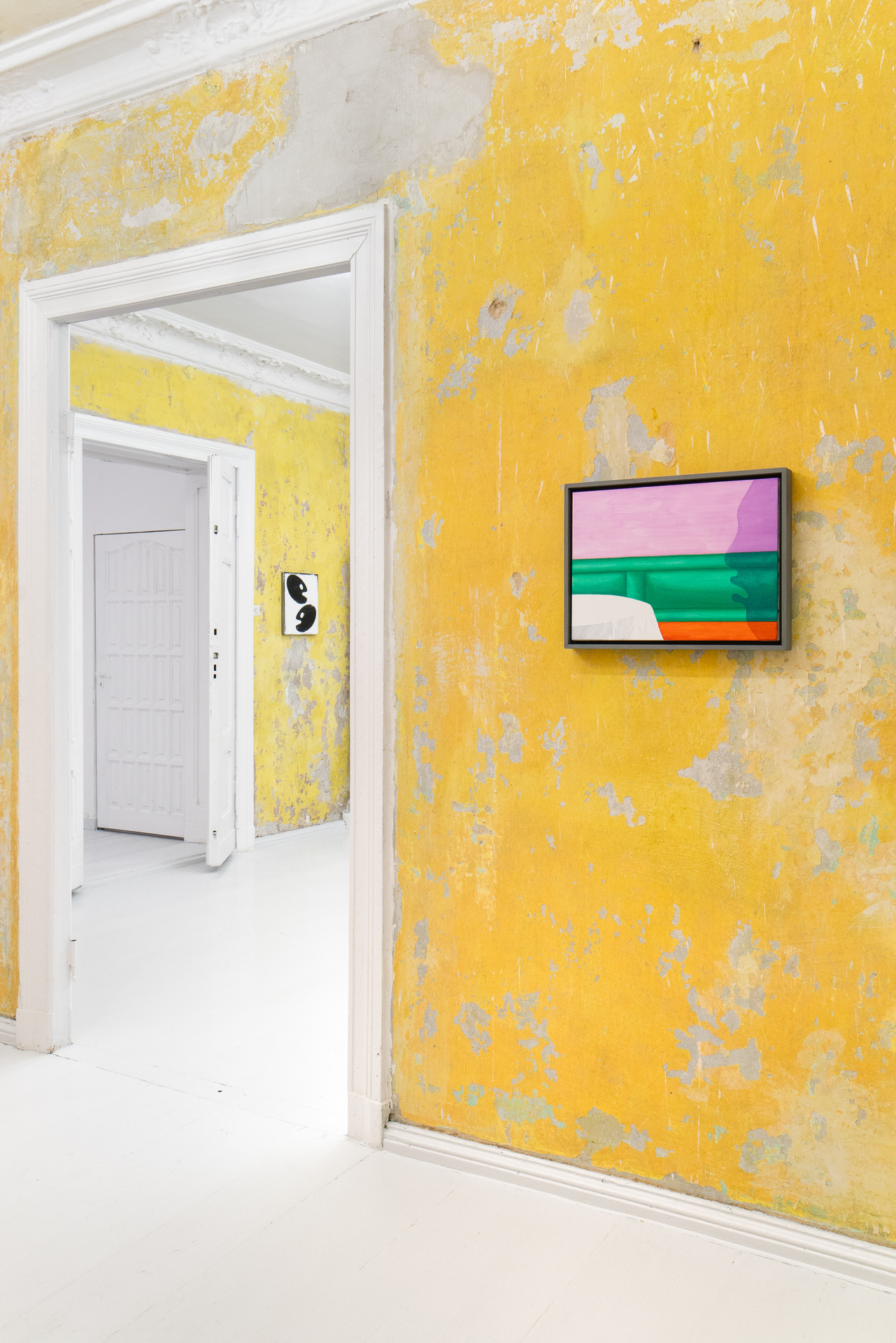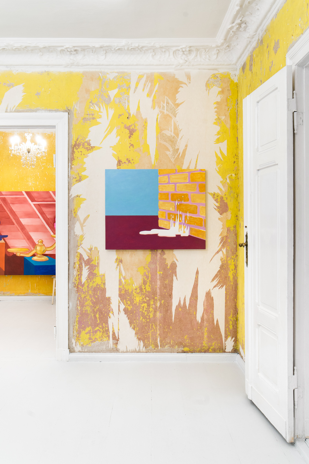 „Not those eyes anymore” is the first duo exhibition at Pani Domu – an artist-run gallery located in Poznan, Poland. The exhibition presents paintings by Mateusz Piestrak and Krzysztof Mętel that were created in response to the passing of an elderly co-tenant. The artworks refer to the past of the historic apartment, as well as to the personal stories collected by the artists over the years of their daily residence in this place. In a selected set of works, the artists reflect on the boundaries between memory and imagination and find symbolic or fantastic meanings in everyday objects.