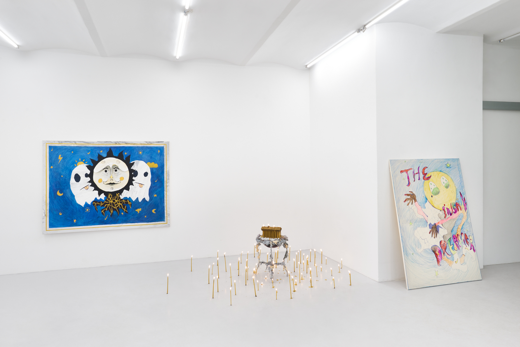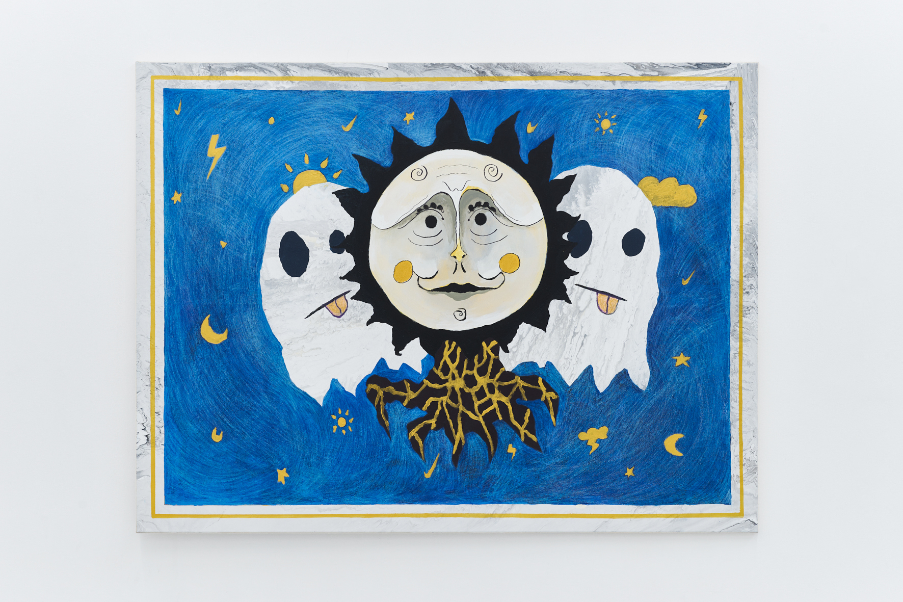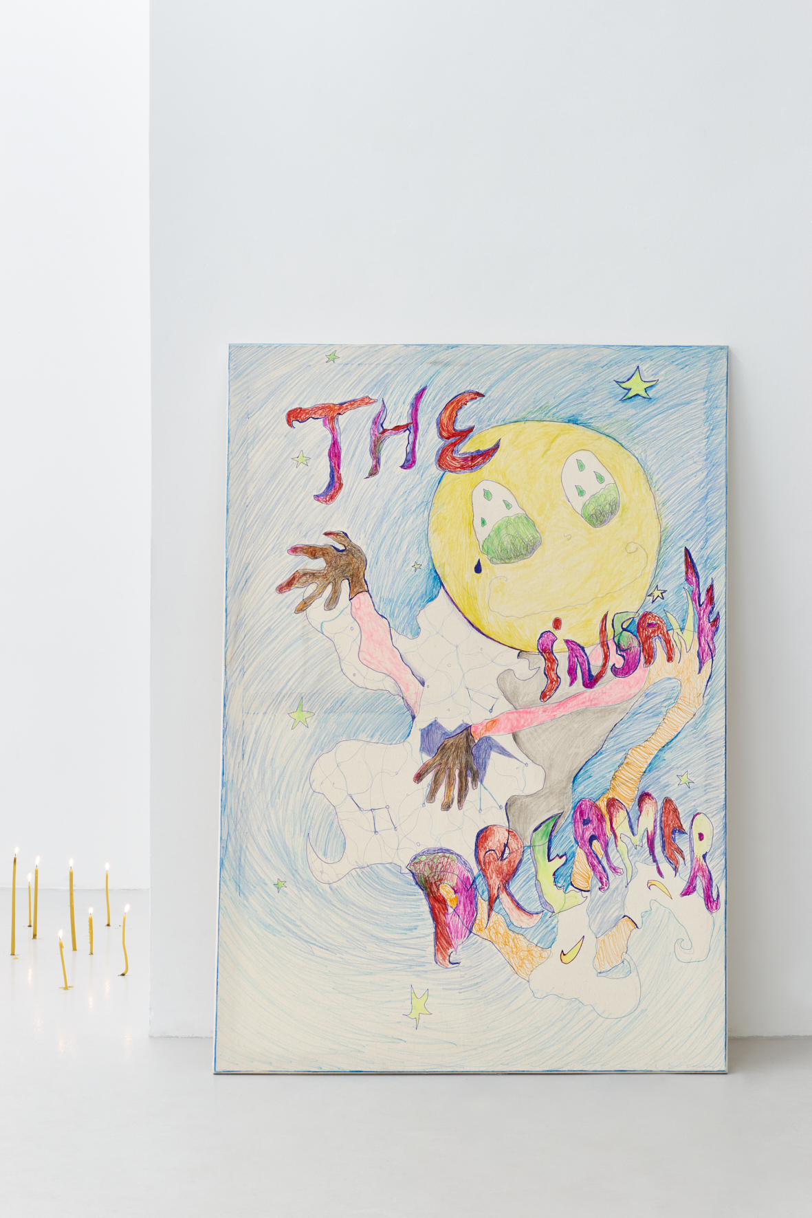 Watching the exhibition, we experience the disintegration of the planet, although the landscape shown is not quite a brutal, pre-apocalyptic vision of the world. Øleg&Kaśka, thus, create a funny, cartoon character of a dazed boy whose bulging eyes gaze up at the night sky (Astral Prayer, object, 2019). For them, astral elements are a symbol of blind faith. As the artists say: “Being dreamers, we search for hope in the stars.” It is somewhat illusory and disturbingly reminiscent of the passivity of the main characters of The Dreamers (dir. Bernardo Bertolucci, 2003), whose isolation (through complicated, sex-based relations) from the French strikes in May 1968, ultimately, still ends in a clash with the protest reality. In the case of Ashes to Ashes, the artists resort to cosmology. When the nearby Noteć River dries up, they look for answers in stories, dreams, and the proverbial stars. They resemble the naive Little Prince on LSD (The Insane Dreamer, painting, 2019). Similarly to Saint-Exupéry’s protagonist, they seek/find a solution to their problem on other planets. And so, Øleg&Kaśka are on the run – above all, from the cataclysm which is already happening (the manifestations of the ecological catastrophe, which includes the pandemic of the coronavirus decimating mankind). The message of the duo is important: current small apocalypses are too big for visual art.