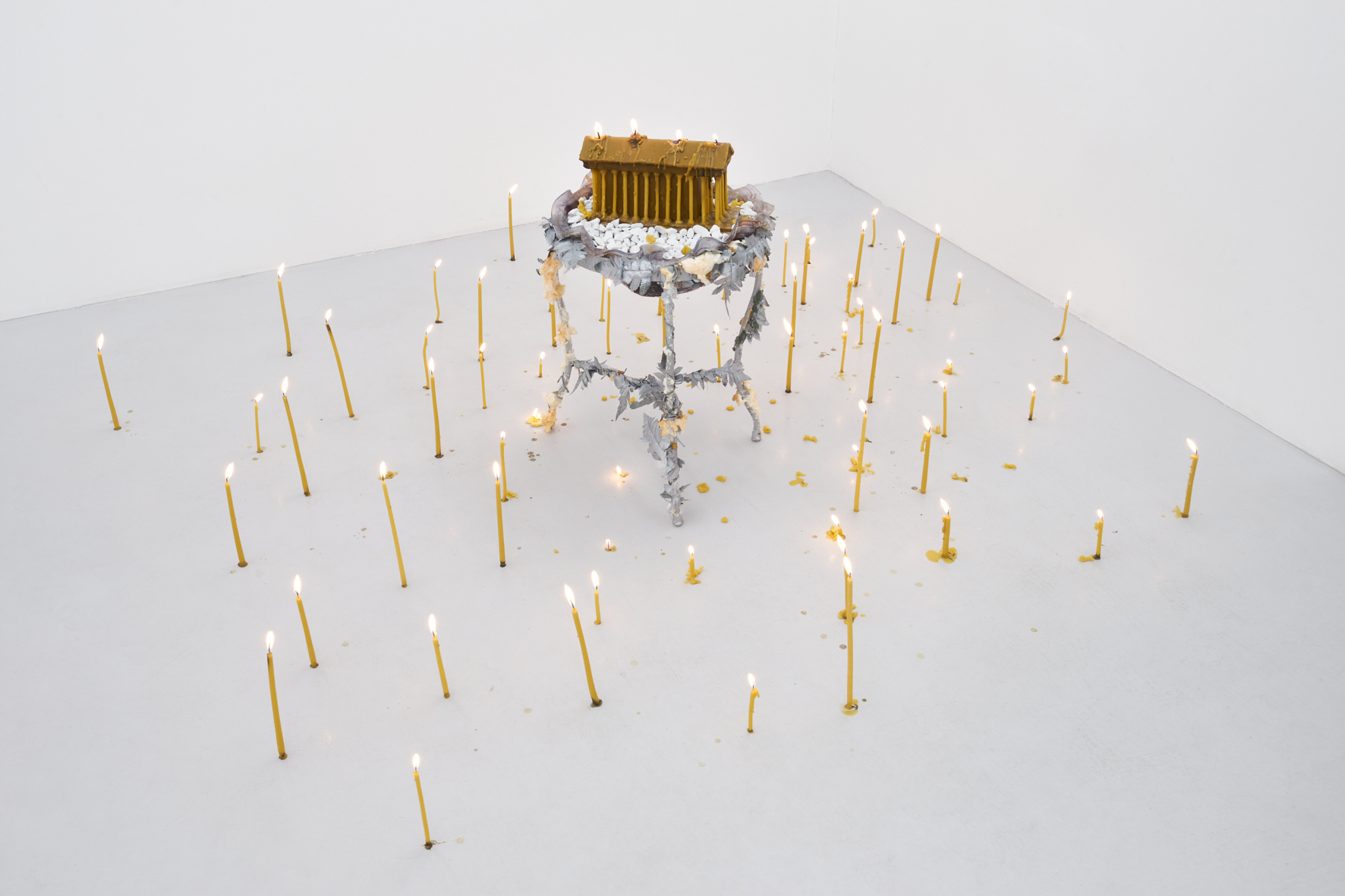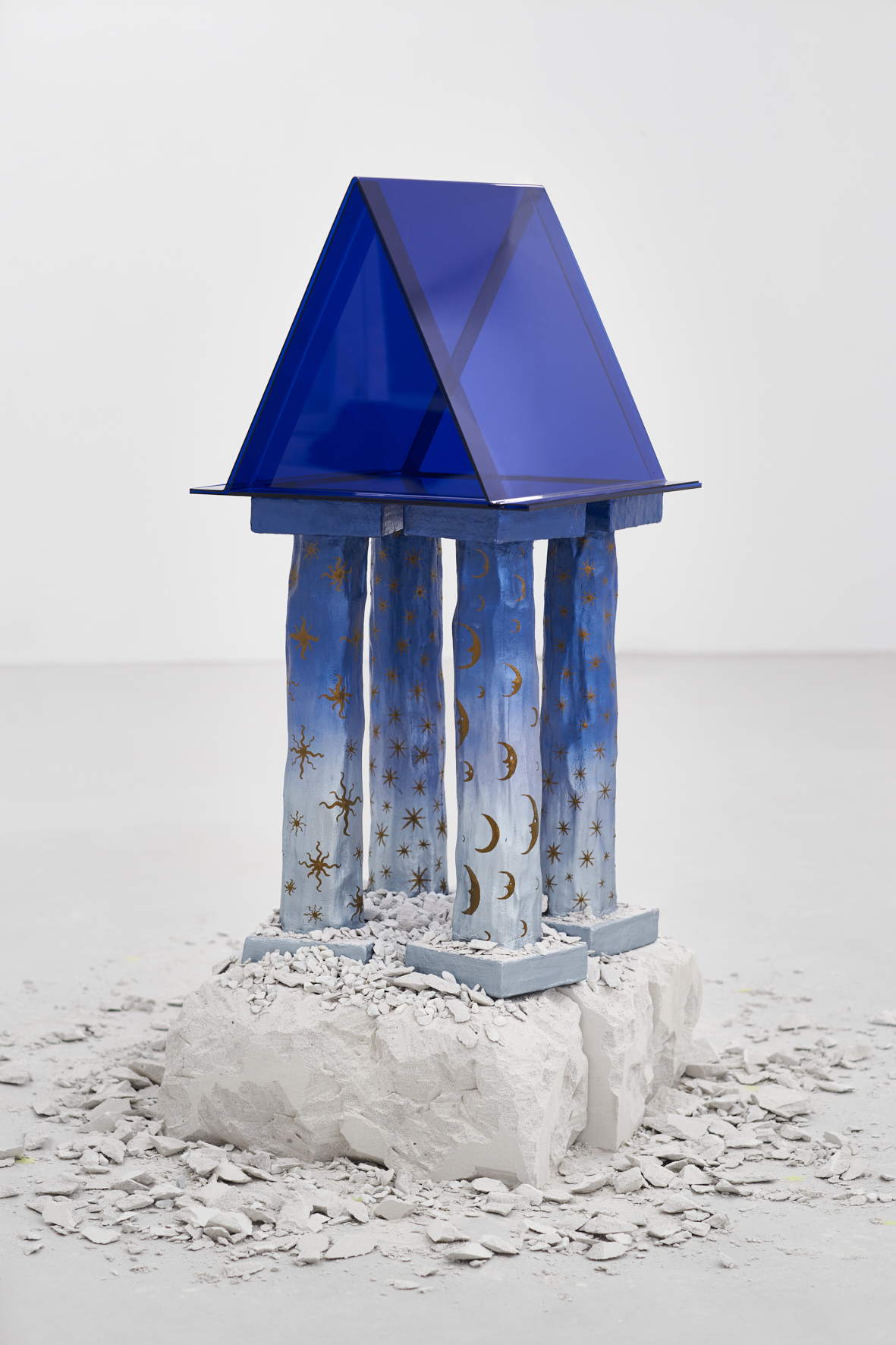 Ashes to Ashes is a collection of color pictures, disturbing animations and peculiar objects connected by a sense of anxiety. The artists turned their fears into imagining their escape from what is coming. And what is coming is war, more social protests and revolts; as a result of global warming, water will reach people’s throats. But, importantly, Øleg&Kaśka do not play artistic activism. They do not create yet another exhibition with a quasi-engaged feature; they do not moralize the viewer nor do they call for a change in our behavior and conversion of our beliefs. The reason is that they do not put their hope in a global (or, better, planetary) change, but in what is beyond the decaying planet. According to them, the Earth is now only a cemetery of ideas as well as civilizational and cultural achievements. A symbol of the destruction of human values is the installation The Temple (2019), at the top of which the Greek Parthenon was set on fire. Along with Athena, the goddess of wisdom and just war, to whom the ancient temple is dedicated, human intelligence and previous armed conflicts have been incinerated. Now nothing matters except the glowing sun (Solar Cult image, 2019).