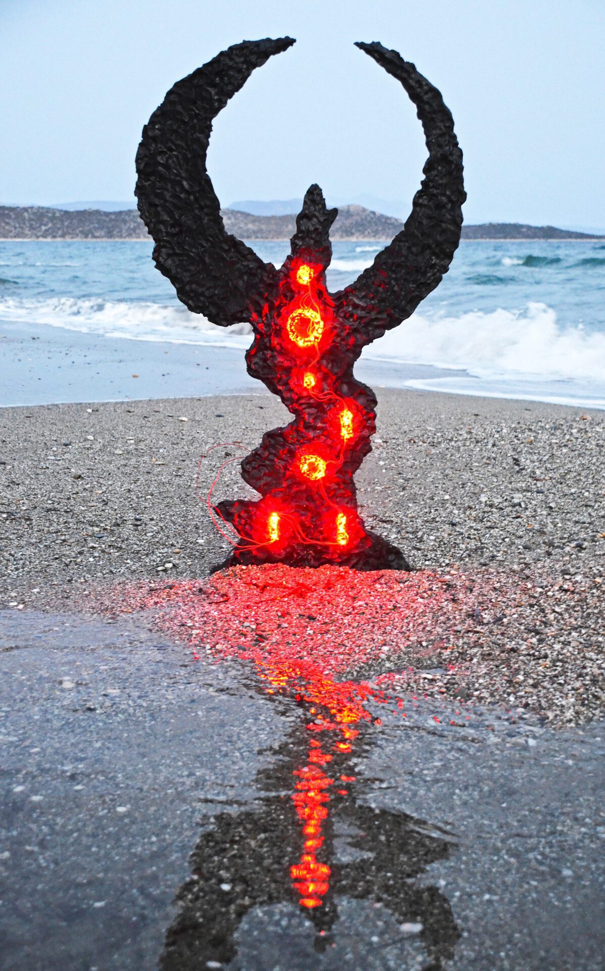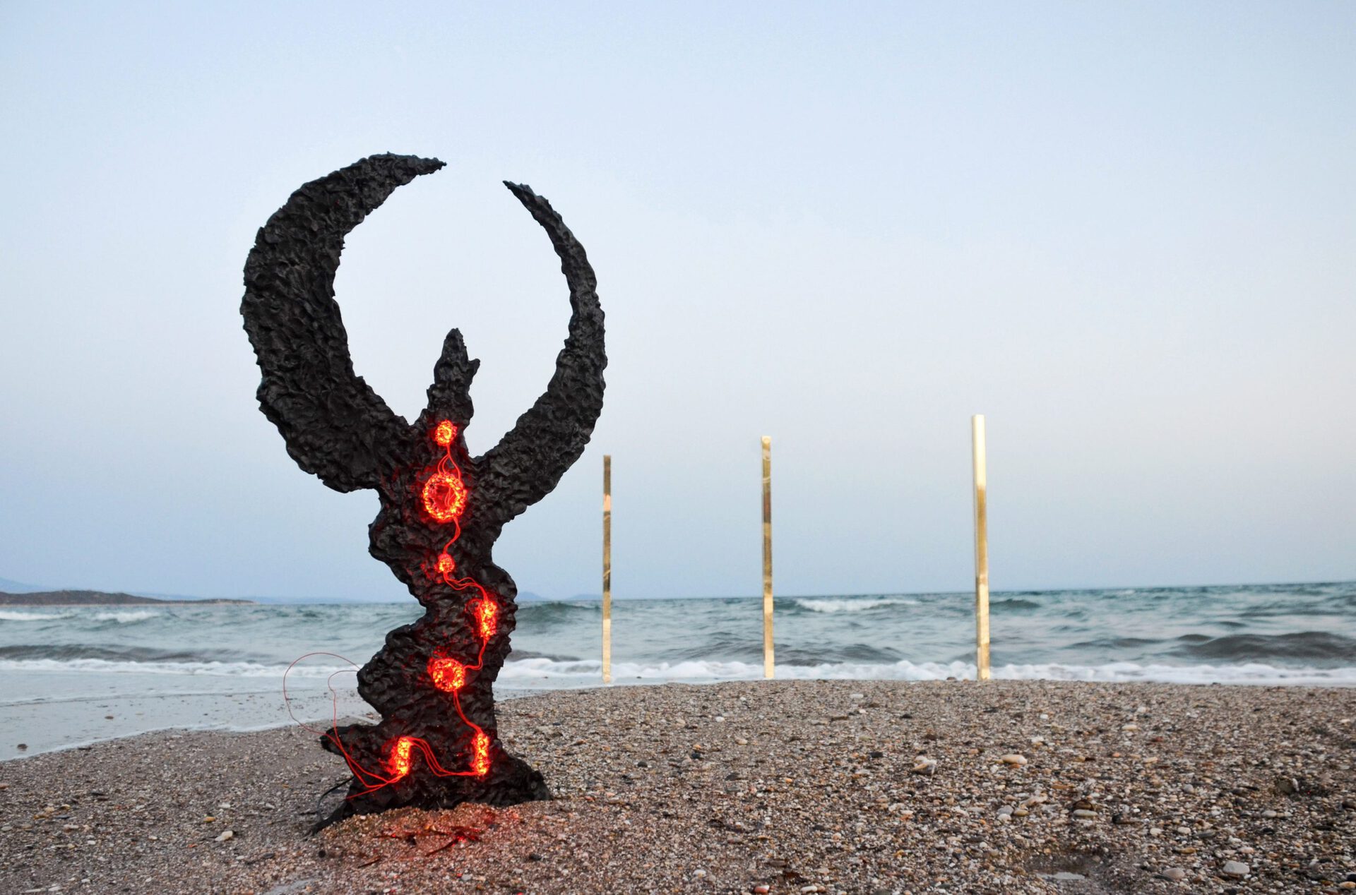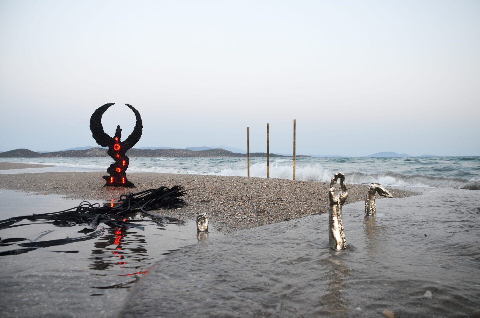 Origins, was shoot during a warm sunset in Schinias Beach, Greece, featuring six autonomous artists. This off-site installation’s video documentation transforms into artwork with added visual effects and OST, composed especially for the video. The 10 min. video on display is an end result of open research, focusing on capturing a glimpse of a high meditative state.