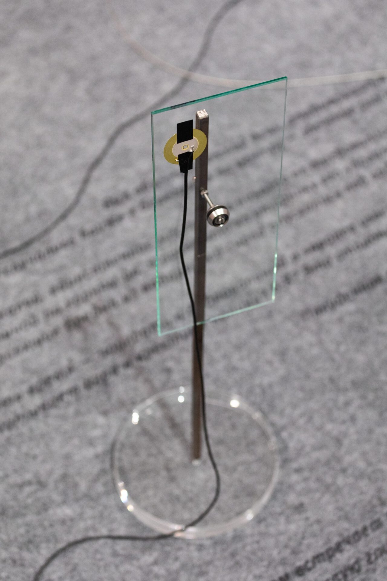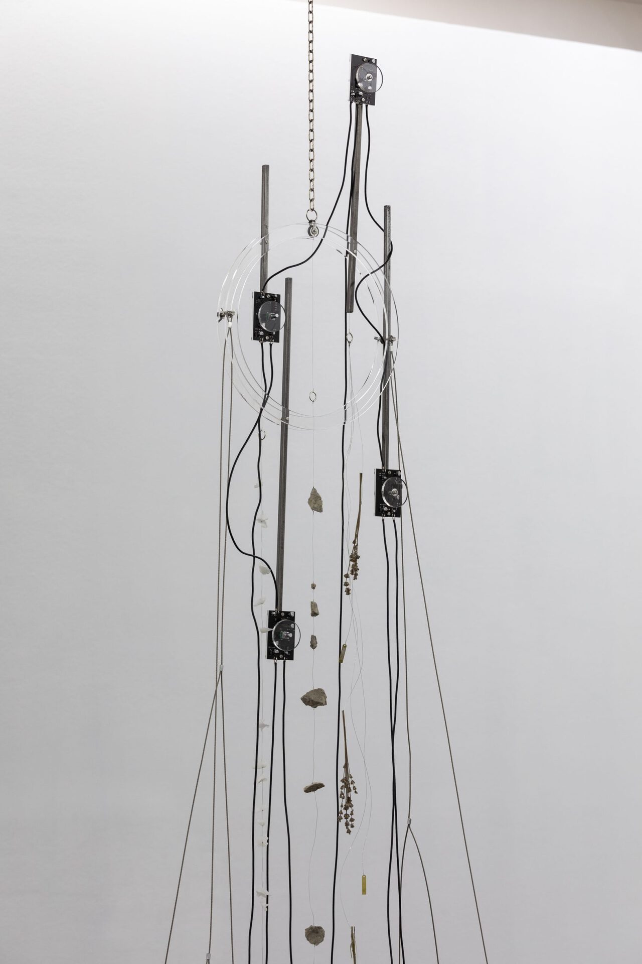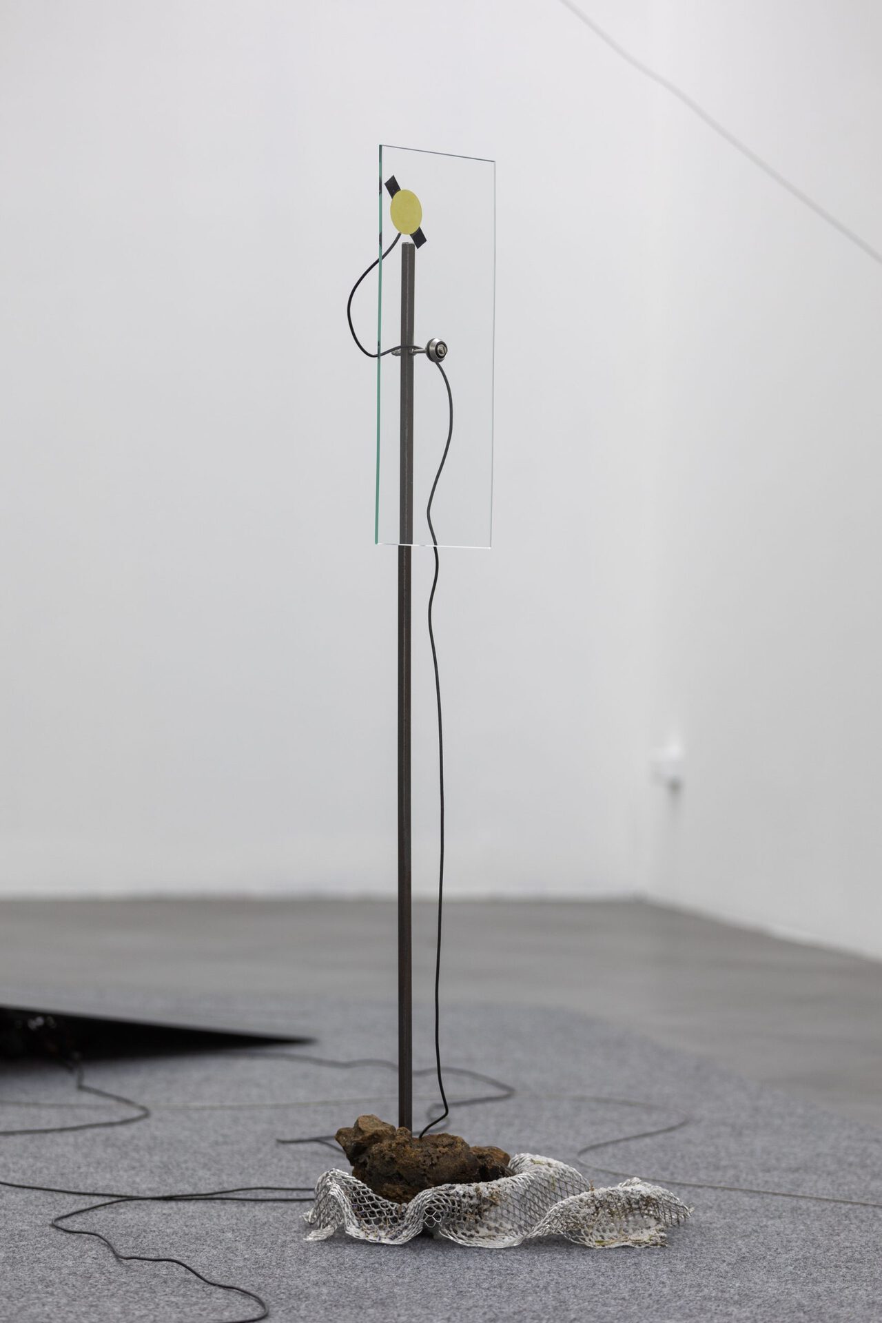 This work is an installation environment that offers a communication field for the visitor to the exhibition. The installation listens, records and reproduces the auditory traces of those present in space. One of the sculptures included in the work, imitating a dream catcher, becomes a kind of "catcher of sounds", allowing you to read the "place" through a stretch of glass screens.