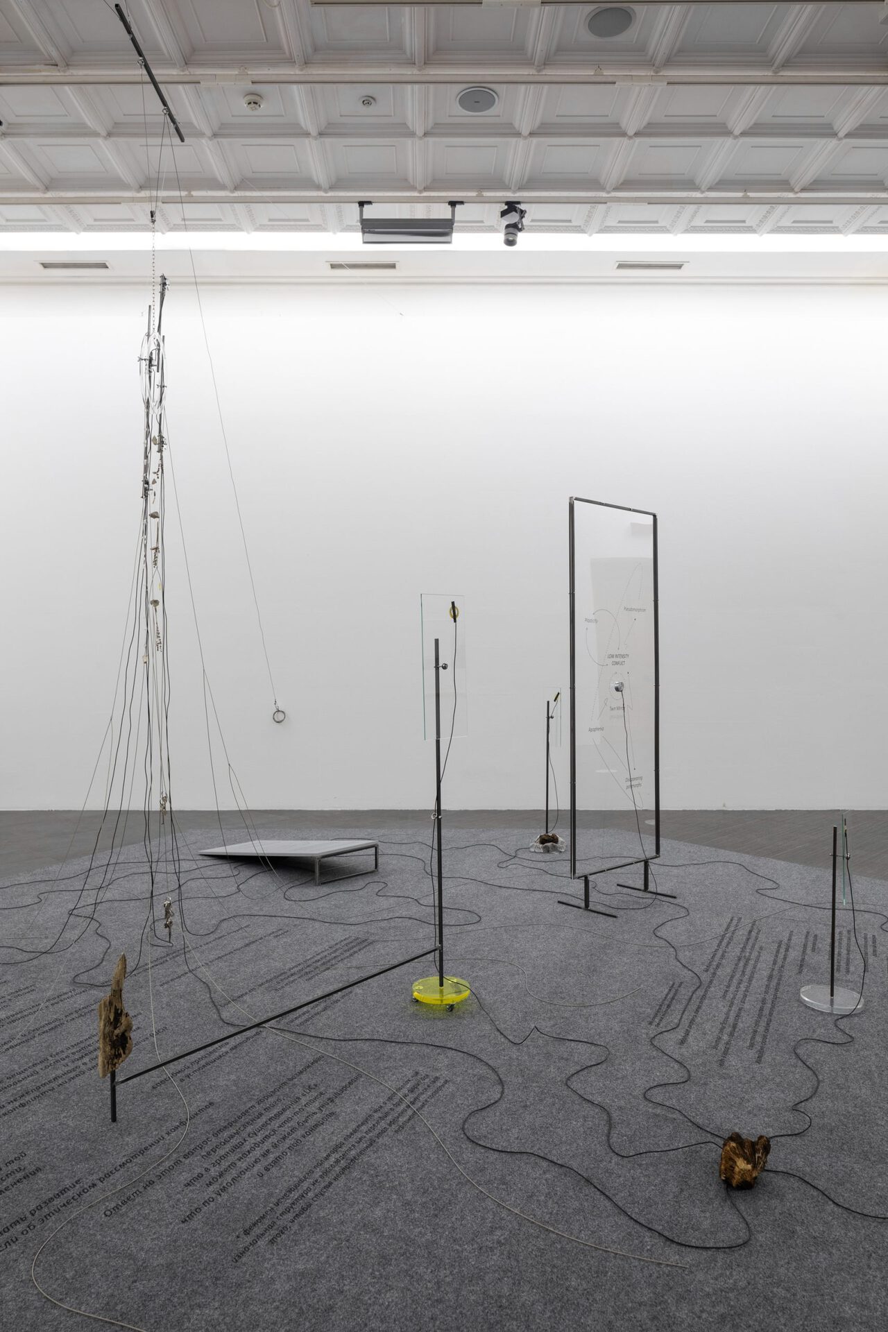 The title of the work stands for “Low Intensity Conflicts” - LIC, containing “to a degree” plastic (explosive) substances. Exponentiation becomes the principle of redistribution of meanings within the installation, and the presence of texts and “flowcharts” included in the architecture of the work illustrates the method of detecting and fixing a possible “threat”.