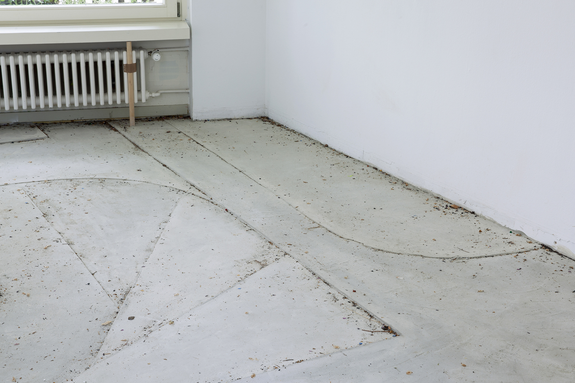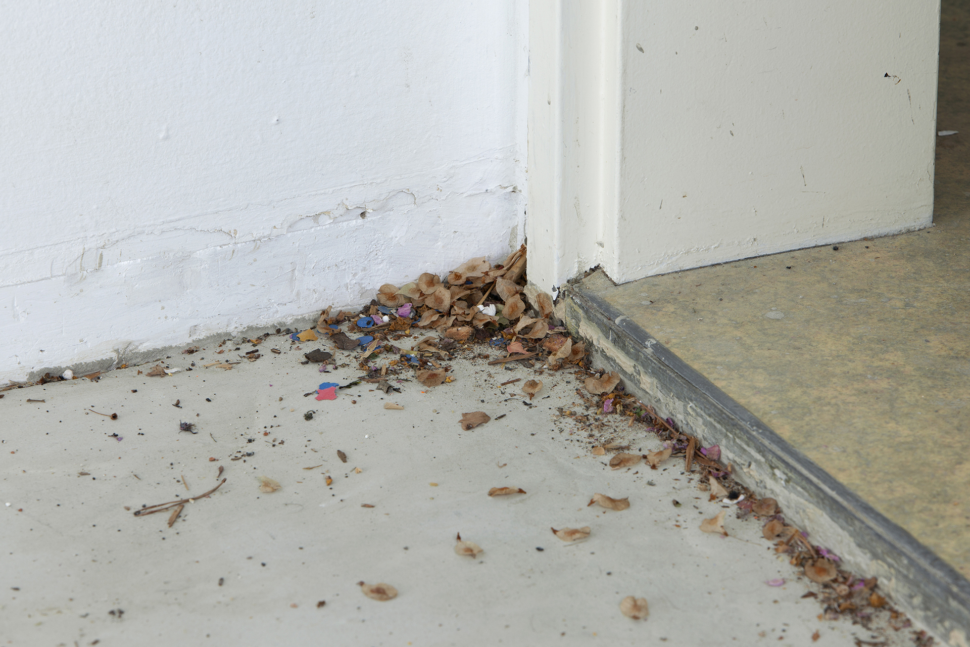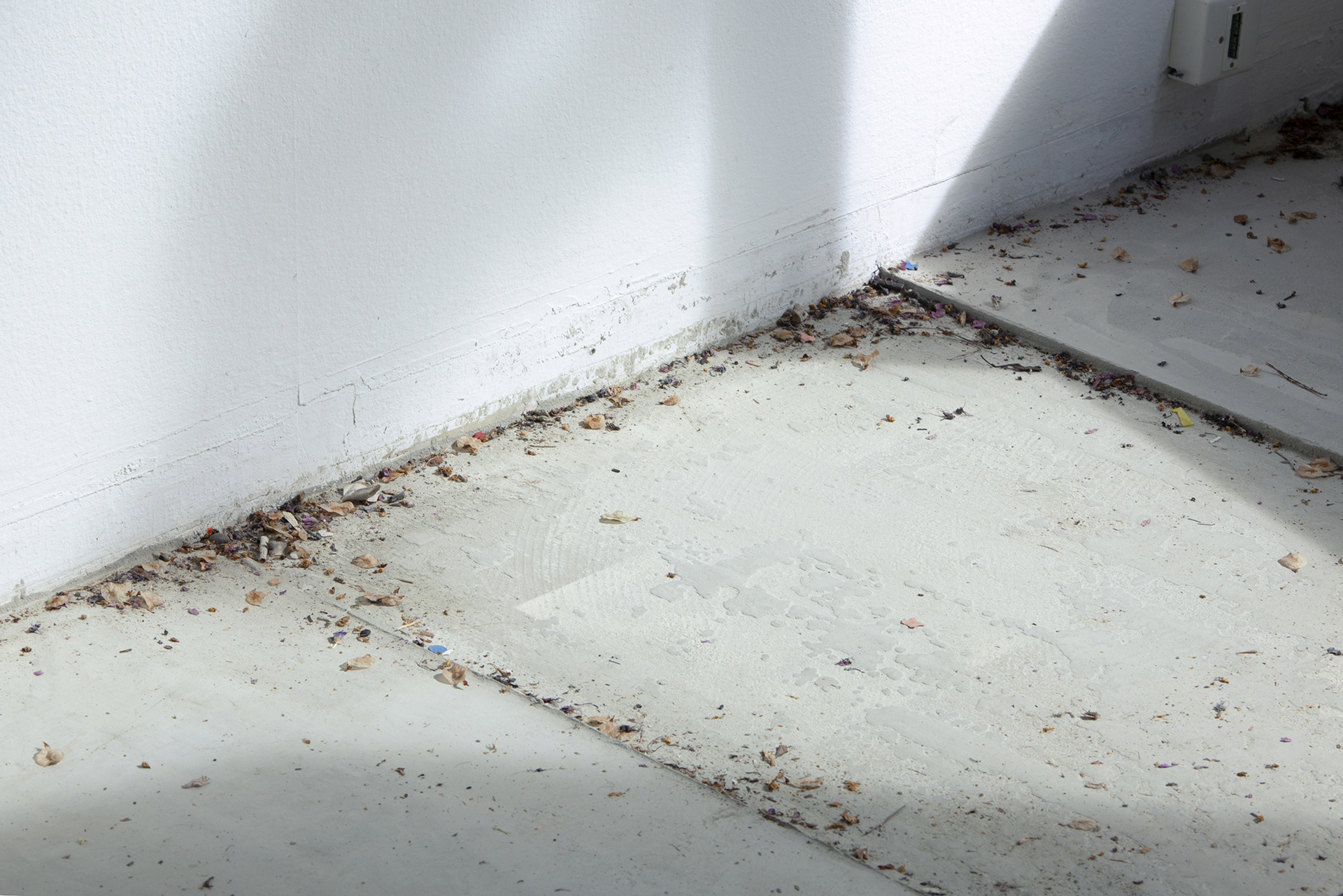 The empty, white walls direct our gaze to the floor. The material that Brigham Baker distributes over variously shaped areas of concrete in Math for Sweeping (2020) consists of both human and natural "litterings", which the artist found in the urban environment surrounding PALAZZINA. The texture is reminiscent of street situations that we often encounter in everyday life, but to which we rarely pay much attention. The distribution of the material is particularly concentrated on the edges and corners of the floor fragments, which particularly emphasizes the entire structure of curves and lines and allows it to become a drawing in space. The fields, created in a long working process, have made the existing concrete floor disappear. The addition of the already existing material concrete and the remnants from the outside space underlines the contrasts of up and down respectively inside and outside. On the other hand, in a window work by the artist, the given material of a building section is removed. In an inconspicuous hole at the upper edge of the outer window pane, similar "sweepings" were dropped into the space in between. At its lower edge, an accumulation is thus formed which seems to be preserved behind glass. Suddenly, previously lightweight objects, driven through the air, gain in weight and heaviness in their multiplicity. They hold us in an intermediate state, which the title of the exhibition also creates, and leave fundamental questions open: Where are we now? In the here and now? And where would be "places to be”?