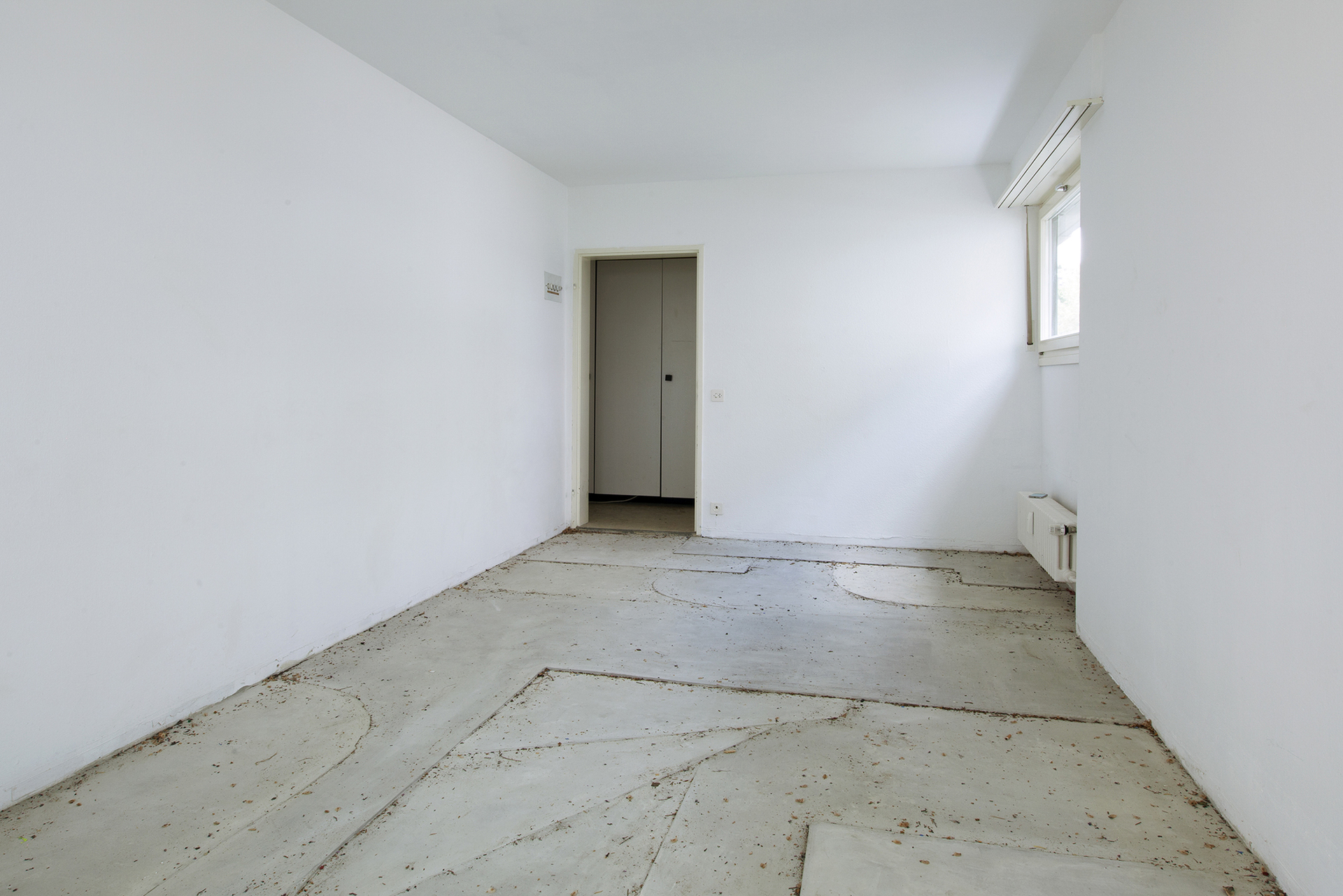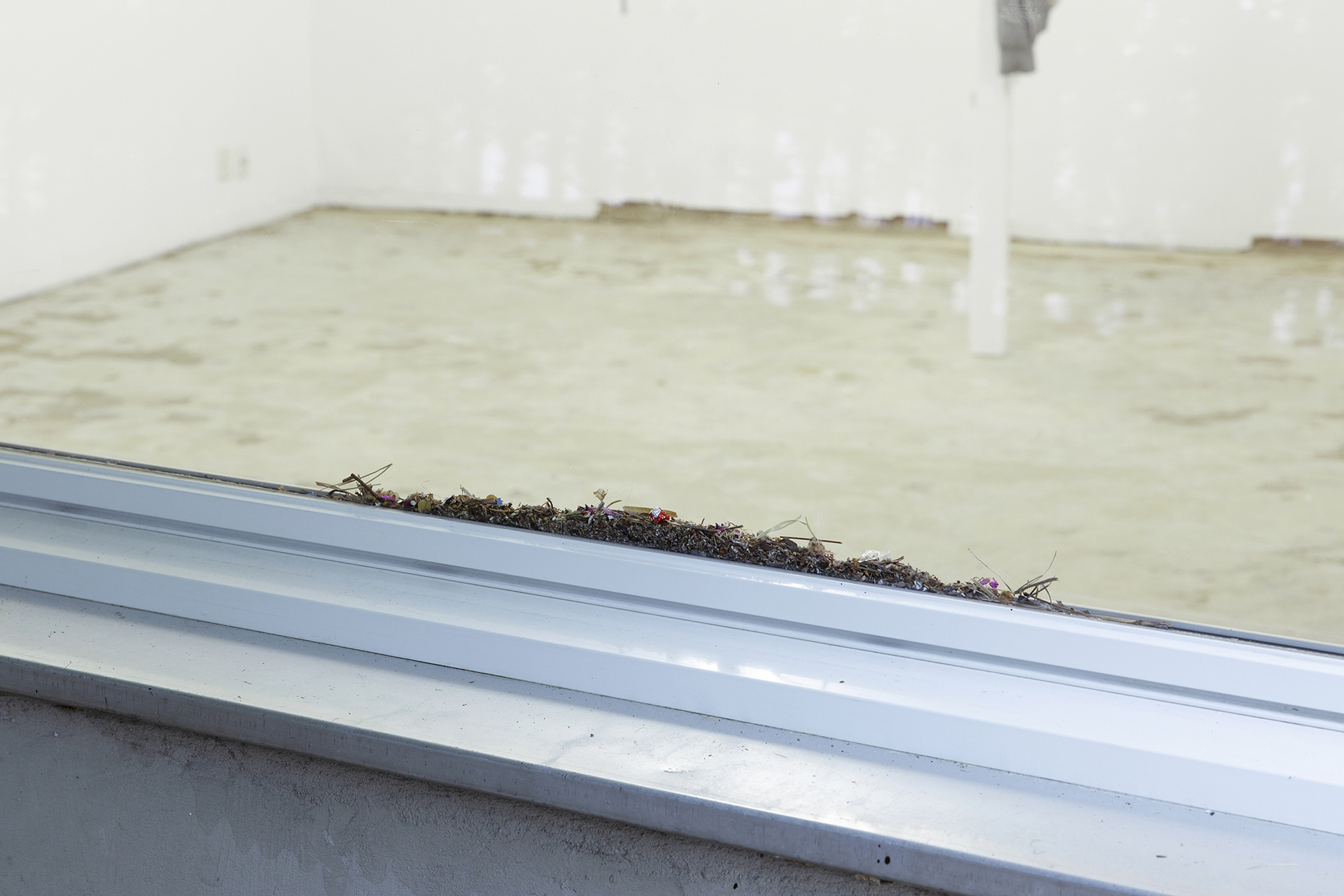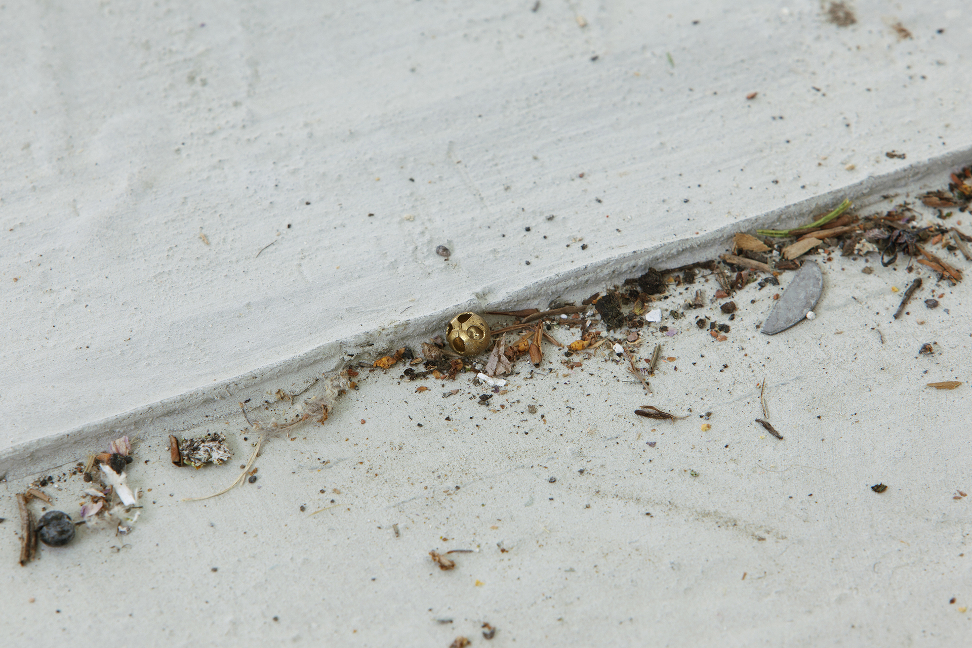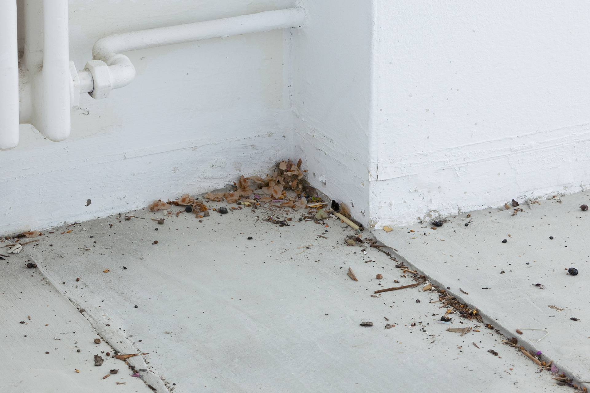 The empty, white walls direct our gaze to the floor. The material that Brigham Baker distributes over variously shaped areas of concrete in Math for Sweeping (2020) consists of both human and natural "litterings", which the artist found in the urban environment surrounding PALAZZINA. The texture is reminiscent of street situations that we often encounter in everyday life, but to which we rarely pay much attention. The distribution of the material is particularly concentrated on the edges and corners of the floor fragments, which particularly emphasizes the entire structure of curves and lines and allows it to become a drawing in space. The fields, created in a long working process, have made the existing concrete floor disappear. The addition of the already existing material concrete and the remnants from the outside space underlines the contrasts of up and down respectively inside and outside. On the other hand, in a window work by the artist, the given material of a building section is removed. In an inconspicuous hole at the upper edge of the outer window pane, similar "sweepings" were dropped into the space in between. At its lower edge, an accumulation is thus formed which seems to be preserved behind glass. Suddenly, previously lightweight objects, driven through the air, gain in weight and heaviness in their multiplicity. They hold us in an intermediate state, which the title of the exhibition also creates, and leave fundamental questions open: Where are we now? In the here and now? And where would be "places to be”?