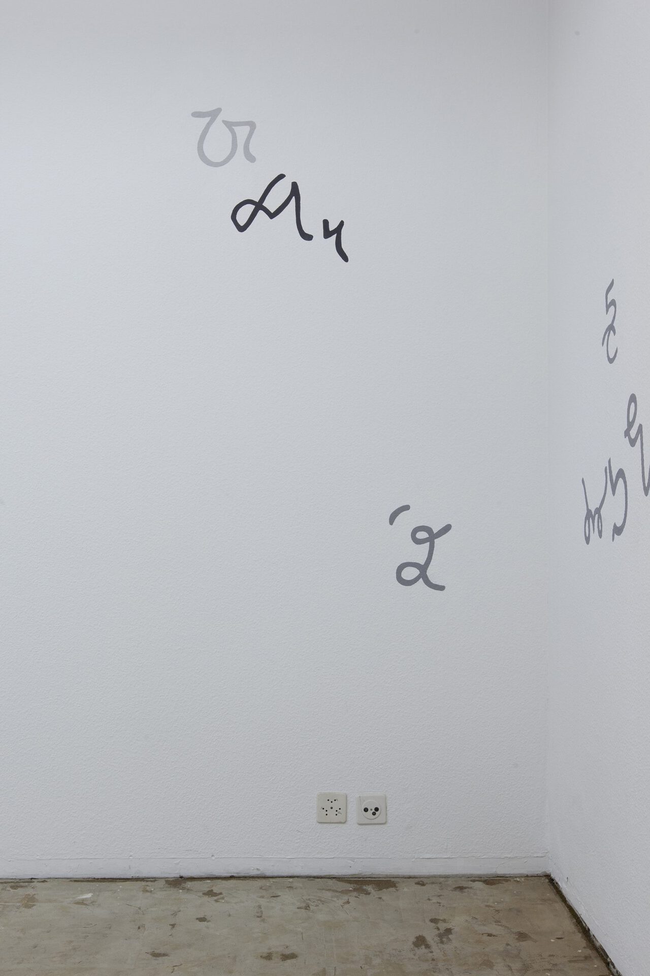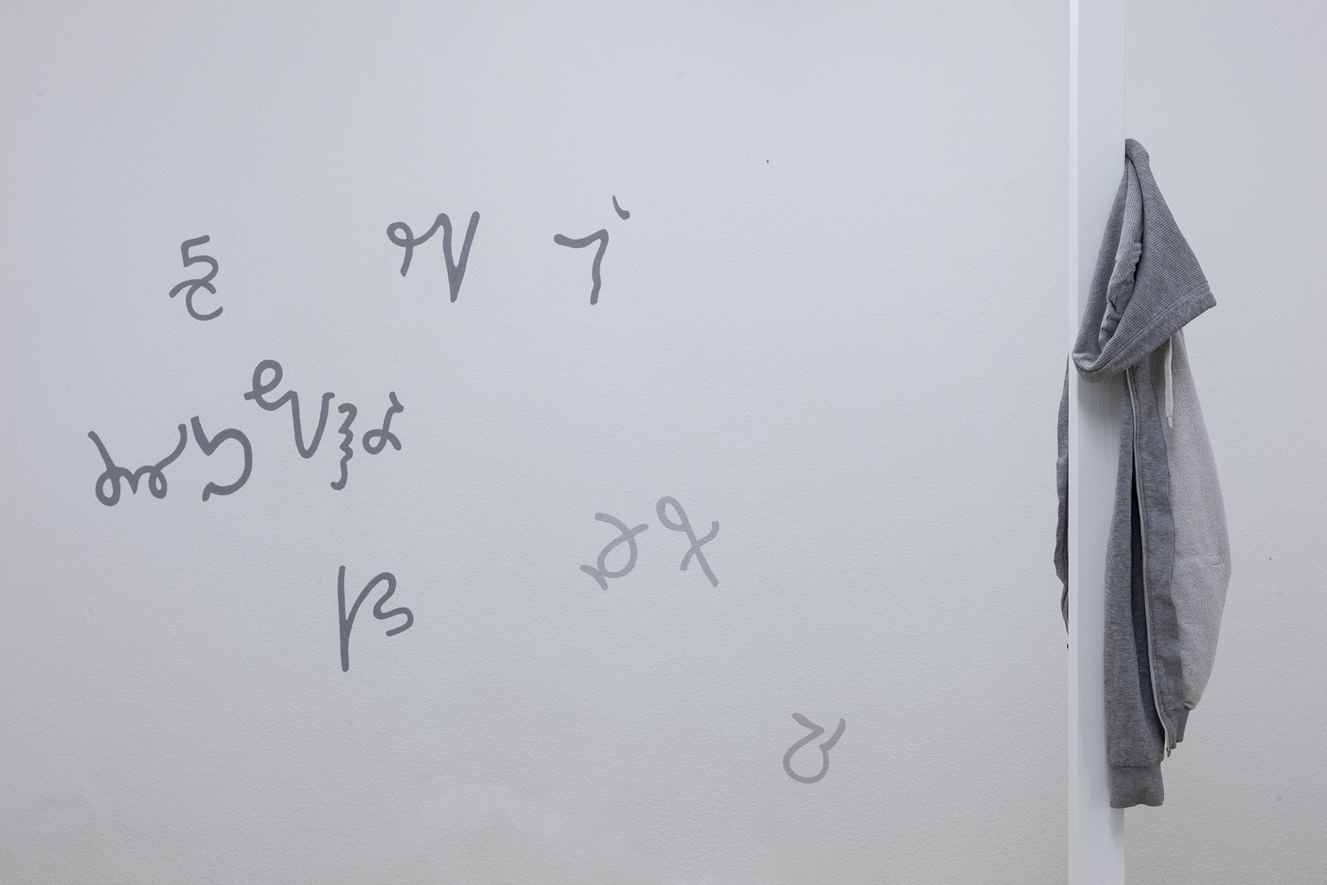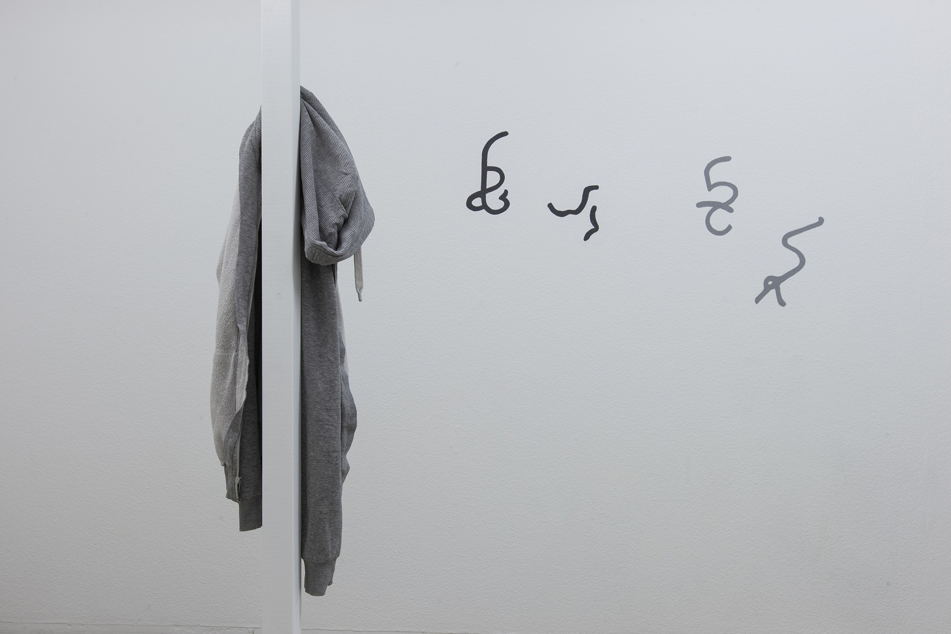 Nina Rieben distributes abstract signs of different sizes, painted directly on the wall, which seem to float in space as a loose structure. The signs are part of an encoded script, which was created by the artist herself, but whose code she does not provide. The writing is a reference to the situation in which something meaningful is to be expressed by language, but cannot be transformed into what is said – a limitation of the explicitness of language. The presence of a sweatshirt jacket hanging in the room reinforces the intimate and withdrawn atmosphere into which viewers enter through their physical presence. Small folded pieces of paper are attached to the fabric of the garment, which contain written wishes. These remain hidden and unreadable, which can be felt as a distance, but which raises deepest questions. What are our personal wishes or desires? And how do we manifest or code them?
