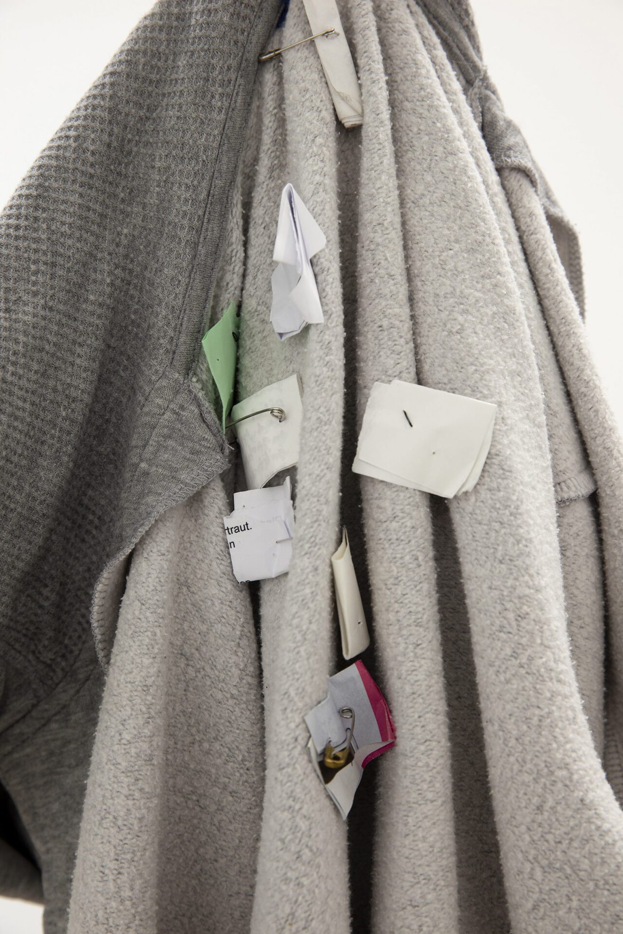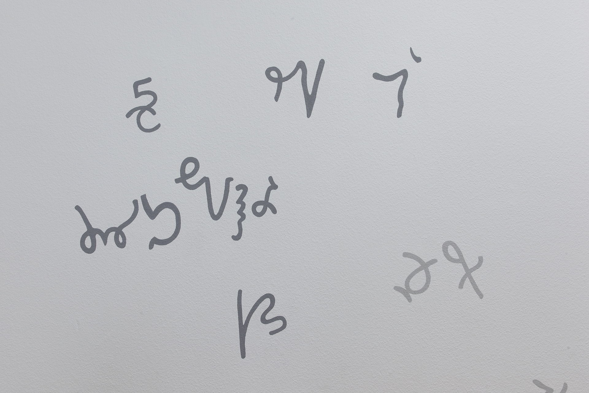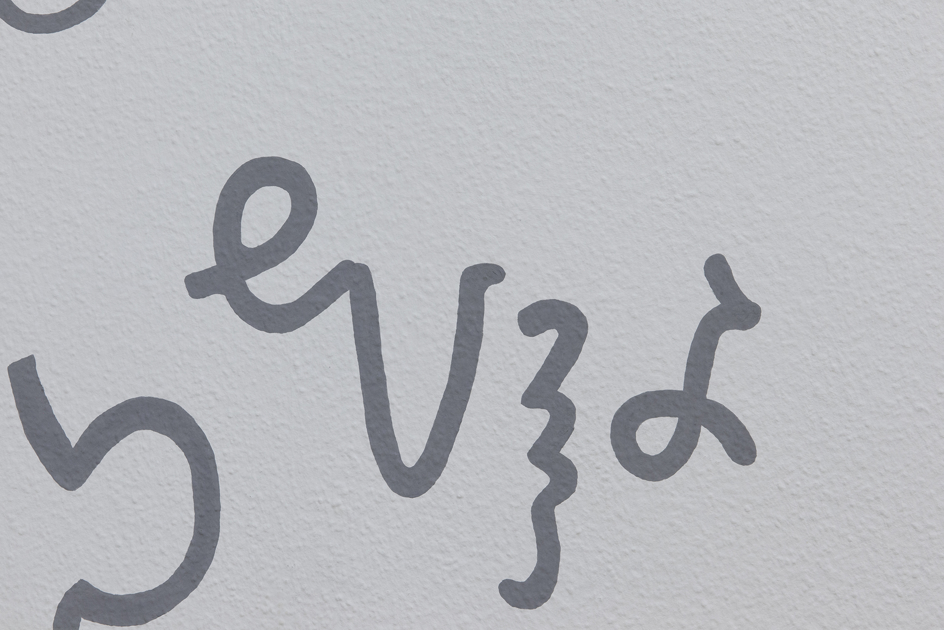 Nina Rieben distributes abstract signs of different sizes, painted directly on the wall, which seem to float in space as a loose structure. The signs are part of an encoded script, which was created by the artist herself, but whose code she does not provide. The writing is a reference to the situation in which something meaningful is to be expressed by language, but cannot be transformed into what is said – a limitation of the explicitness of language. The presence of a sweatshirt jacket hanging in the room reinforces the intimate and withdrawn atmosphere into which viewers enter through their physical presence. Small folded pieces of paper are attached to the fabric of the garment, which contain written wishes. These remain hidden and unreadable, which can be felt as a distance, but which raises deepest questions. What are our personal wishes or desires? And how do we manifest or code them?