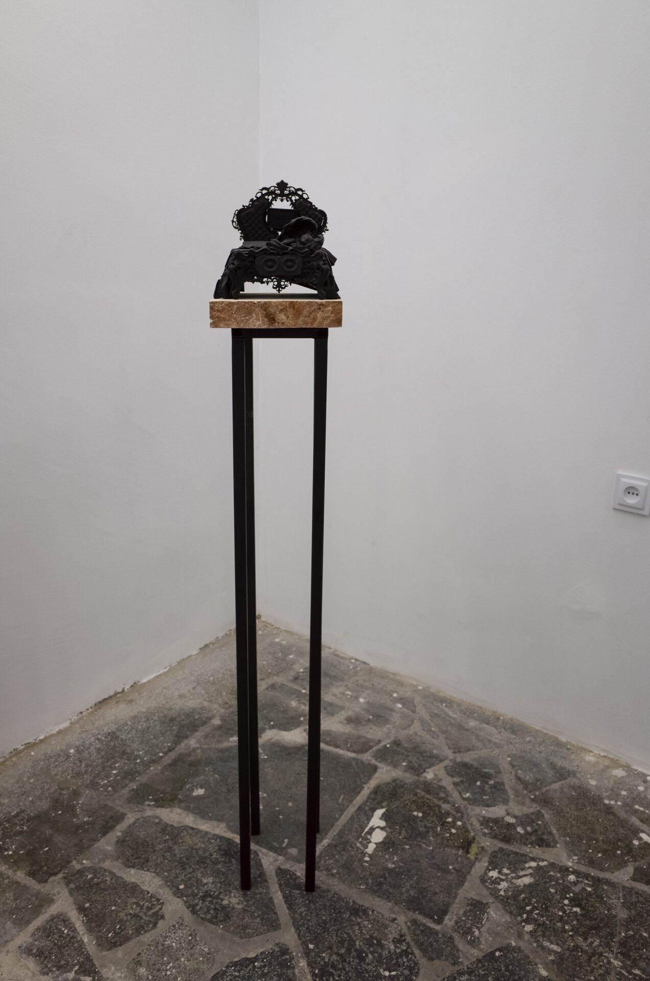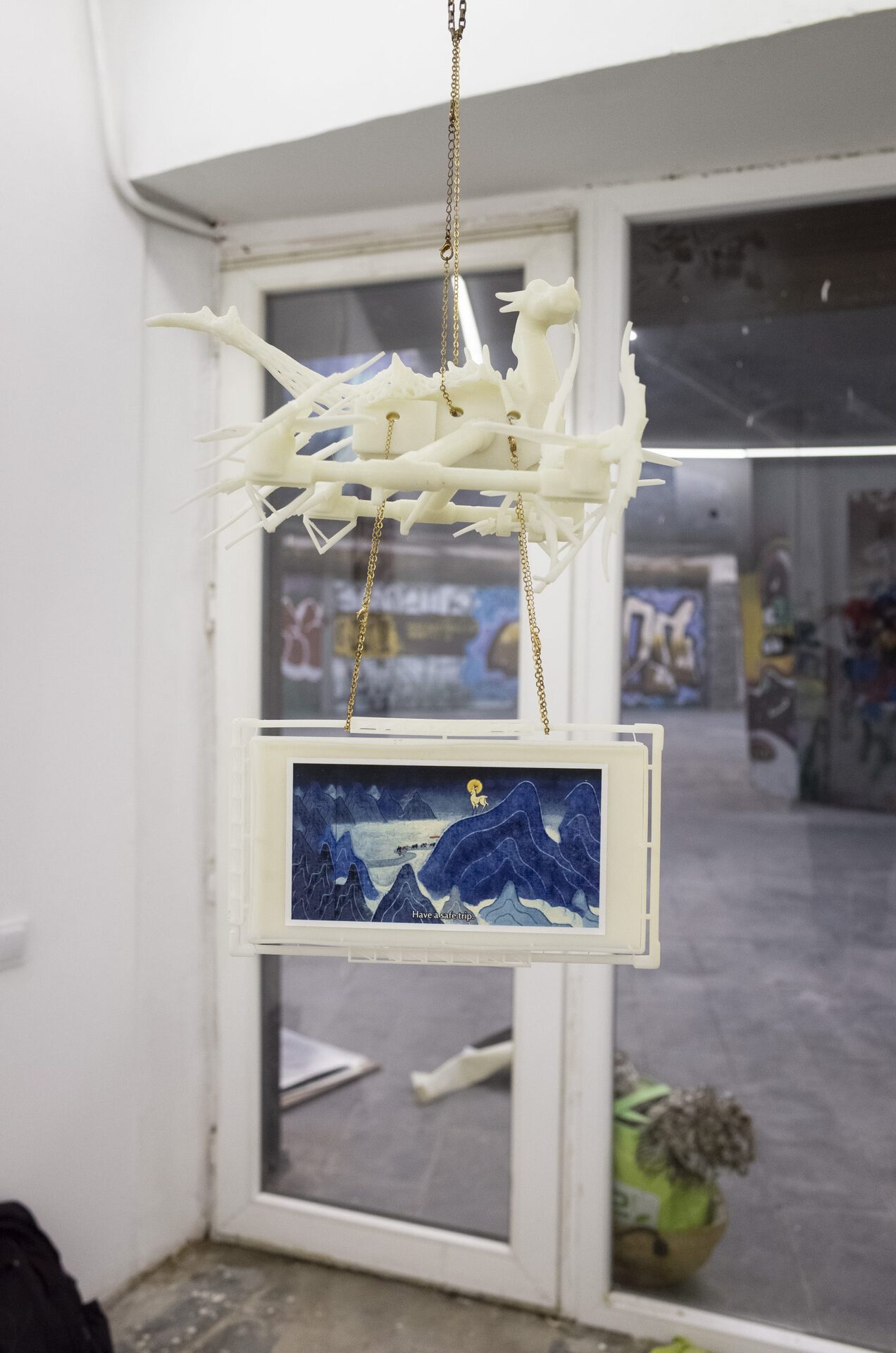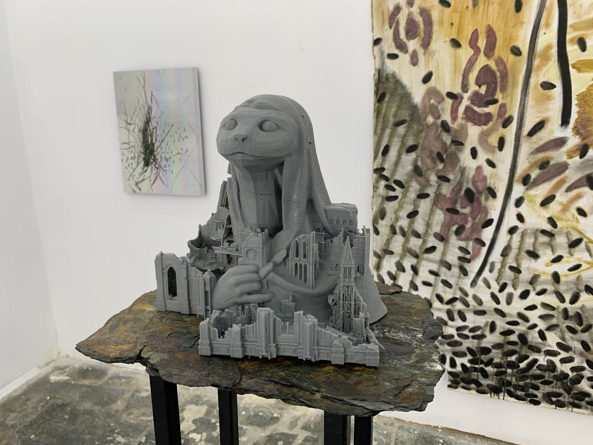 here are almost no similarities between these two artists practice: different mediums, materials, themes… Genevieve’s works are deconstructed, deformed, computer modeled, 3d printed objects when George’s paintings are made with a classical manner with a technological twist: his works are paintings on cardboard and super-thin metal sheets. But one main motive that unites both artists is the synthesis of working with man-made materials and symbols, elements that are undivided part of the culture that classical progress of humankind has created. Those elements are dependent on time and will eventually change or disappear: may it be a bed, castle, helicopter or machine-made metal leaf. Artists use these elements and add an immortal knowledge to it: Giorgi uses metal sheets that are product produced by factories and paints plants on them as if those plants are ones invading this machinery sterility of it. This intrude is more clearly felt and shown in Genevieve’s works: one of her sculptures middle century classical castle is being demolished by a cat that is now ruling this classical symbol of western worlds masculine power and wealth and by this it’s questioning the validity and relevance of the cultural identities created by the mankind throughout the centuries.