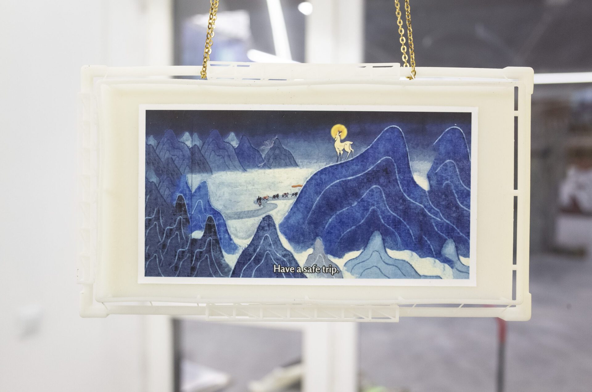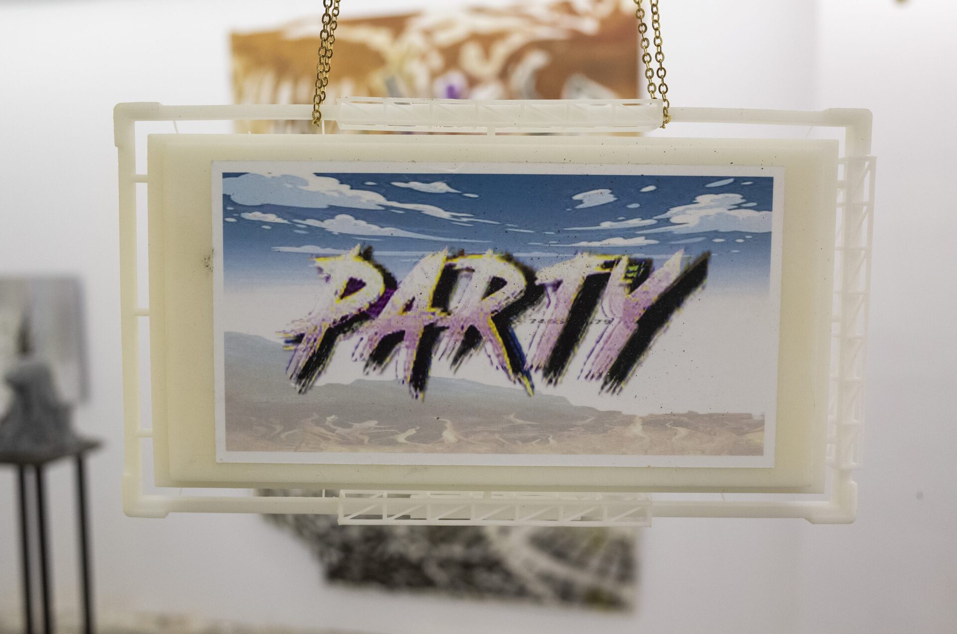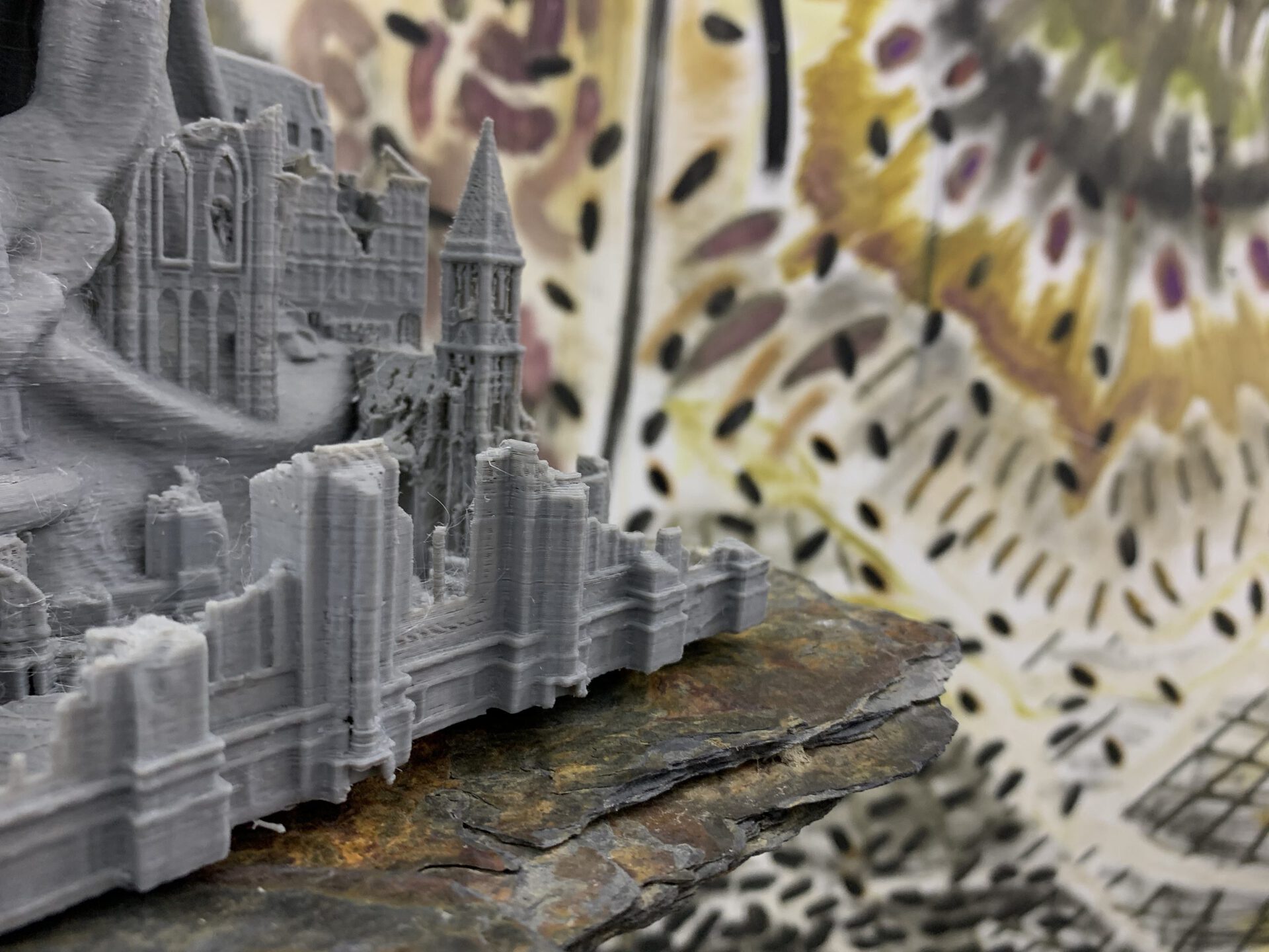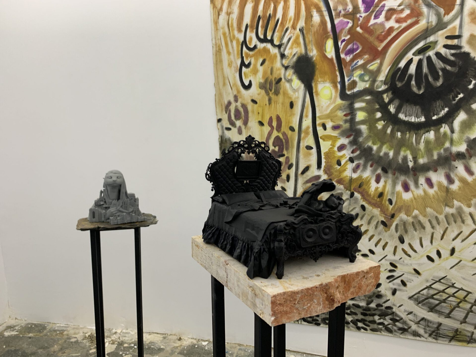 here are almost no similarities between these two artists practice: different mediums, materials, themes… Genevieve’s works are deconstructed, deformed, computer modeled, 3d printed objects when George’s paintings are made with a classical manner with a technological twist: his works are paintings on cardboard and super-thin metal sheets. But one main motive that unites both artists is the synthesis of working with man-made materials and symbols, elements that are undivided part of the culture that classical progress of humankind has created. Those elements are dependent on time and will eventually change or disappear: may it be a bed, castle, helicopter or machine-made metal leaf. Artists use these elements and add an immortal knowledge to it: Giorgi uses metal sheets that are product produced by factories and paints plants on them as if those plants are ones invading this machinery sterility of it. This intrude is more clearly felt and shown in Genevieve’s works: one of her sculptures middle century classical castle is being demolished by a cat that is now ruling this classical symbol of western worlds masculine power and wealth and by this it’s questioning the validity and relevance of the cultural identities created by the mankind throughout the centuries.