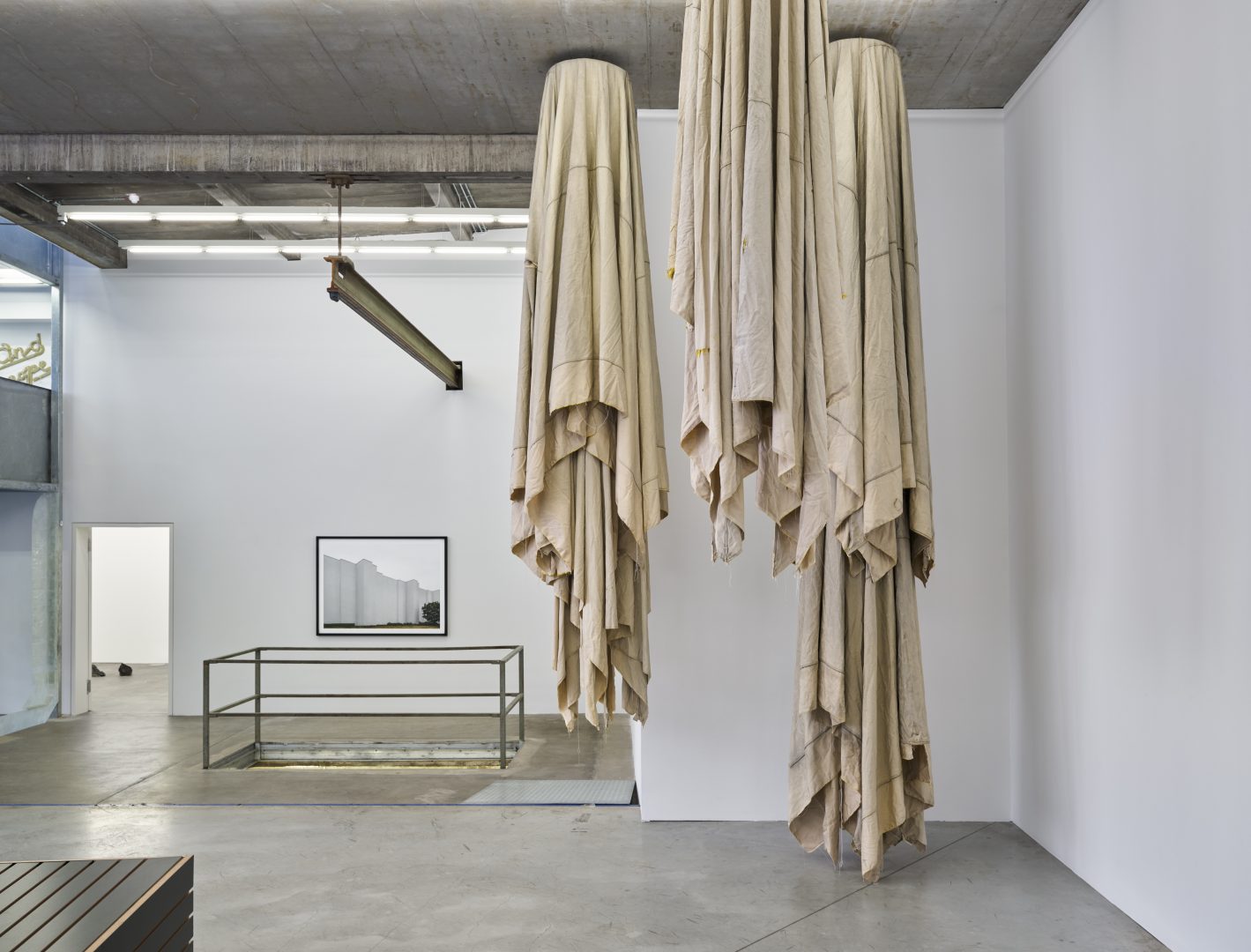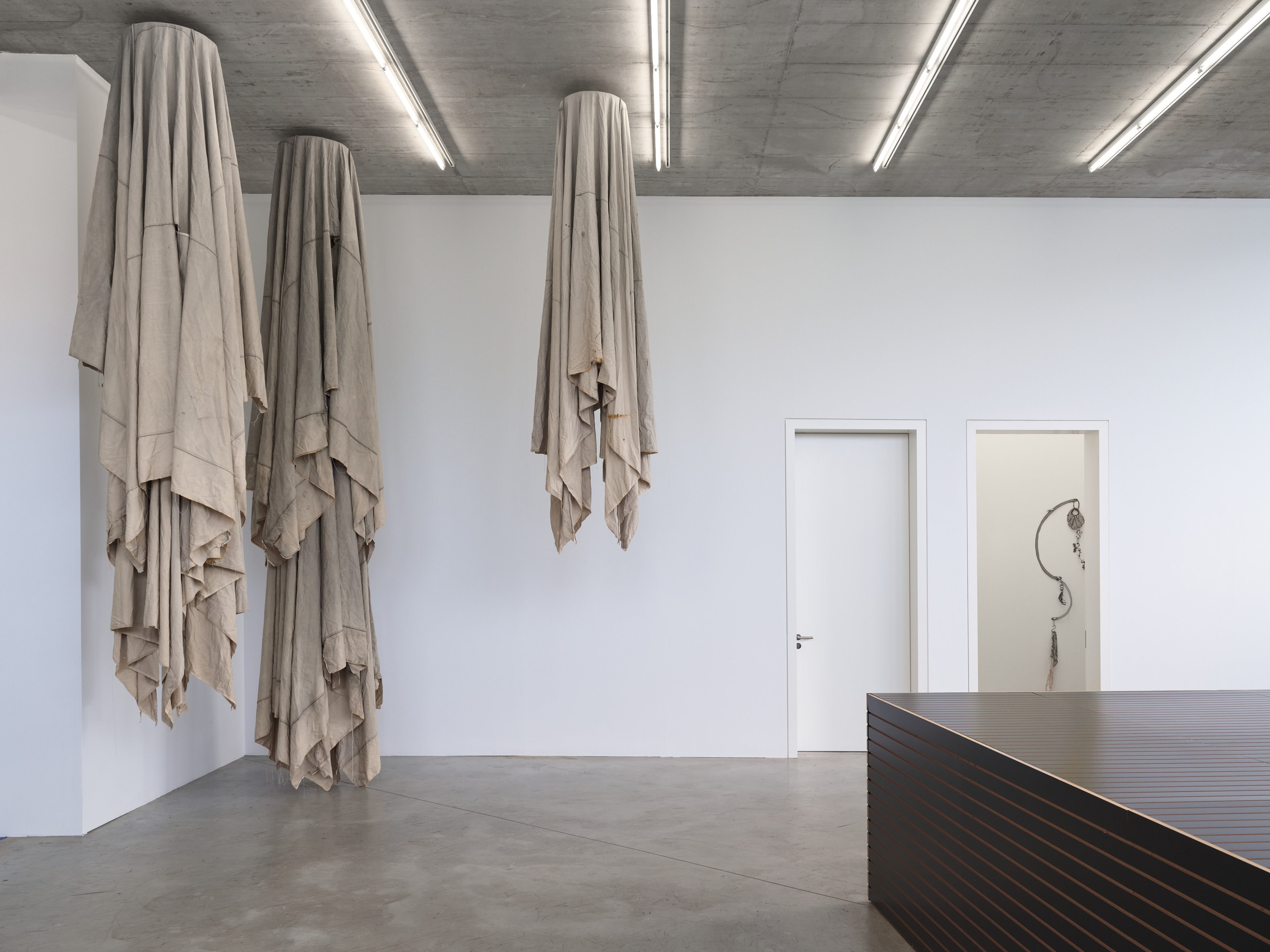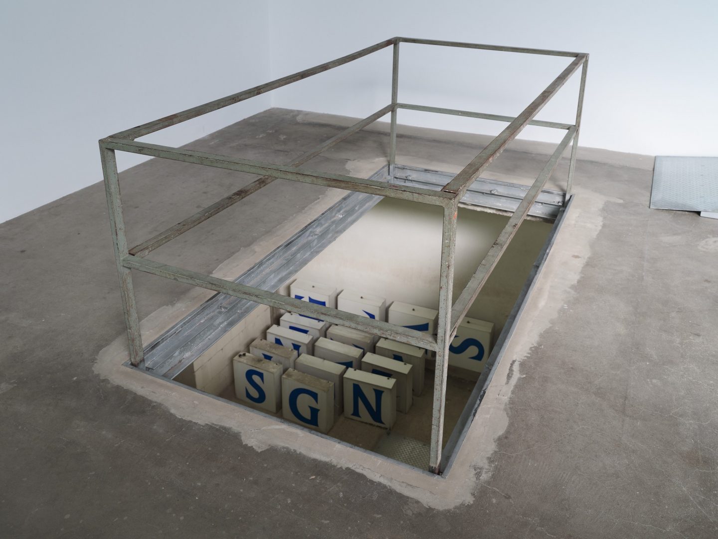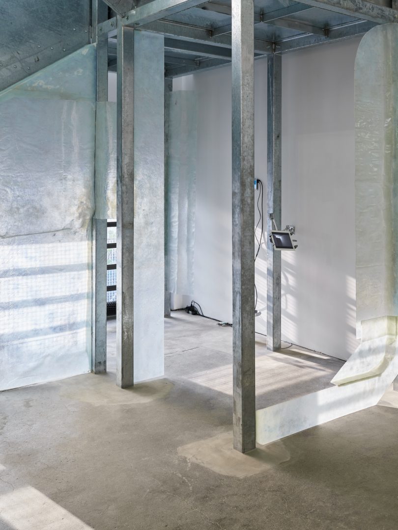 Die Ausstellung ist als Prozess in zwei Phasen angelegt, in dem sich einzelne Arbeiten verändern, die Positionen tauschen, wieder verschwinden oder neue hinzukommen. „Es ist schön, solche prozesshaften Arbeiten zu zeigen, die sich verändern, so wie es auch der Arbeit im Atelier entspricht. Man kann die Ausstellung in unterschiedlichen Momenten erleben“, beschreibt es Julika Bosch. Aktuell läuft Phase II der Ausstellung, und wie schon in der ersten Phase besetzen die Arbeiten das Sammlungsgebäude wie neugierige Gäste, die sich mal umschauen wollen, hinter Ecken und in Nischen lugen, hier und da Vorschläge für die Einrichtung geben, ohne zu aufdringlich zu sein. Vielen Arbeiten ging eine sehr genaue Beobachtung des Raumes voraus, Markierungen auf dem Boden, verschlossene Türen und undurchsichtige Fenster, die man sonst bei einem Ausstellungsrundgang leicht übersieht, wurden in den Fokus gerückt. Anna Sphak ließ eine Abdeckplatte auf dem Boden entfernen und ein passendes Absperrgitter über dem so entstandenen Ausschnitt ergänzen, um den Blick in den darunter liegenden Lagerraum zu öffnen, in dem sich die Vergangenheit des Gebäudes mit der Ausstellungsgeschichte der Sammlung Philara verbindet. Daneben erweitert Anna Orlinski das Treppenhaus um eine Fiberglasarbeit, die aus dem funktionalen Gebäudeteil eine begehbare Installation macht. Gleich mehrere Künstler*innen haben sich für die Treppe interessiert, sagt Julika Bosch, ein Raum, der sonst eher nicht beachtet wird.