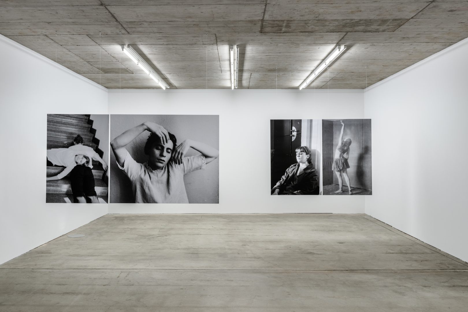 Besonders wird die Ausstellung an den Momenten, in denen zwischen zwei komplett unterschiedlichen Arbeiten eine Verbindung entsteht, die dem Raum eine neue, dritte Ebene hinzufügt. Das passiert zum Beispiel im Zusammenspiel der großen Wandmalerei von Hannah Malka Papendieck und den Fotoarbeiten von Hannah Linden. Linden kombinierte eigene Schwarz-weiß-Aufnahmen mit historischen Bildern aus dem Deutschen Tanzarchiv Köln, deren performative Bewegung sich in der gestischen Wandmalerei gegenüber spiegelt.