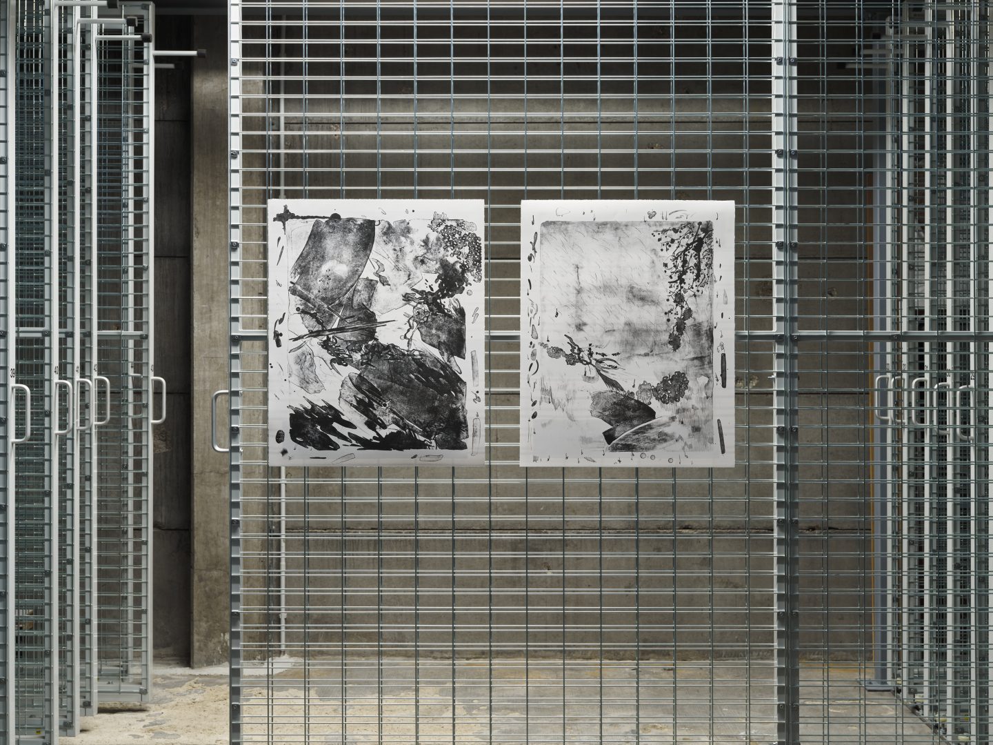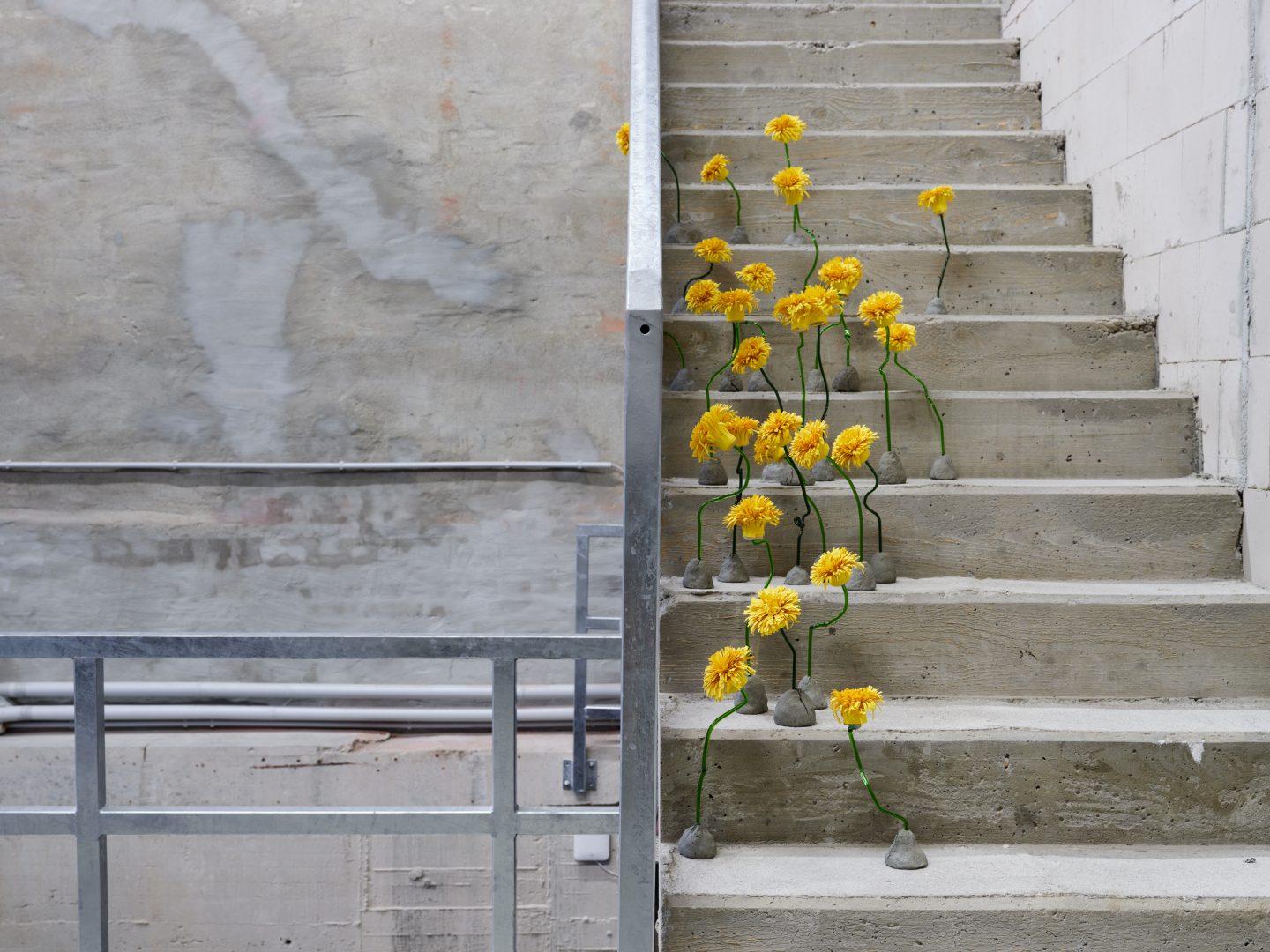 Jonathan Wagner, Sunyou Jeong und Sonja Heim besetzen mit ihren Arbeiten das Schaulager, das sonst verschlossen ist und eher als Abstellraum dient. Nun wächst dort eine große fließende Skulptur aus Metallgittern und Streifen von ausrangiertem Linoleumfußboden vom Fenster zum Boden und fügt sich geschmeidig in die Materialität des Raumes ein. Darin steckt auch die Frage danach, was eigentlich bewahrenswert ist, was gesammelt wird und was bleibt. Sonja Heim hat unzählige kleine Löwenzahn-Skulpturen im Raum und auf der Treppe platziert, die den kargen und kühlen Raum wie kleine Fabelwesen beleben. Und Sunyou Jeong nutzt die metallenen Schaulagerwände als Hängefläche für ihre zarten Lithografien, die einzelne Schritte aus dem Druckprozess offenlegen, genauso wie der Raum seinen eigentlichen Zweck nicht verschleiert.