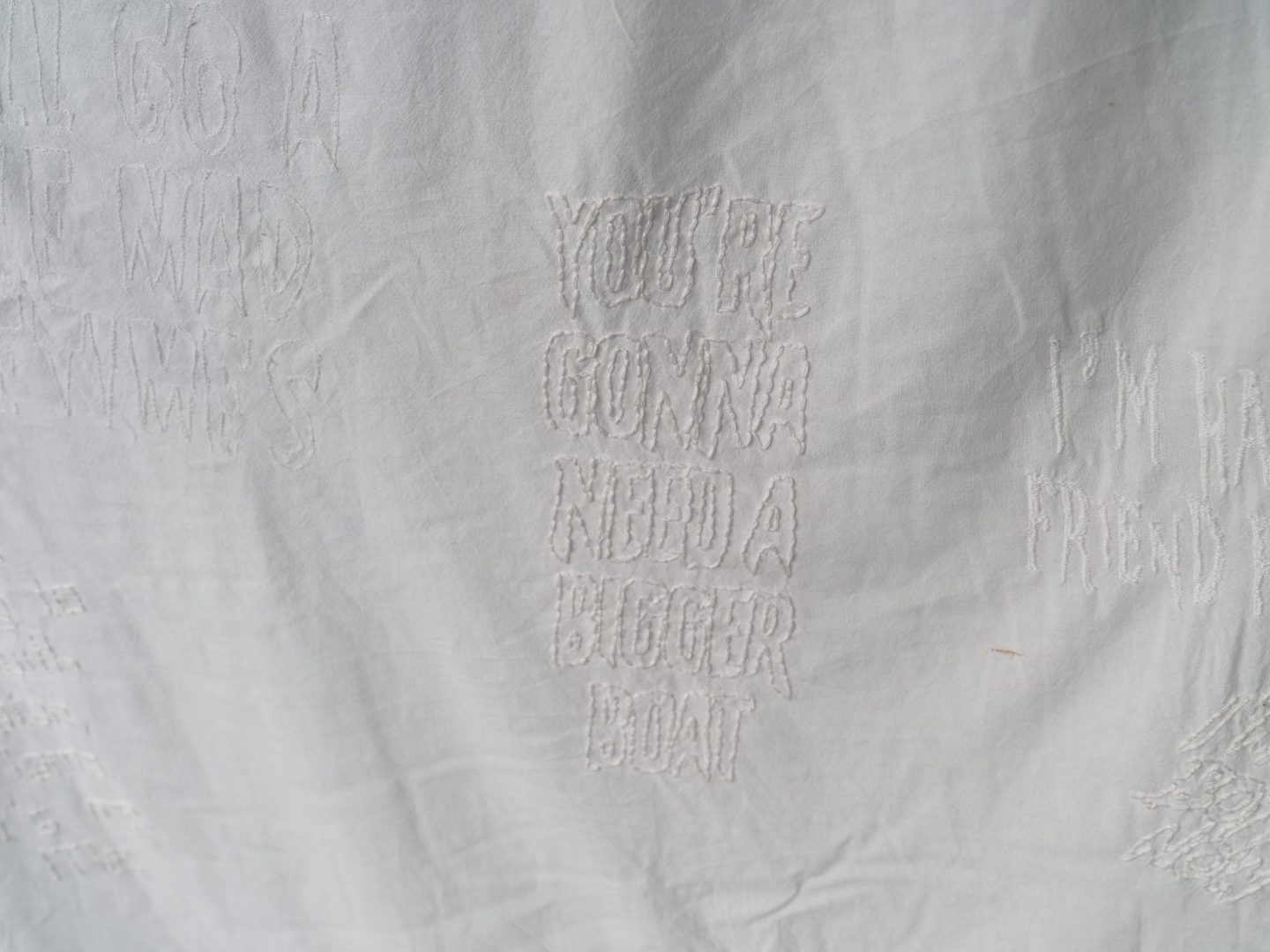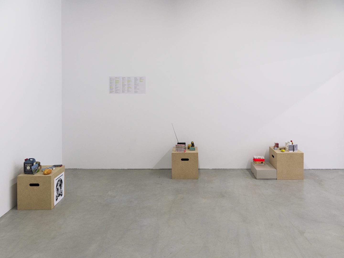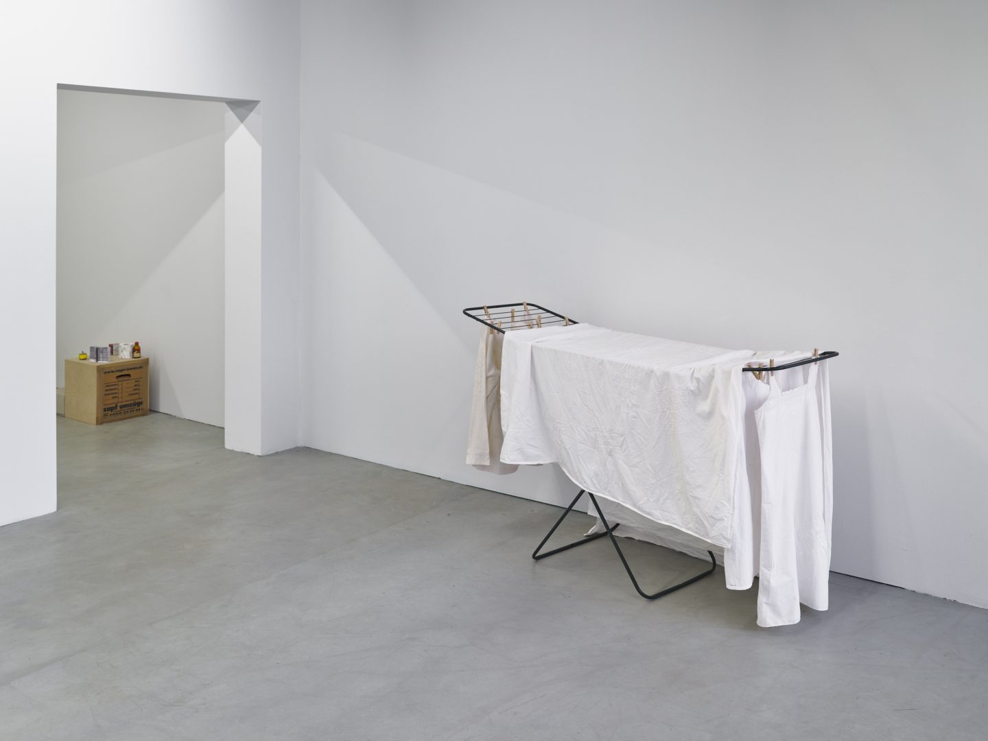 Im oberen Geschoss spielen einige Arbeiten mit dem Verhältnis von öffentlichem, repräsentativem Leben und dem, was sich im häuslichen Umfeld, hinter verschlossenen Türen abspielt. Wie zufällig abgestellt steht ein Wäscheständer von Sven Dirkmann mit einer weißen Bettdecke und einigen Kleidungsstücken vor dem Durchgang zu einem Kabinett. Der Stoff ist mit Zitaten aus Horrorfilmen bestickt, in denen Geborgenheit und Grusel gleichzeitig angesprochen werden. Im Raum dahinter stehen auf schlichten Sperrholzboxen kleine Stillleben aus gefundenen und gesammelten Objekten, die wie Charakterstudien oder gegenständliche Porträts von fiktiven Personen gelesen werden können. Zigarettenschachteln von Billigmarken, das Modell eines Plattenbaus, Medikamente, Miniaturmöbel, aber auch Spielzeuge und Postkarten zeugen von einer verblassten und leicht angestaubten Vergangenheit, die trotz der mitschwingenden Tristesse auch schöne Momente beinhaltet.
