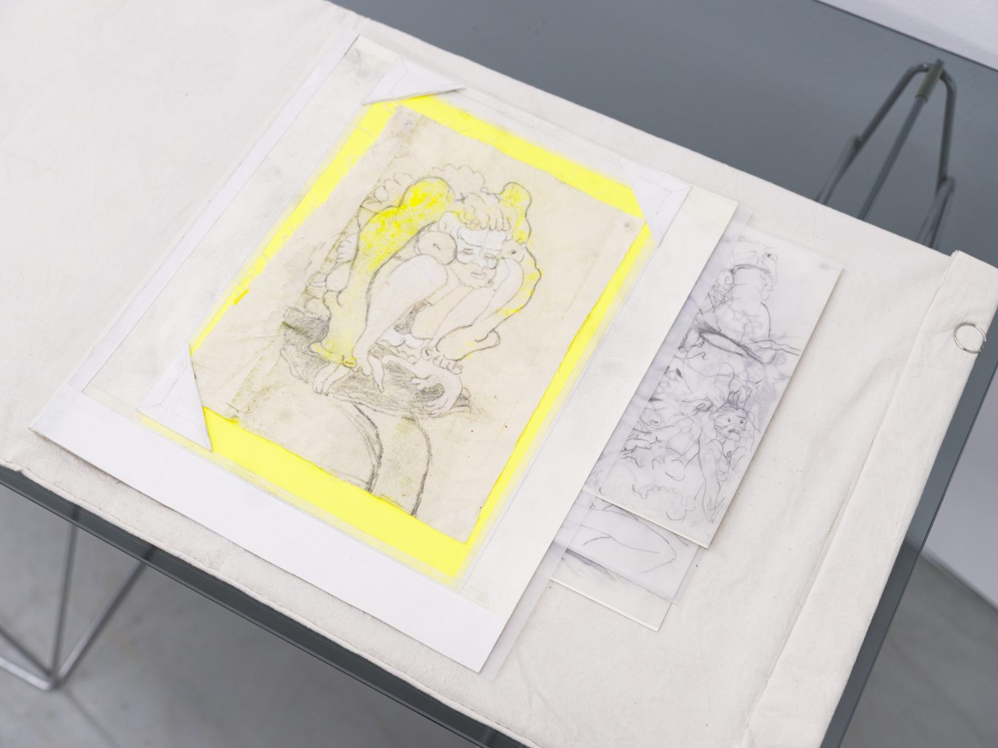 In den letzten Räumen der oberen Etage beschäftigen sich Flora Weber, Sophia C. Aiona Weische und Sonja Heim mit der Funktion von Rahmungen und Displays. Während Webers Zeichnungen von Dingen, die in Vitrinen und Schaufenstern liegen, in einem Arrangement aus Bilderrahmen ohne Glas gezeigt werden, wählt Weischer einen hölzernen Paravent als Präsentationsform für ihre Zeichnungen. In diesen interagieren nackte, geschlechtslose Personen in teils intimen und nahen Begegnungen, ohne sich dabei körperlich zu berühren. Und Sonja Heim nahm die scheinbar unmögliche Aufgabe auf sich, einen 400 Kilo schweren Marmorsockel aus dem Depot der Sammlung in den ersten Stock hieven zu lassen, um ihn zum Zentrum einer Installation zu machen, die dem Verhältnis von angewandten, dekorativen Techniken, DIY und „hoher“ Kunst nachgeht.