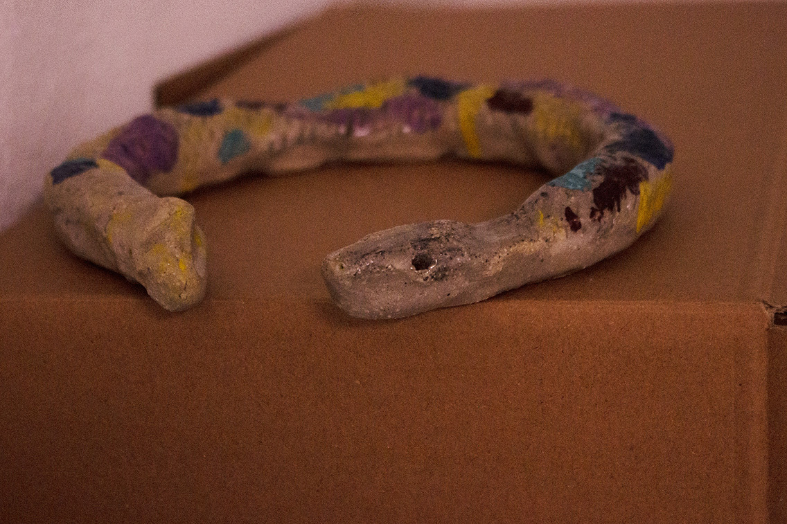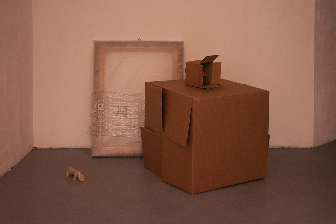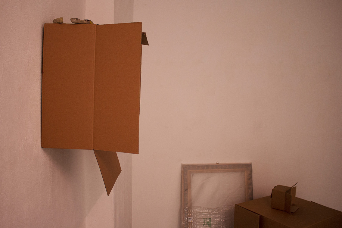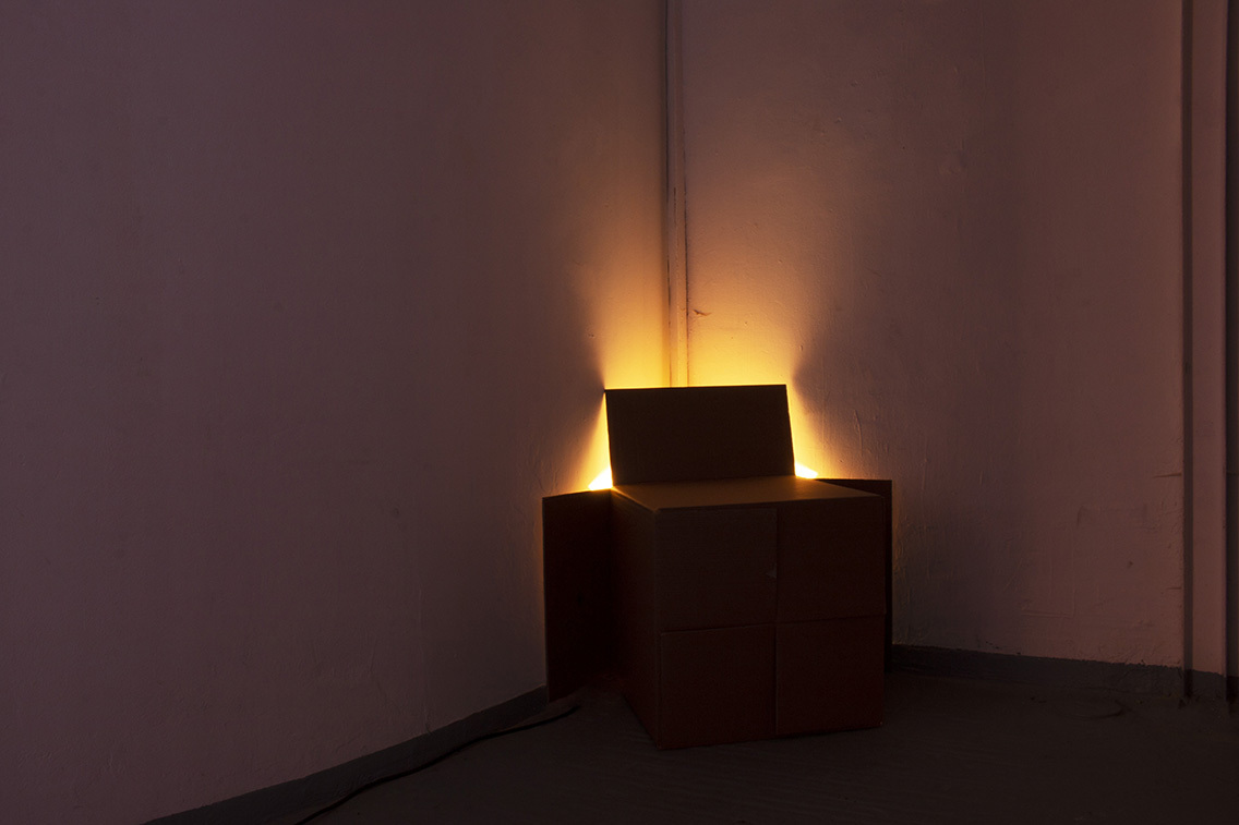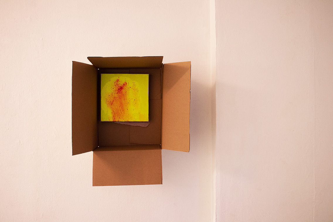 Nevertheless, there are also deviations from the implemented norm. The scattered boxes lying on the floor or carelessly hung on the wall seem at a first glance to be the leftovers of a chaotic shopping spree. However, when opened, they reveal unanticipated contents that mock our expectations and curiosity.