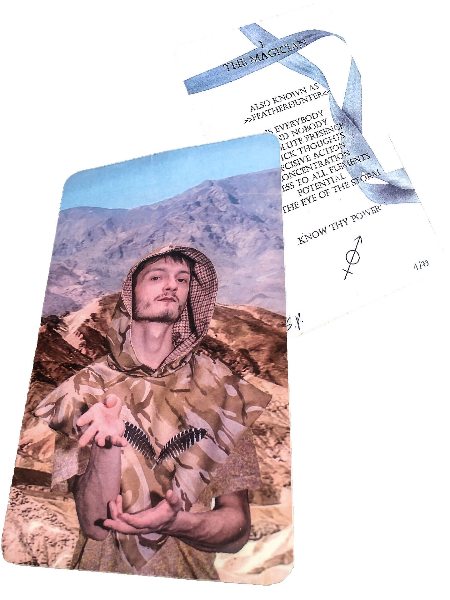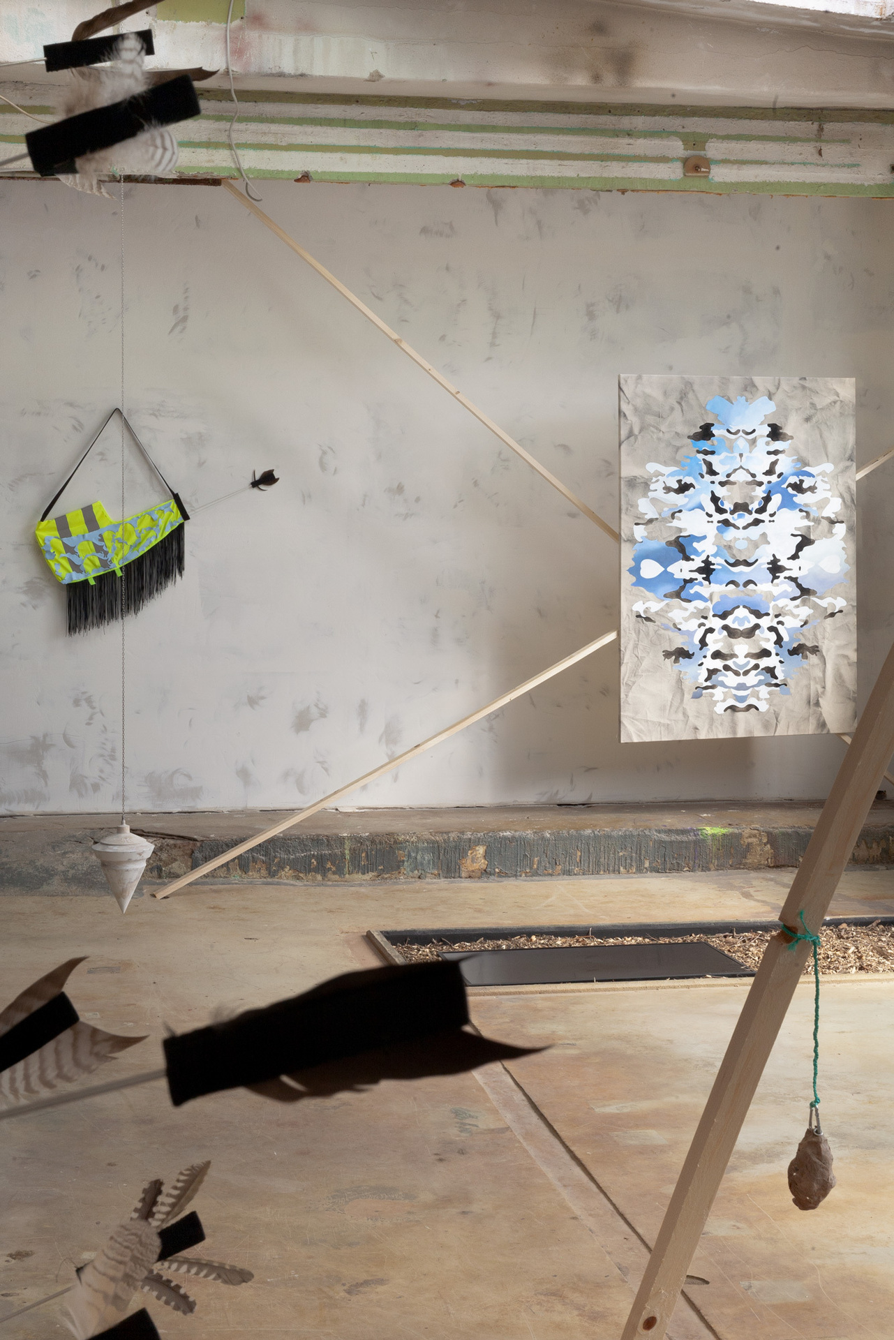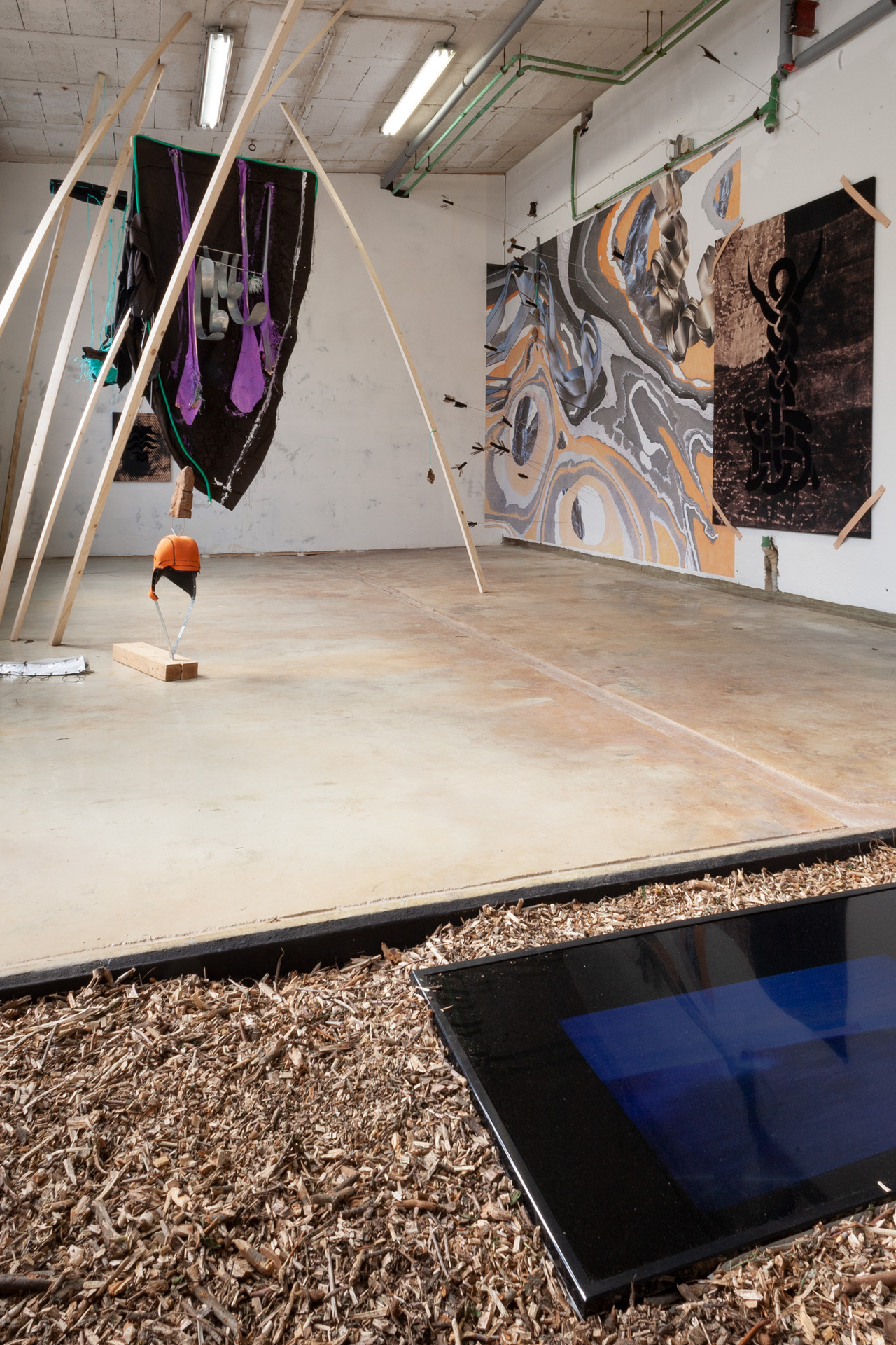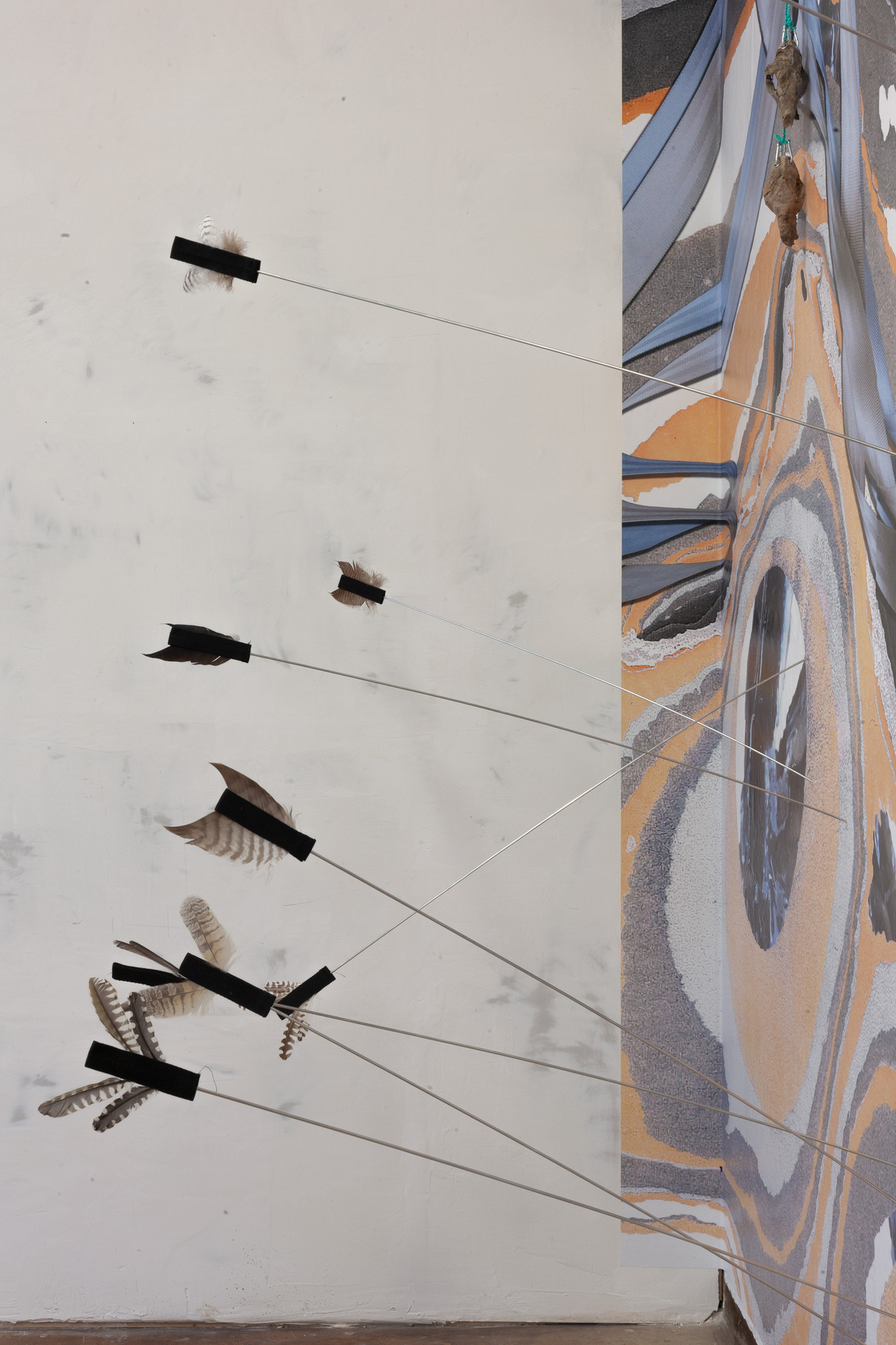 At Wie oft noch Julian Westermann and Sabrina Podemski create a physical situation showing objects, signs and traces of a provisoral transmutation - a moment seemingly out of time within a transformative process. The two artists intertwine their identities, revealing a symbiotic world. Out of it rises the magician [family of the featherhunters] - an avatar from the limbus of past and future. The collaborative video E.V.O.L Prophecy shows him as a creature between worlds.