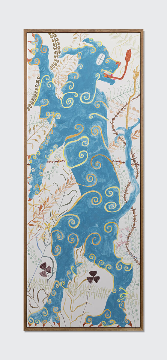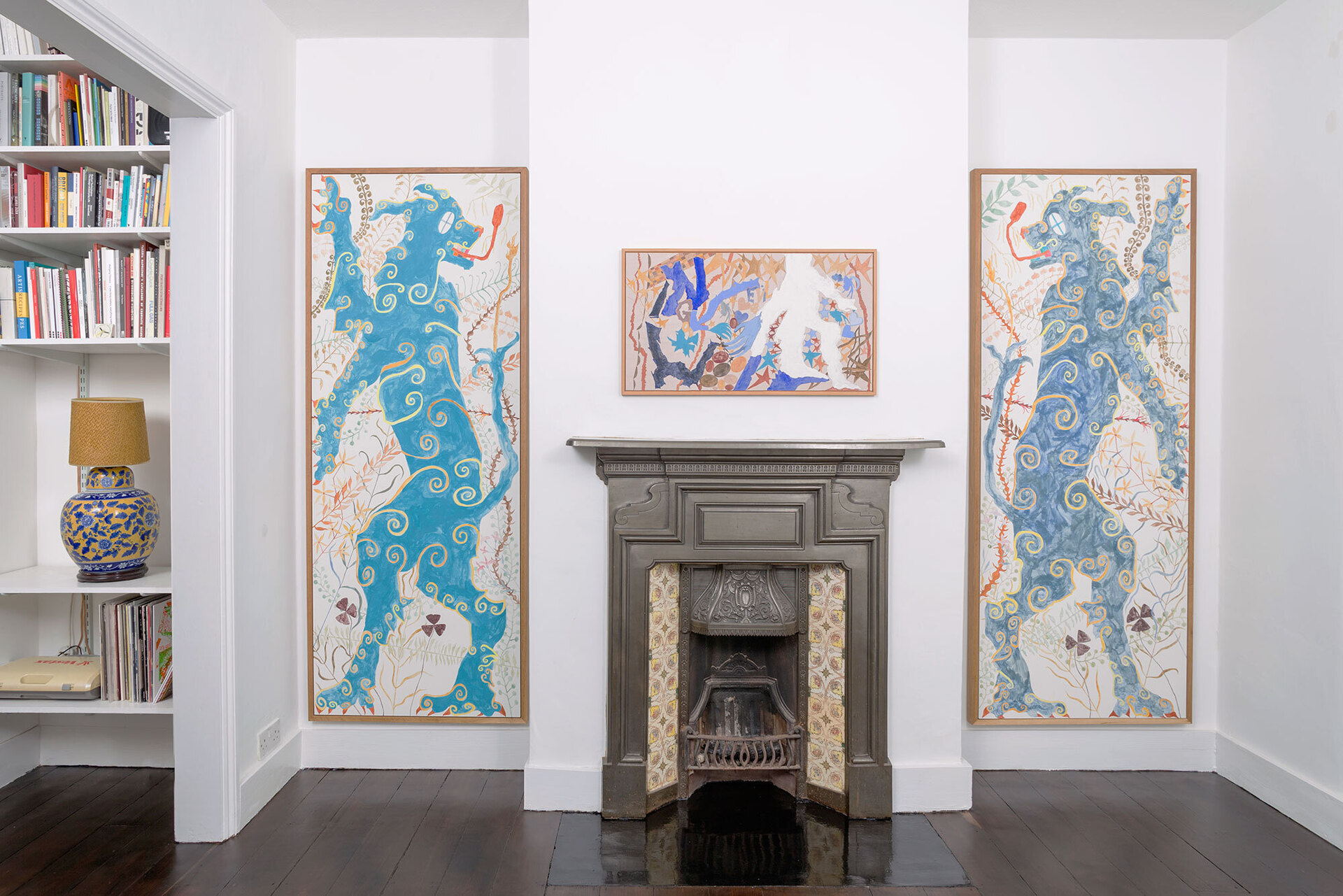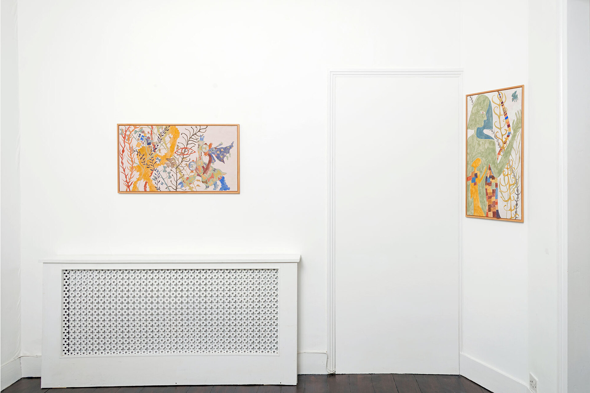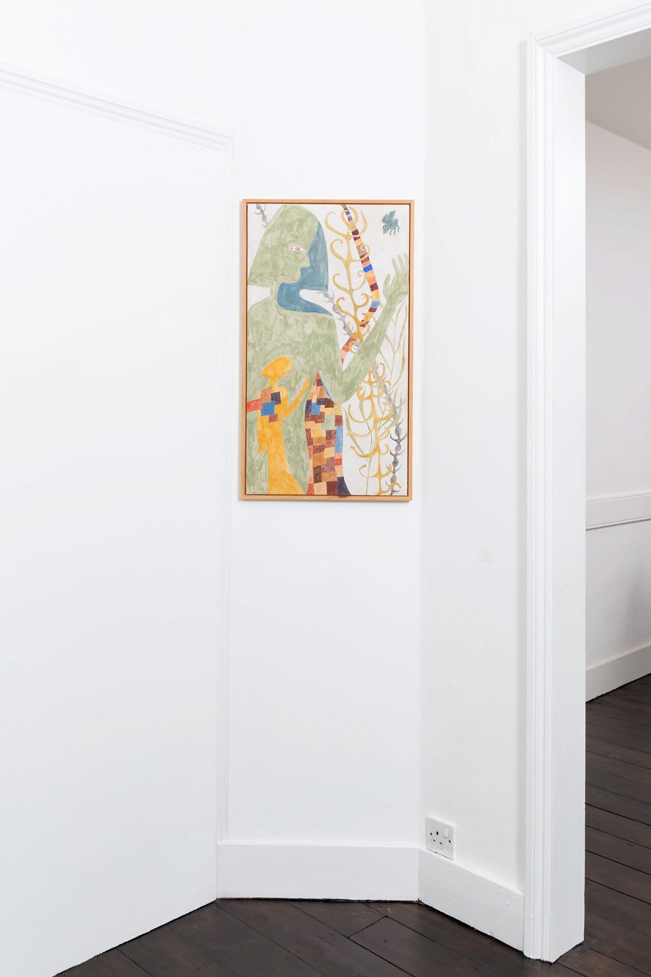 The paintings in Reflexivity are densely populated by plants and mysterious figures giving the impression of snippets of dreams or of outpourings of a rich inner life.There is a rebus-like quality to the works that seems to suggest they can be solved by trying to decode their floating sequences of words, symbols and goofy characters. At the centre of the show are two tall paintings of dogs in heraldic postures mirroring each other while also towering over the viewer. They are breaking with the otherwise dreamy and ambiguous atmosphere of the show quite resolutely. Traditionally meant to be the supporters of a coat of arms or a battle cry, there is a feeling of misplacement in their vigour and focussed attention within the calm domestic setting. A contrast that feels humorous and perhaps familiar after a year spent in a bubble of reduced activity and introspection.