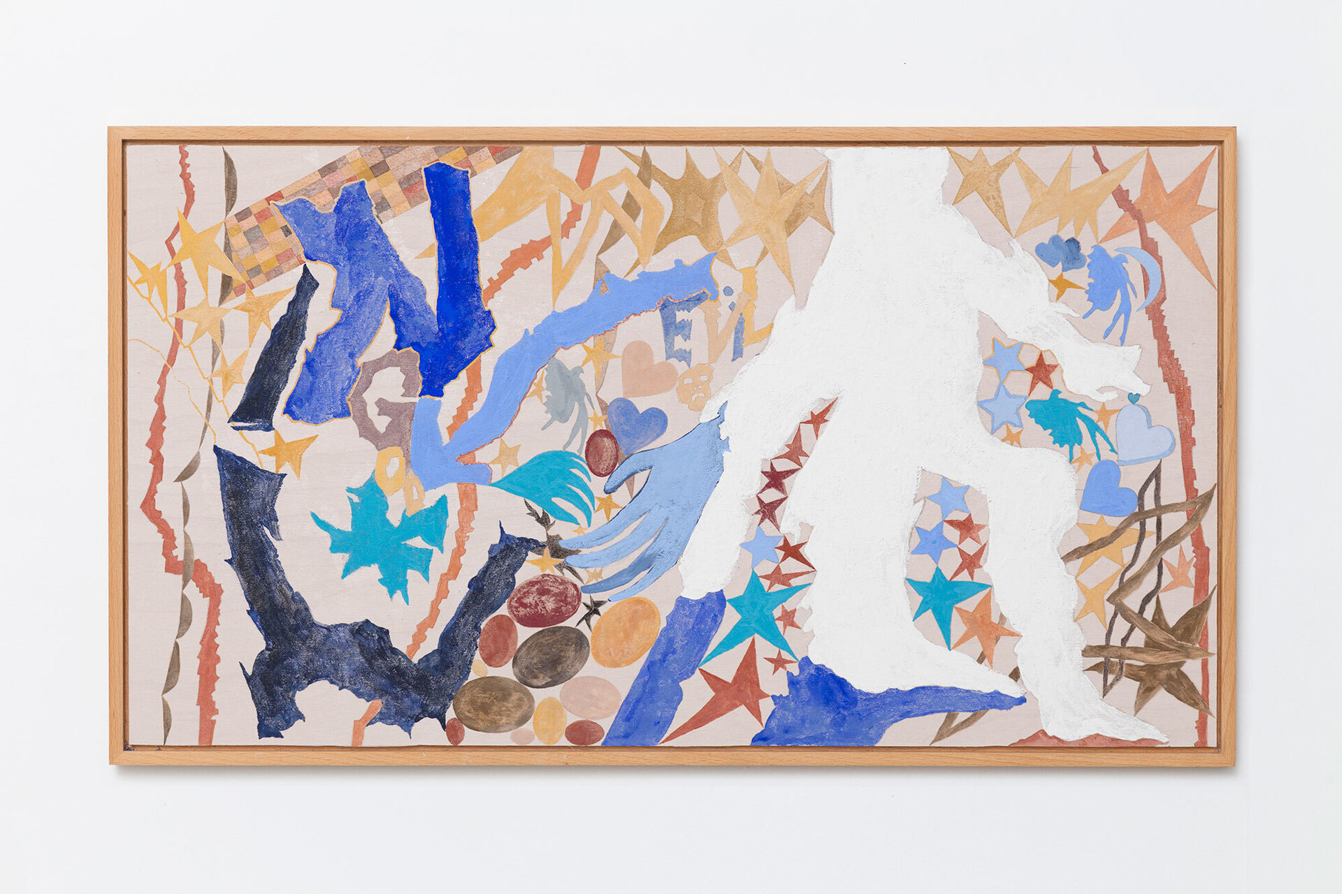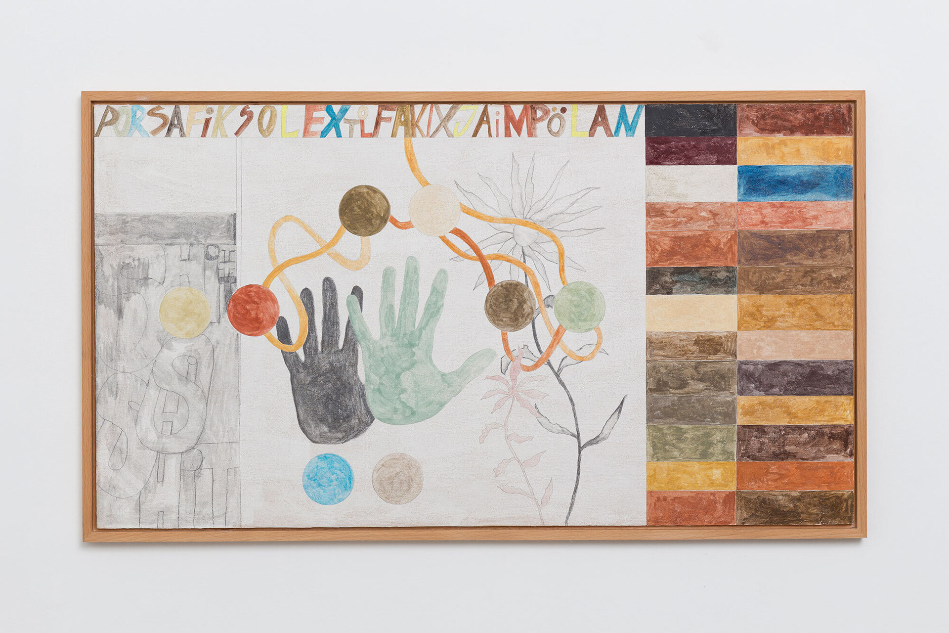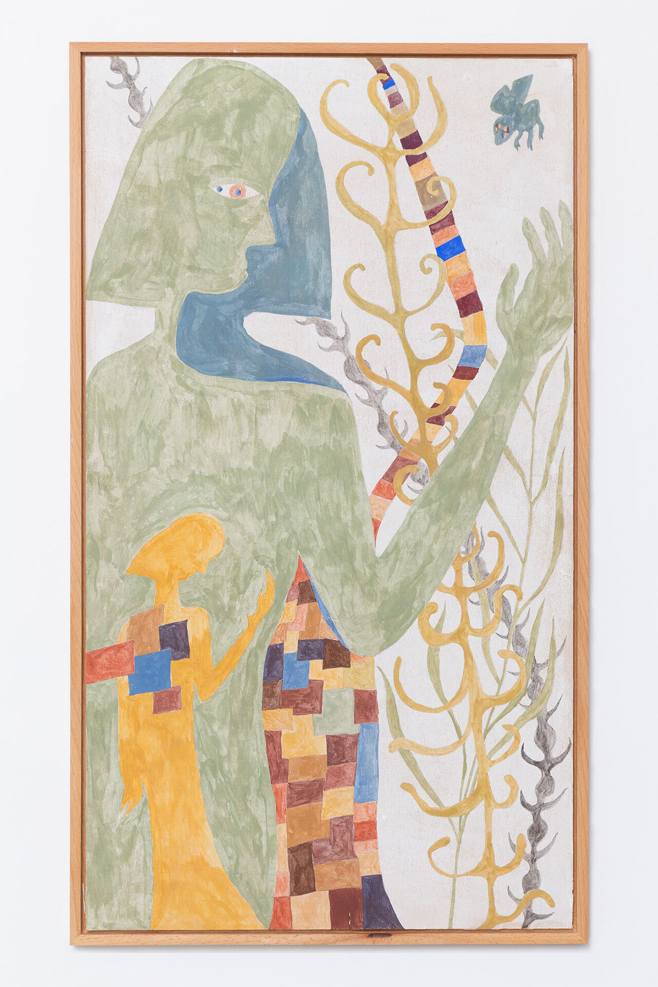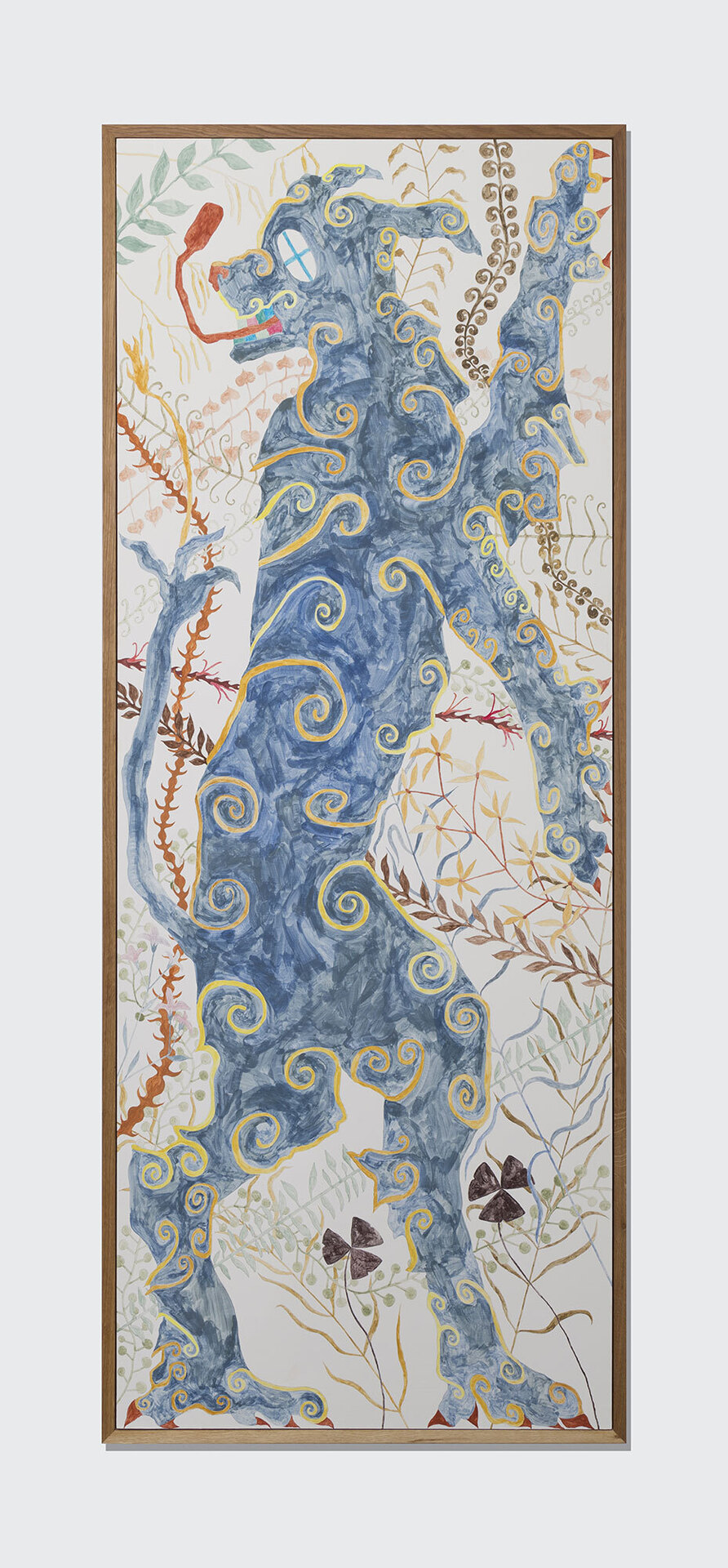 The paintings in Reflexivity are densely populated by plants and mysterious figures giving the impression of snippets of dreams or of outpourings of a rich inner life.There is a rebus-like quality to the works that seems to suggest they can be solved by trying to decode their floating sequences of words, symbols and goofy characters. At the centre of the show are two tall paintings of dogs in heraldic postures mirroring each other while also towering over the viewer. They are breaking with the otherwise dreamy and ambiguous atmosphere of the show quite resolutely. Traditionally meant to be the supporters of a coat of arms or a battle cry, there is a feeling of misplacement in their vigour and focussed attention within the calm domestic setting. A contrast that feels humorous and perhaps familiar after a year spent in a bubble of reduced activity and introspection.