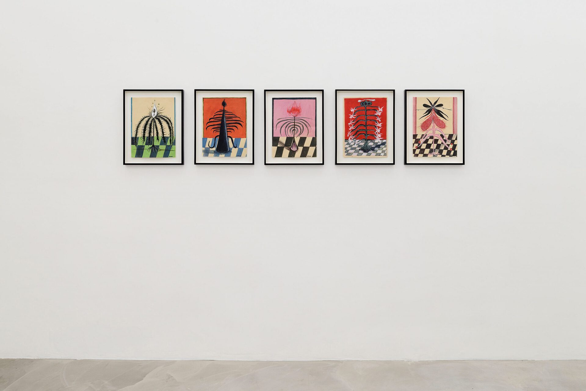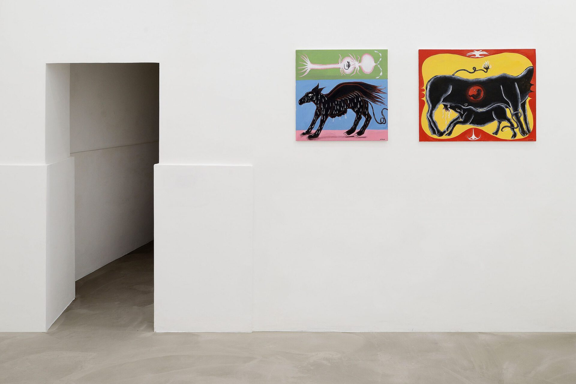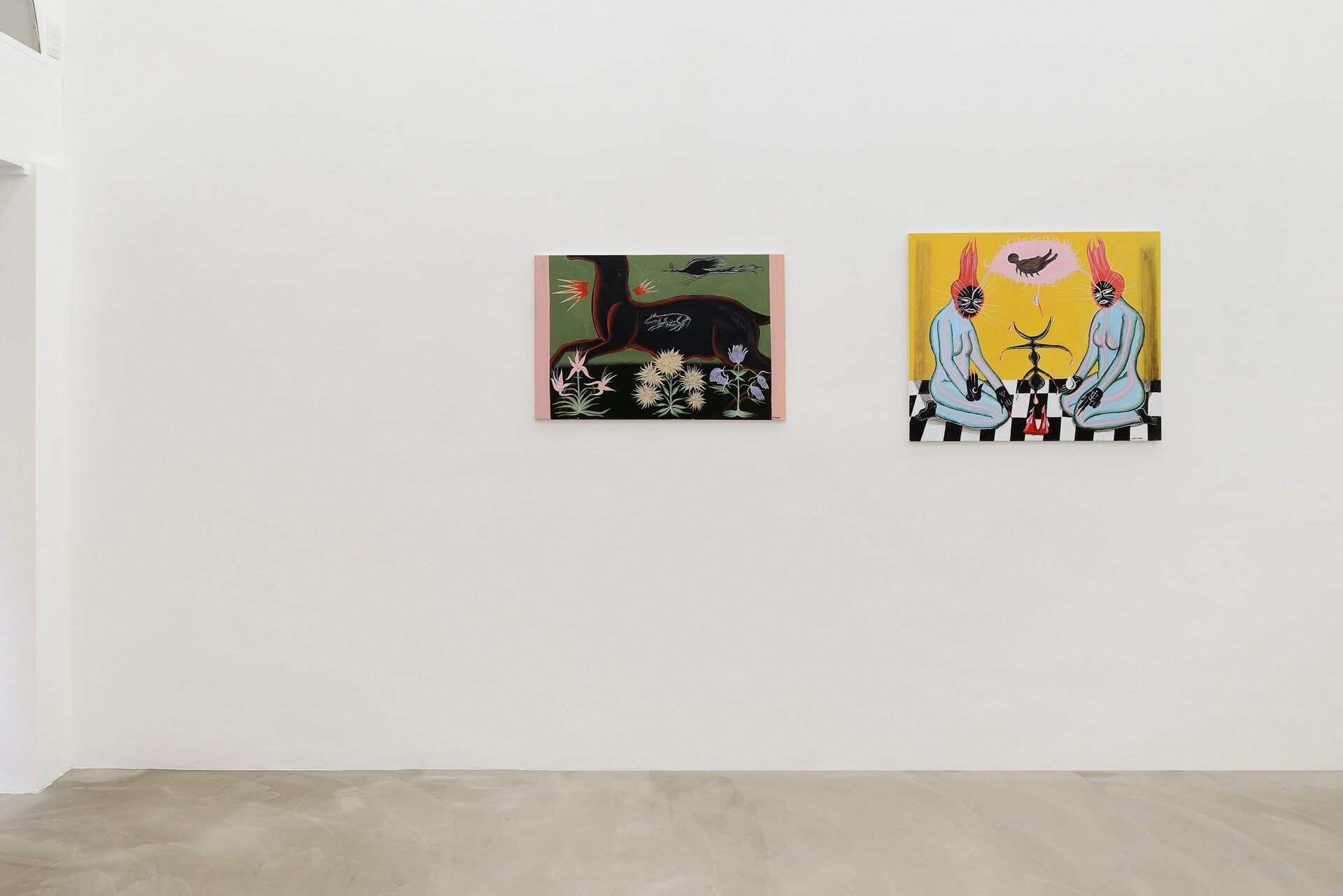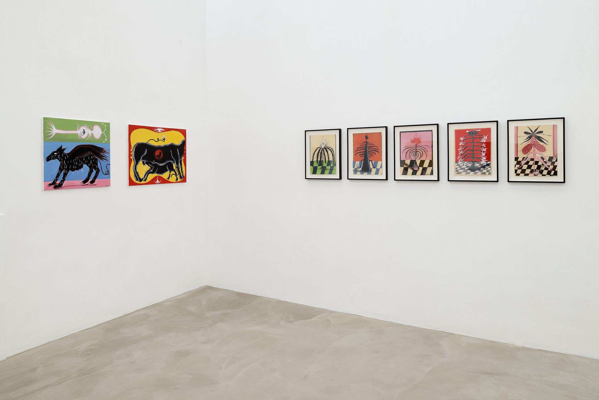 Hymn of Creation is borrowed from a poem in the ancient Sanskrit scripture, the Rig Veda, that speculates the scientific and metaphysical origins of our Universe. In the alternative world of Pandey’s paintings, human and more than human life forms, collaborate in the process to create new life. Through these works Pandey attempts to bridge insights from mythology, spirituality, nature and technology to generate a dialogue that imagines a non-linear approach towards creationism of both the body and consciousness and unfold narratives foregrounding interspecies collaborations and imagine symbolic and miraculous futures.