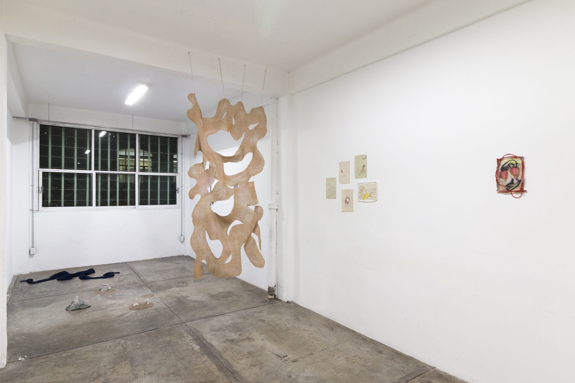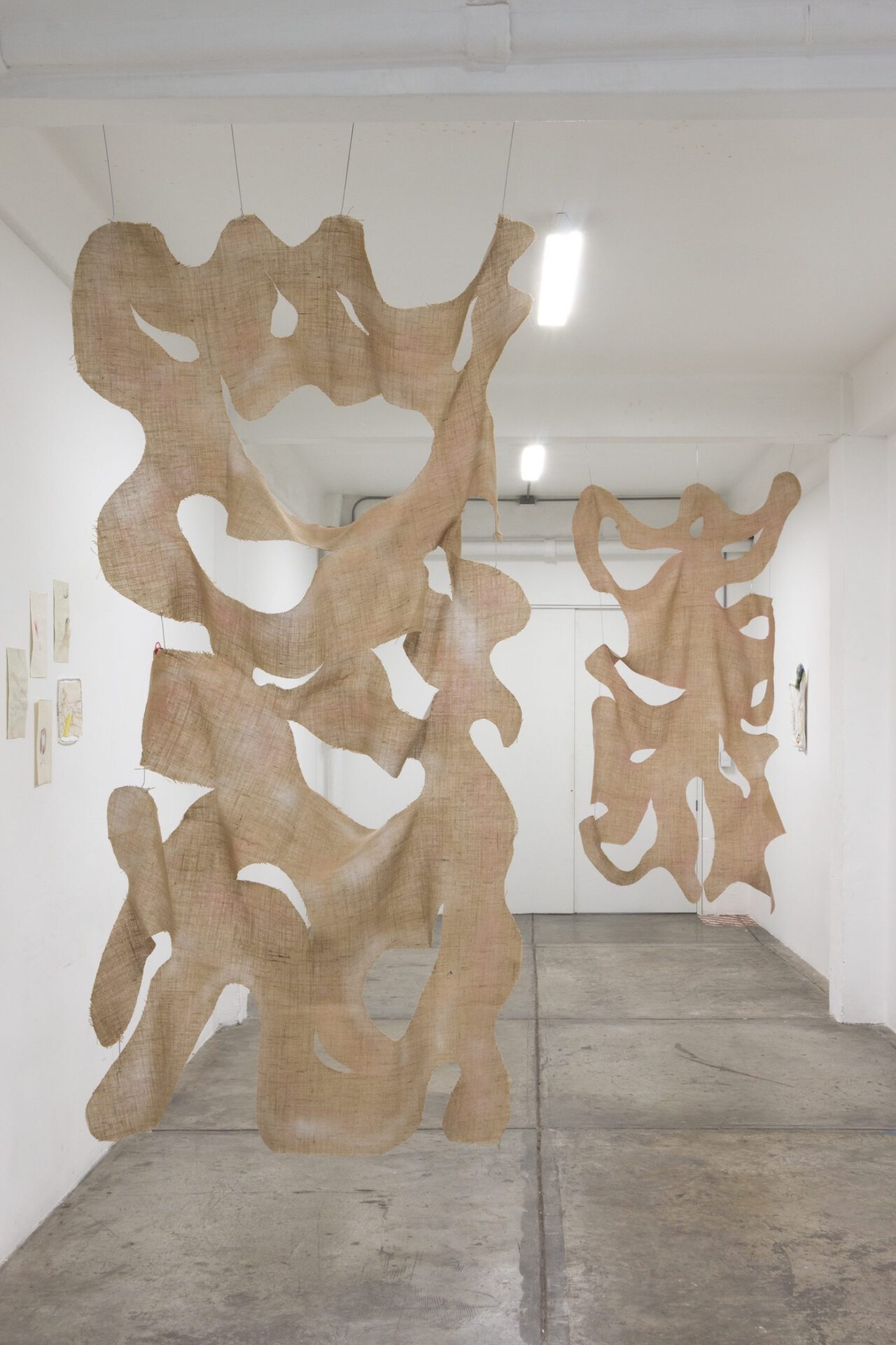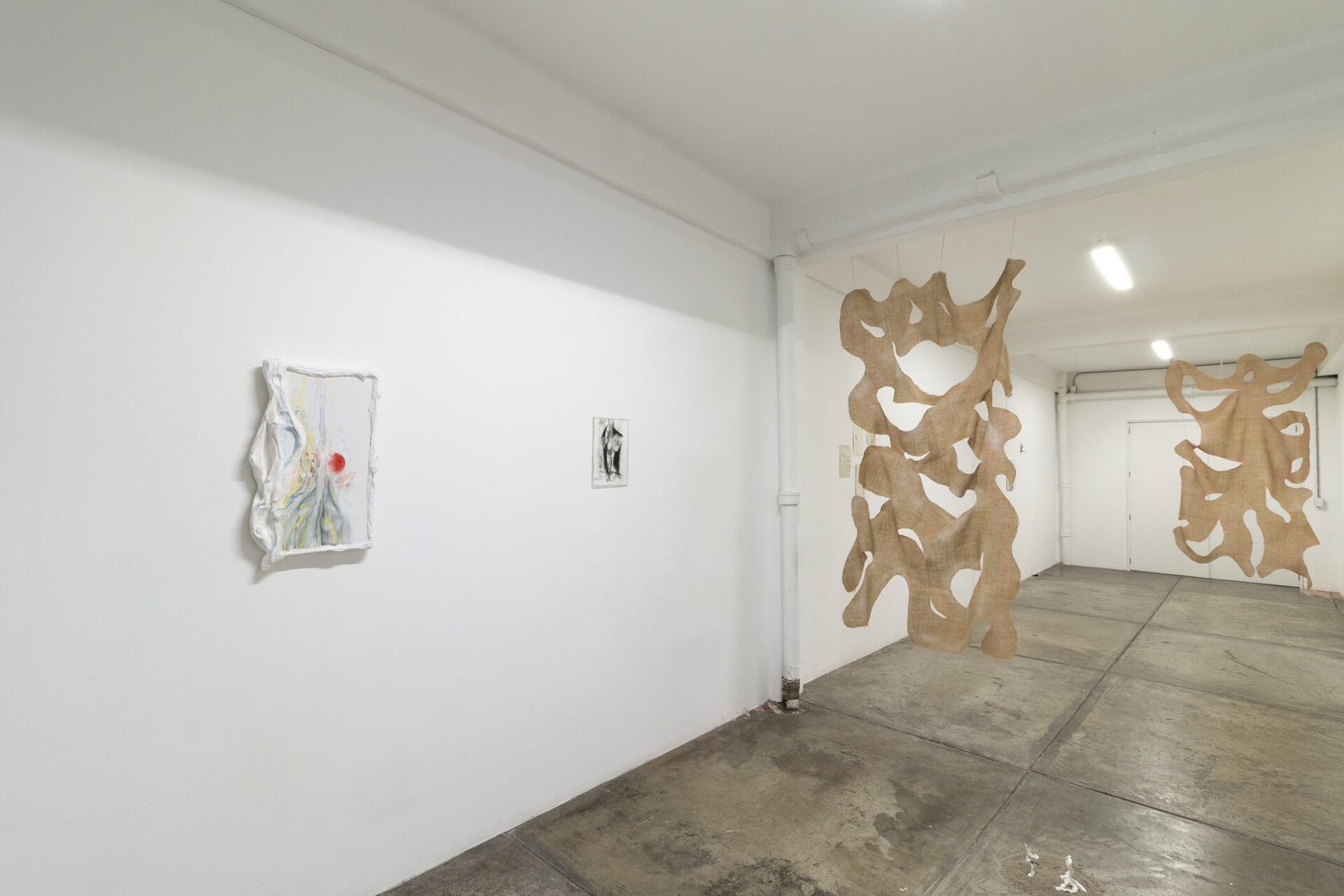 Together they initiated a specific dialogue between their works while collaborating for the first time. The studio exhibition contains sculptural details made of plaster, sand and remastered ready mades that contextually engage with the oil paintings. The paintings blur the boundaries between painting and sculpture. The hanging cut-outs made of jute mark a fluidity and fragility which can also be observed in the small sized drawings. The artists worked site specifically and also included materials found through in their cultural research while being in Mexico City.
