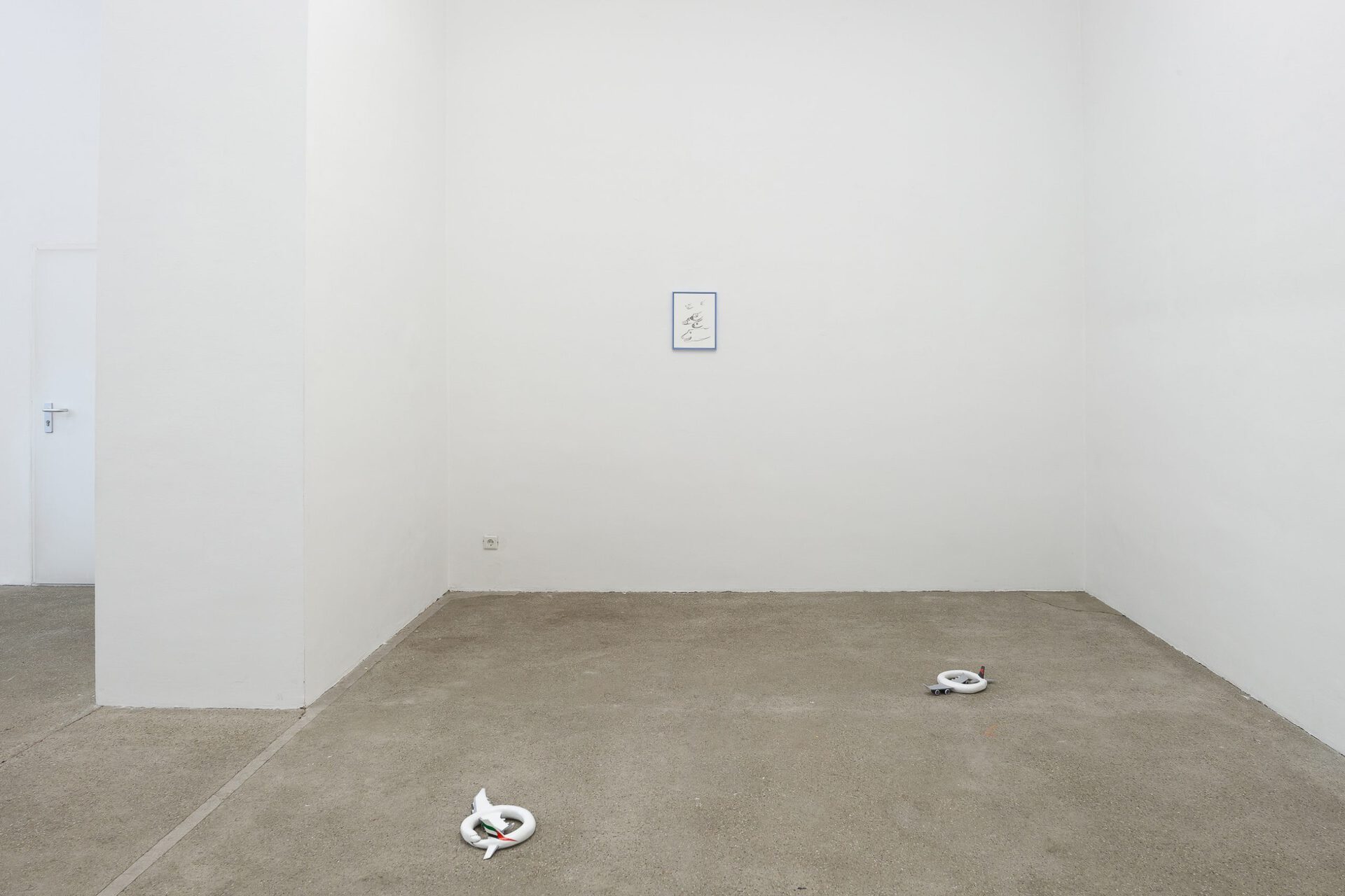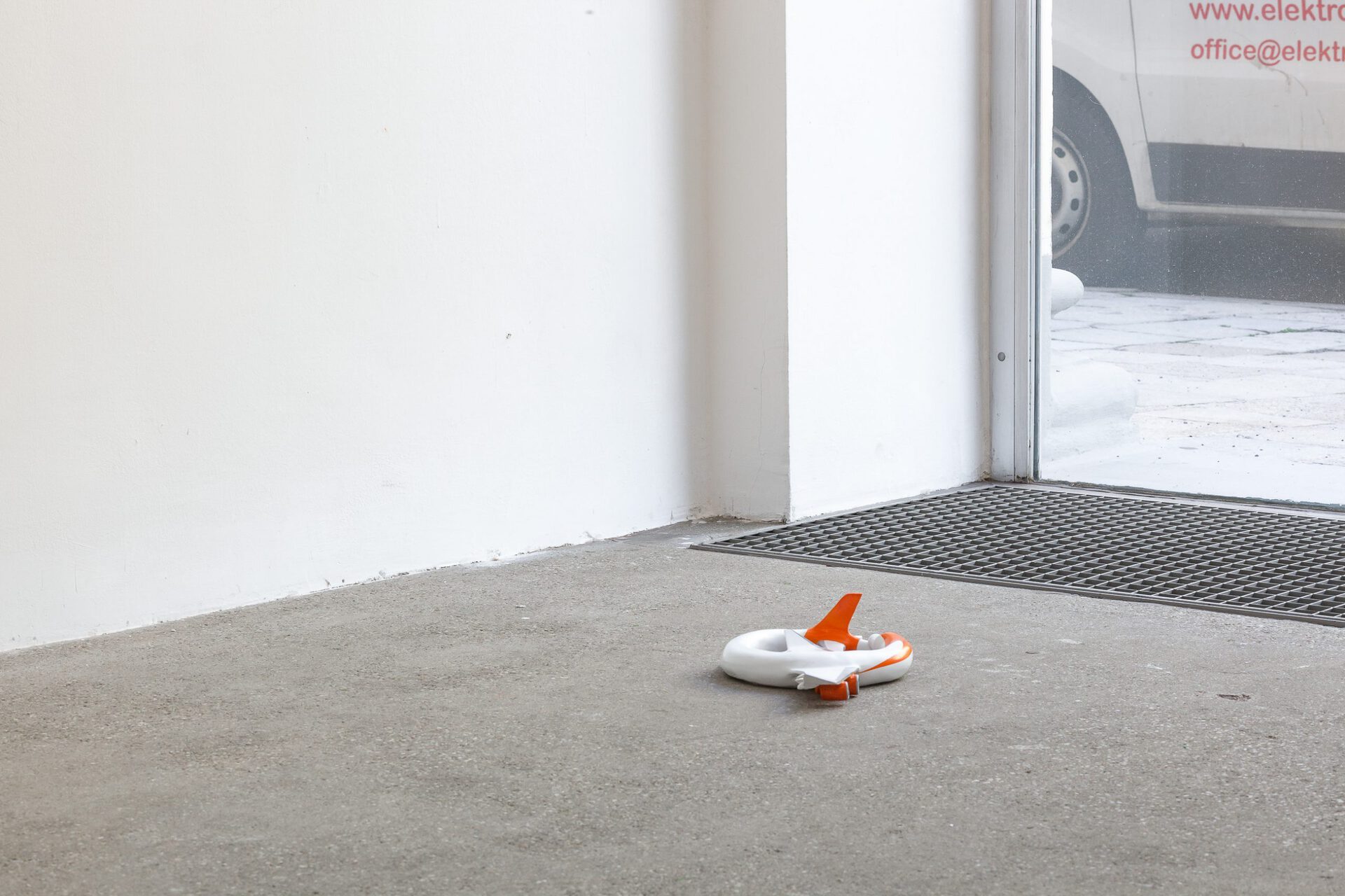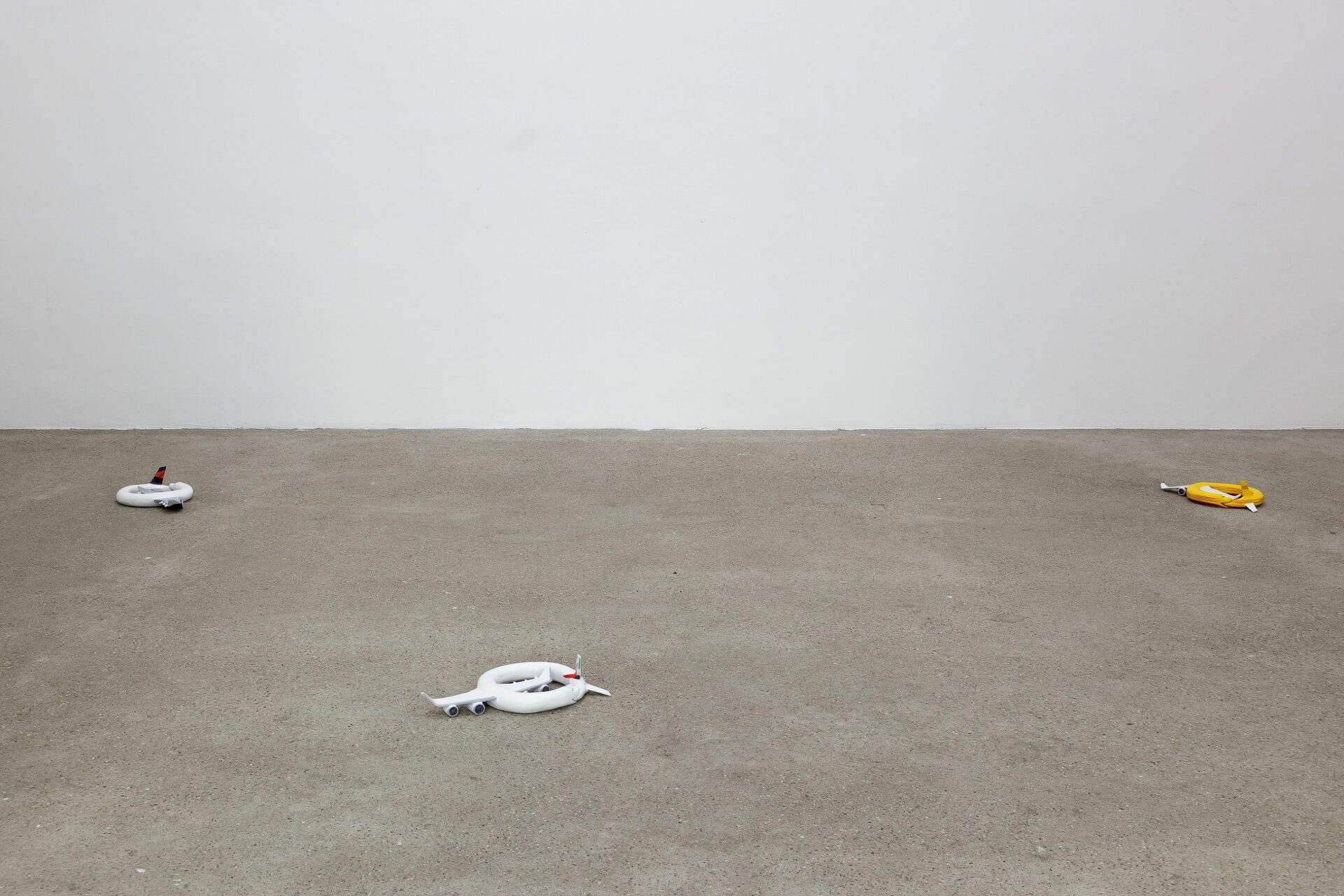 The motif of playful intervention is also reflected in the colourful sculptures scattered on the ground. Model aeroplanes painted in the corporate identity of major airline companies take on the circular form of the ouroboros; the snake that bites its own tail. In the holistic form of the ouroboros, opposites are united as everything is encased in it. The sculptures thus become hybrids of machine and animal in the bright camouflage of consumerism, endlessly incorporating the inseparable connection between industry, the environment, and responsibility.