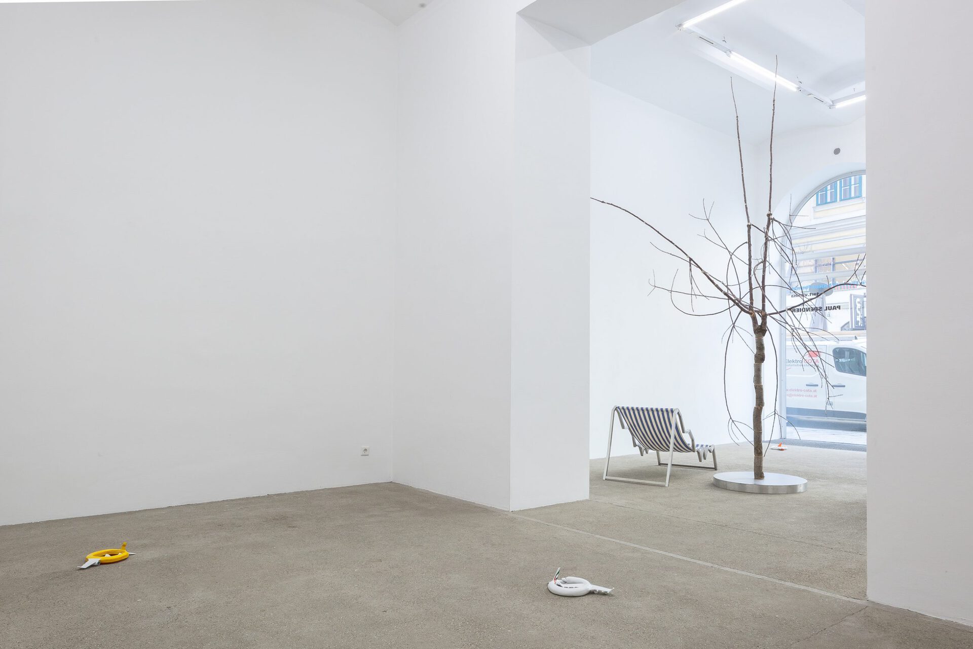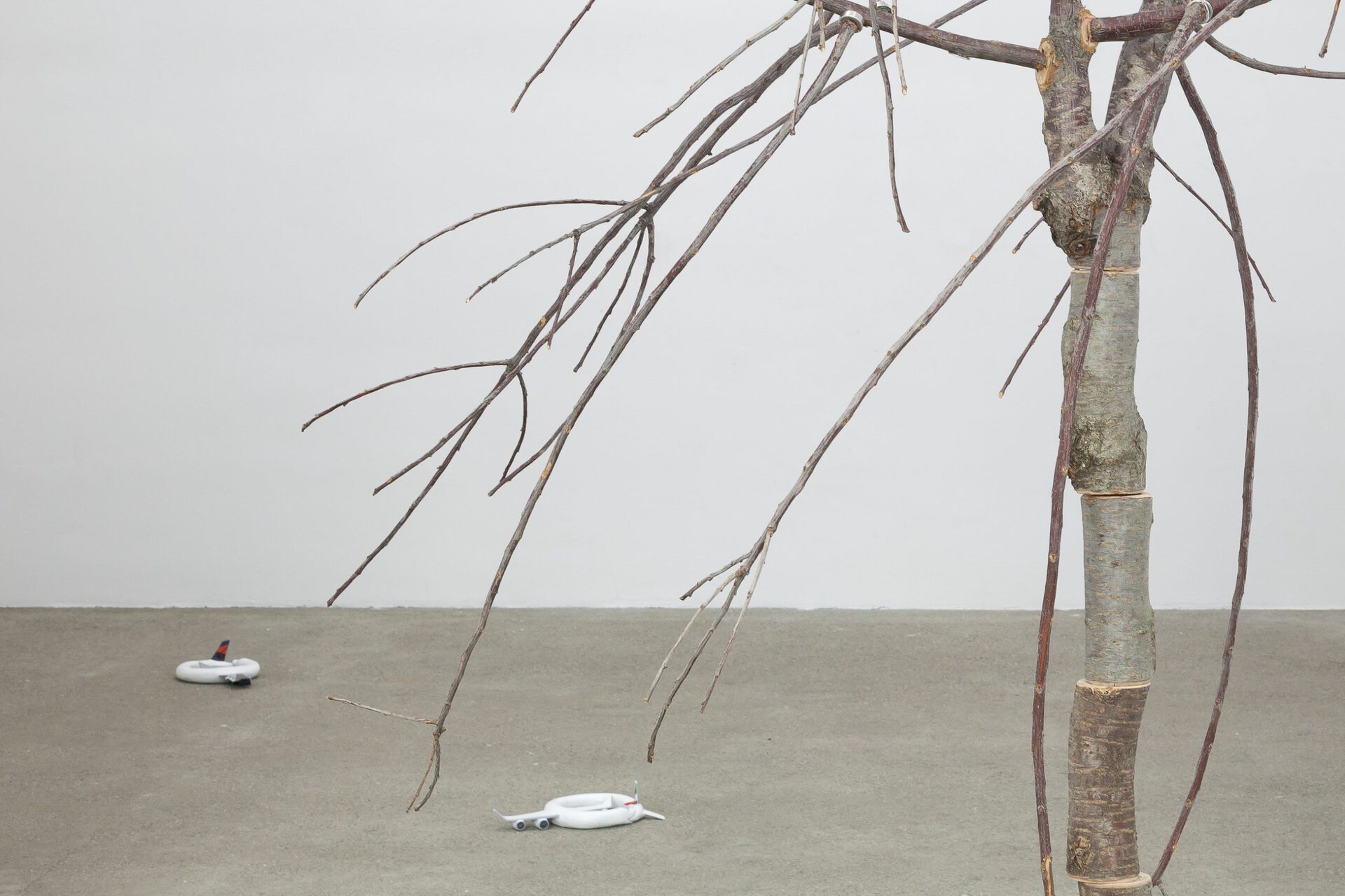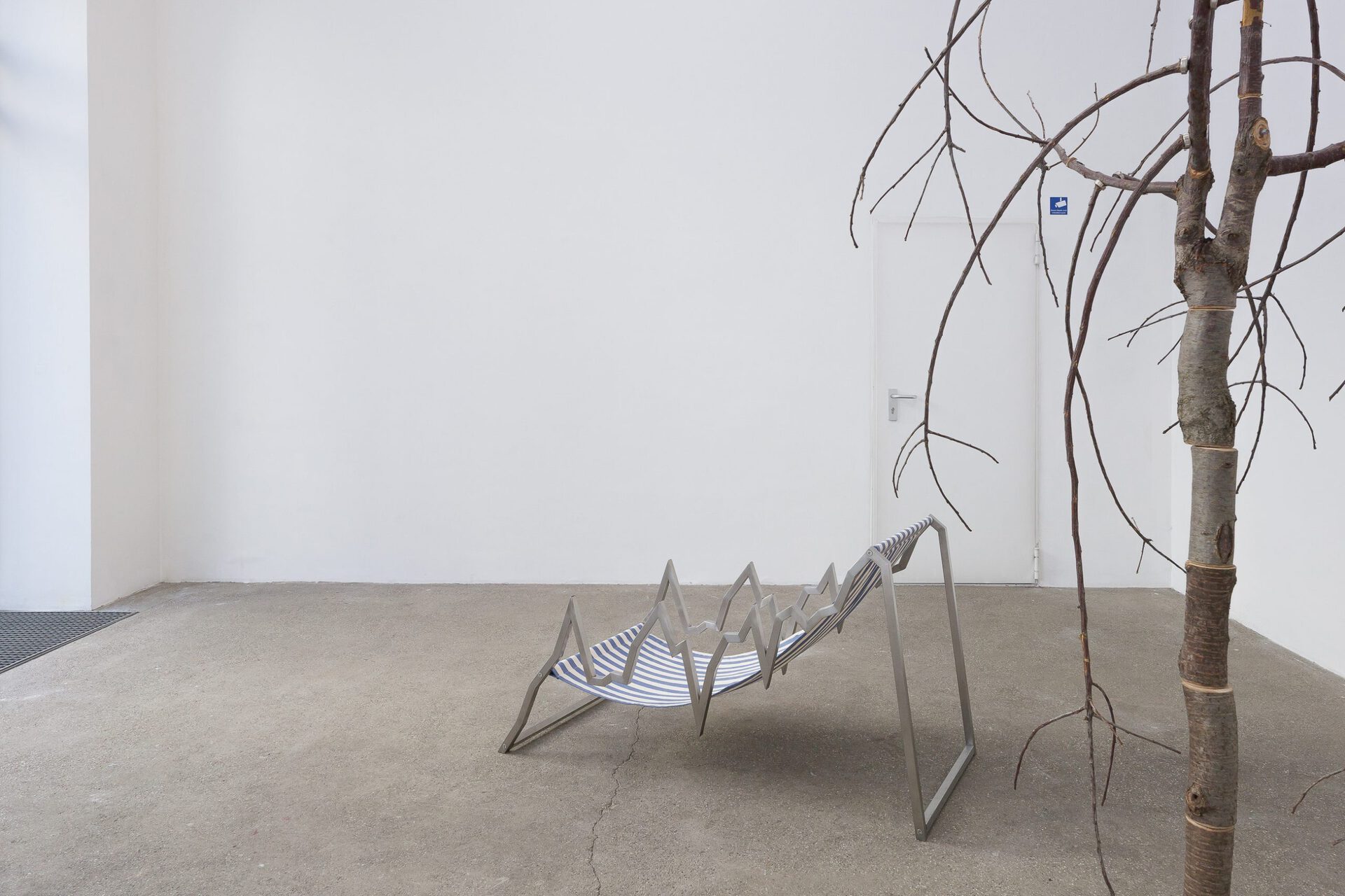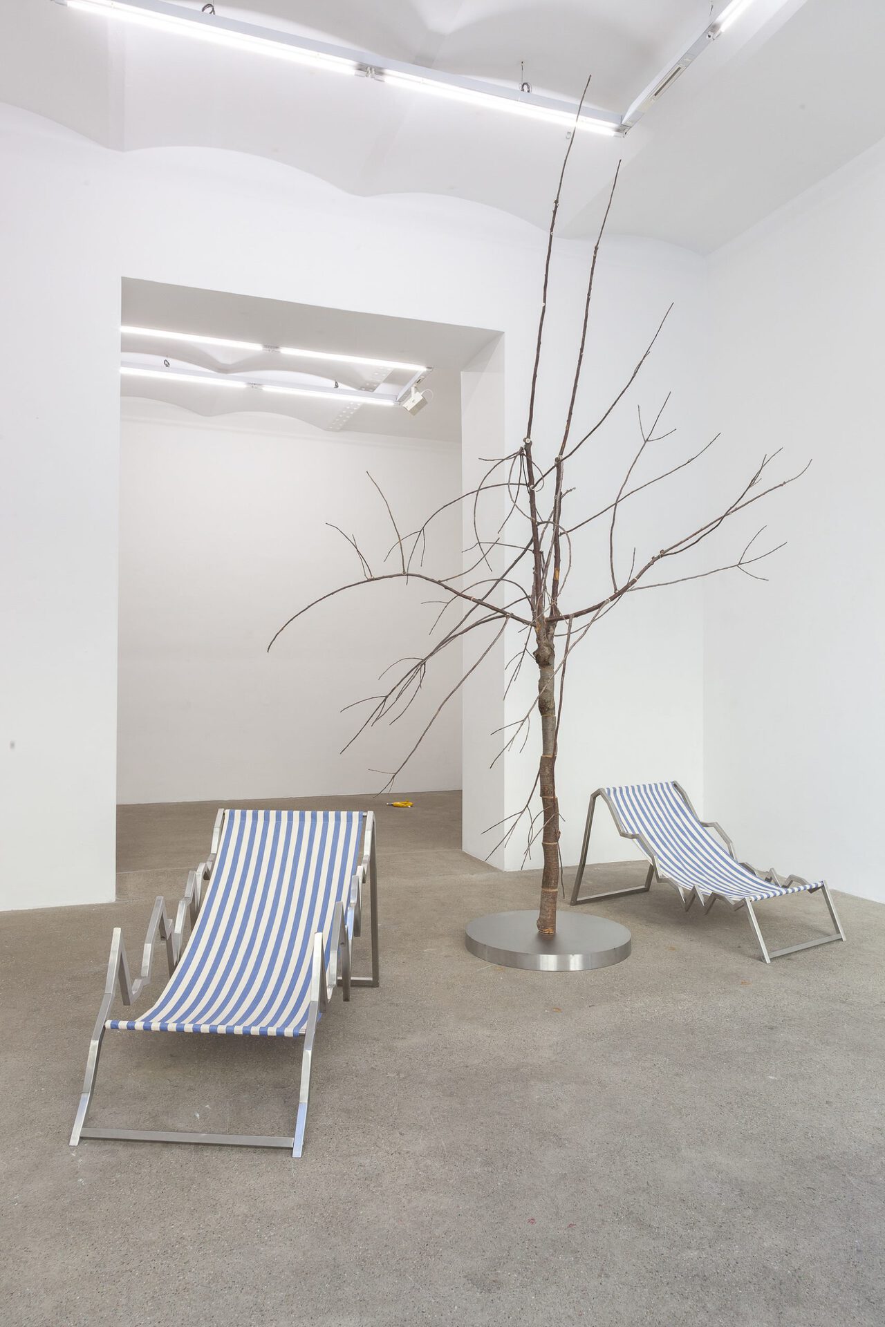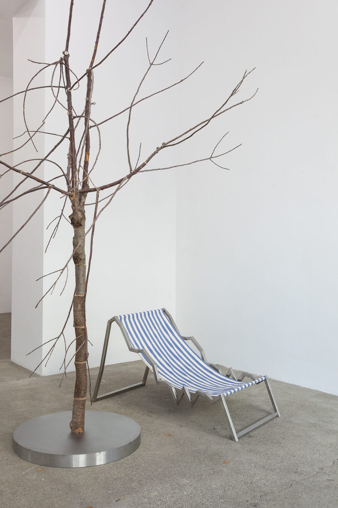At first glance, the space suggests a picturesque holiday image that evokes our collective desire for wellness. But on closer inspection, the sterility of the landscape, manifesting itself in steel, branchwood, and plastic, resembles a rather dystopian imitation thereof—what is authentic about this natural environment anyway? Seasonal Depression unfolds, dismantles, and reconnects our ironclad notions of the binary oppositions natural-artificial, individual-collective, and real-authentic.