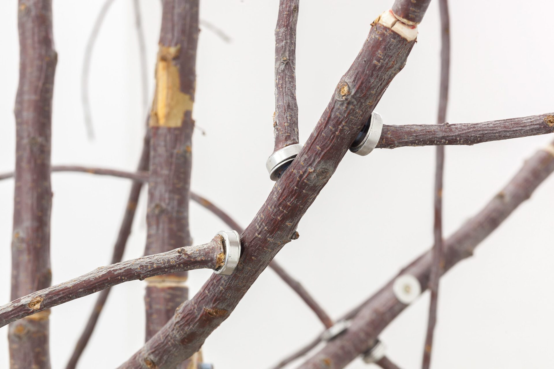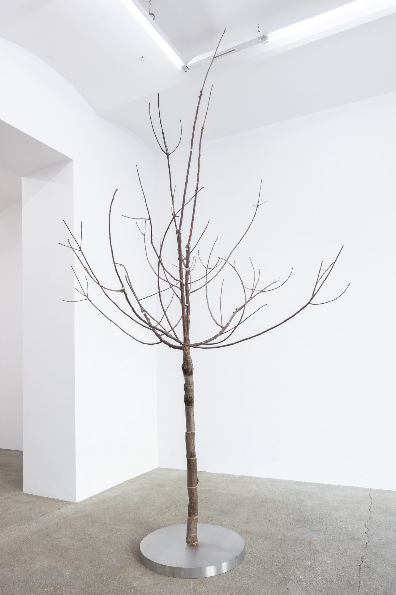 The discourse around our current era, the Anthropocene, addresses the irreversible intervention of humans in their environment that has been fuelled by capitalism and colonialism. However, the notion of a pristine nature has always been fallacious: “The evolution of our “selves” is already polluted by histories of encounter; we are mixed up with others before we even begin any new collaboration”, writes Anna Lowenhaupt Tsing in The Mushroom at the End of the World. The cherry tree placed in the centre of the space loses its ability to change, which humans take over from now on. Thanks to magnets and screw caps, it is dead easy to take the tree apart using the building-block concept, just to put it back together again according to individual preferences. Here, nature is completely subjected to the visions of the rational homo oeconomicus who wants to conquer and dominate it, while at the same time does not want to recognise himself as part of it. The cherry tree rests on a pedestal made of stainless steel, which uproots it from its surroundings and turns it into an aestheticized reminder of the illusion of unruly nature. When trying to capture a piece of nature in a certain moment, any possibility of symbiotic collaboration is denied, which ultimately results in the subjugation of the environment.