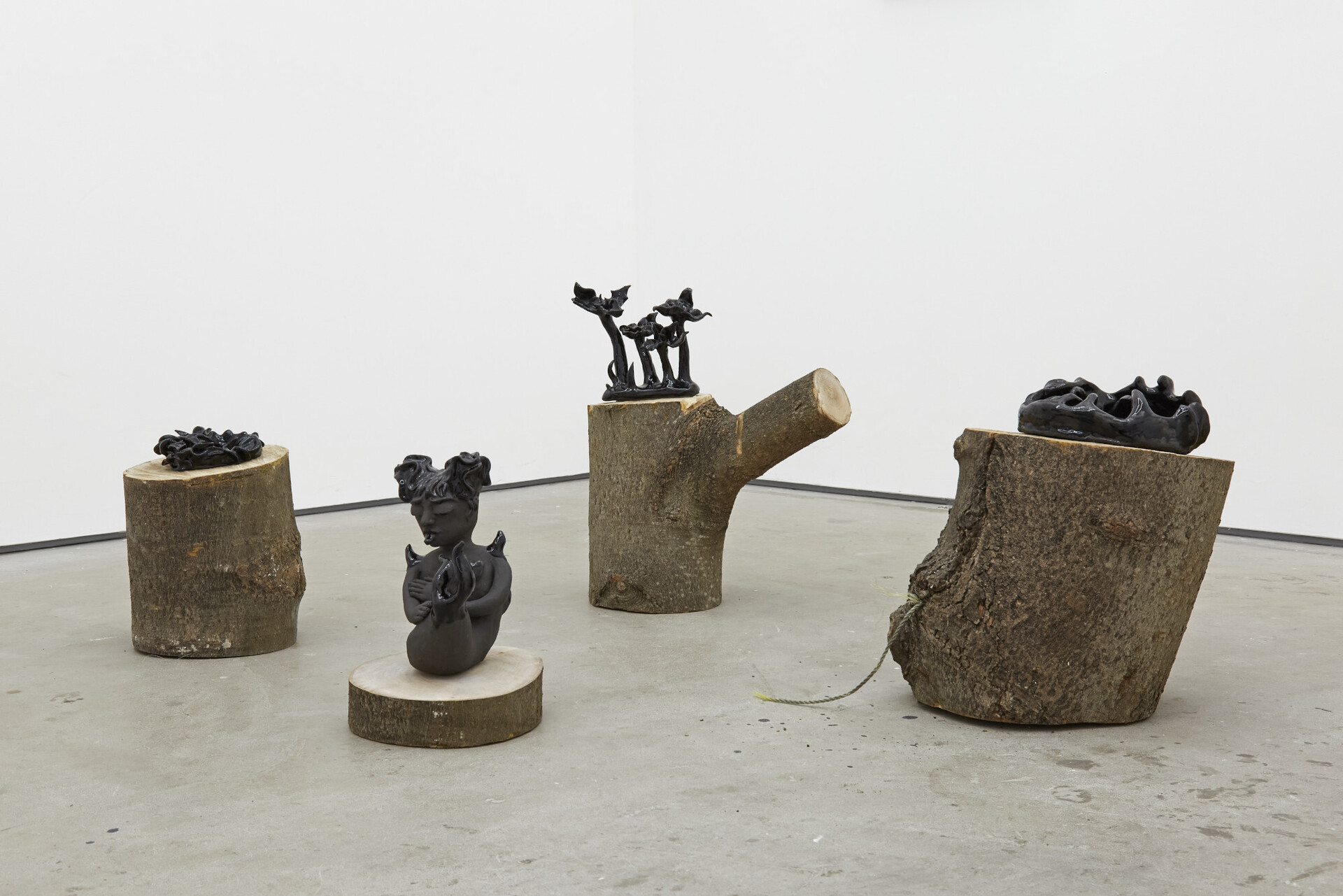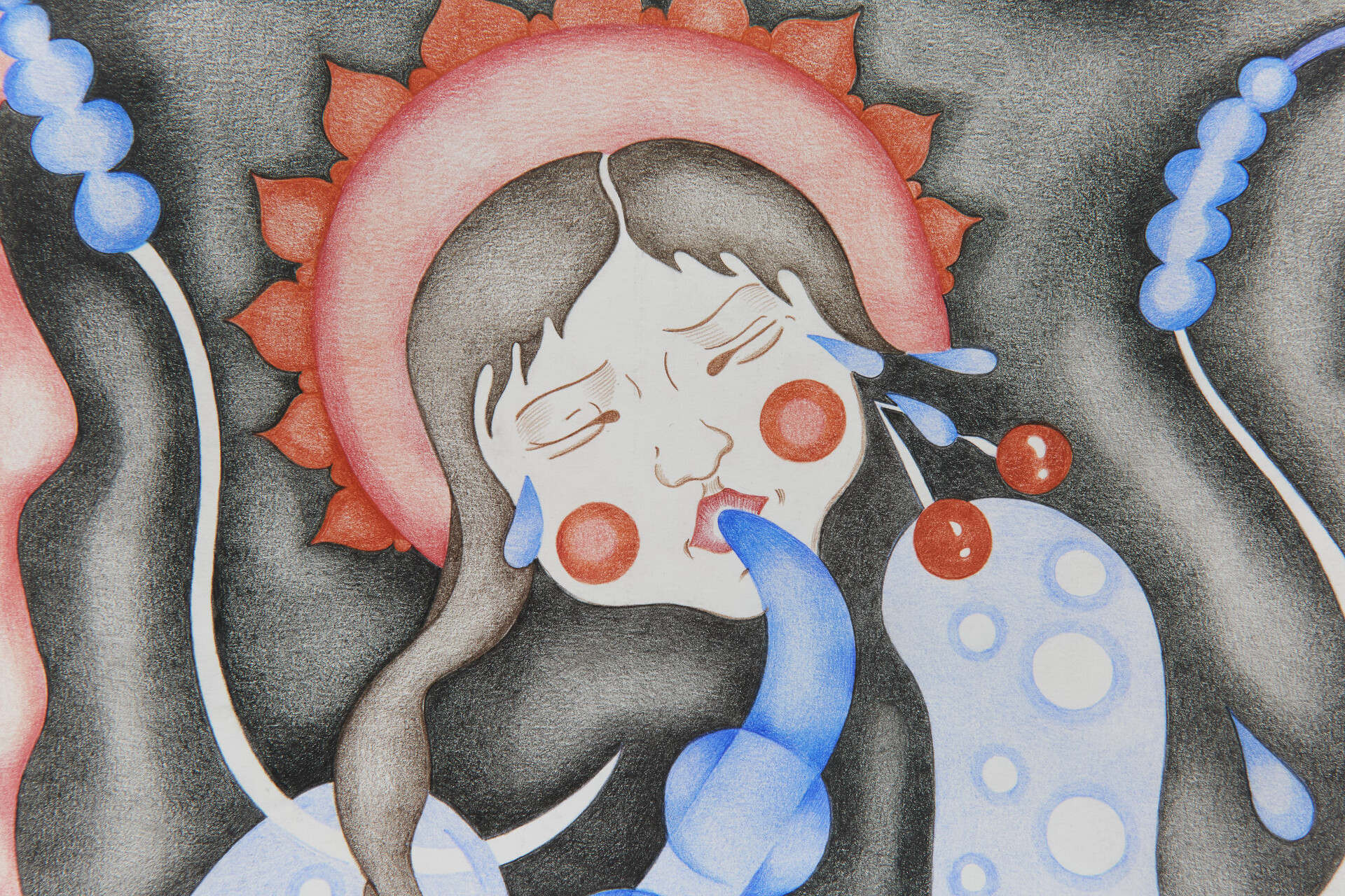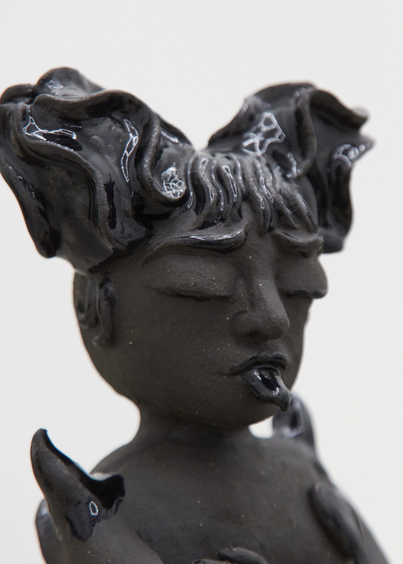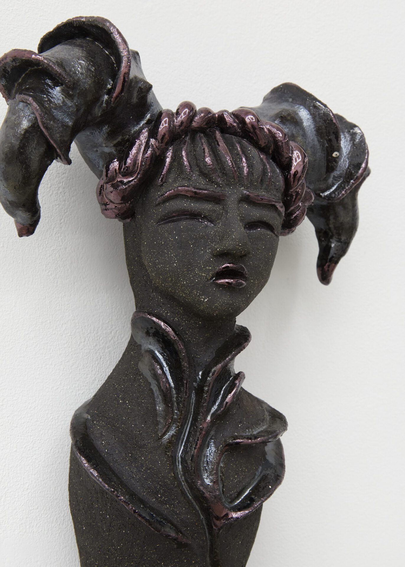 Known for her work with ceramics and coloured pencil drawings; they create the shared ground of her interior and external world. This creative space draws on her childhood, Ukrainian mythology, the 1900 Wiener Werkstatte movement (Vienna Workshop), Soviet avant-garde, and the spread of Western pop-culture after the collapse of the Soviet Union. When she was a child her grandfather, a merchant seaman, used to give her flax and say it was the hair of mermaids, like Undine or Lilly, that he had met when crossing the equator. The blackened Grief Wreath, due to multiple firings, suggests the wreaths commonly worn by young women during Ivana Kupala night, a pre-christian slavic festival to celebrate the summer solstice.