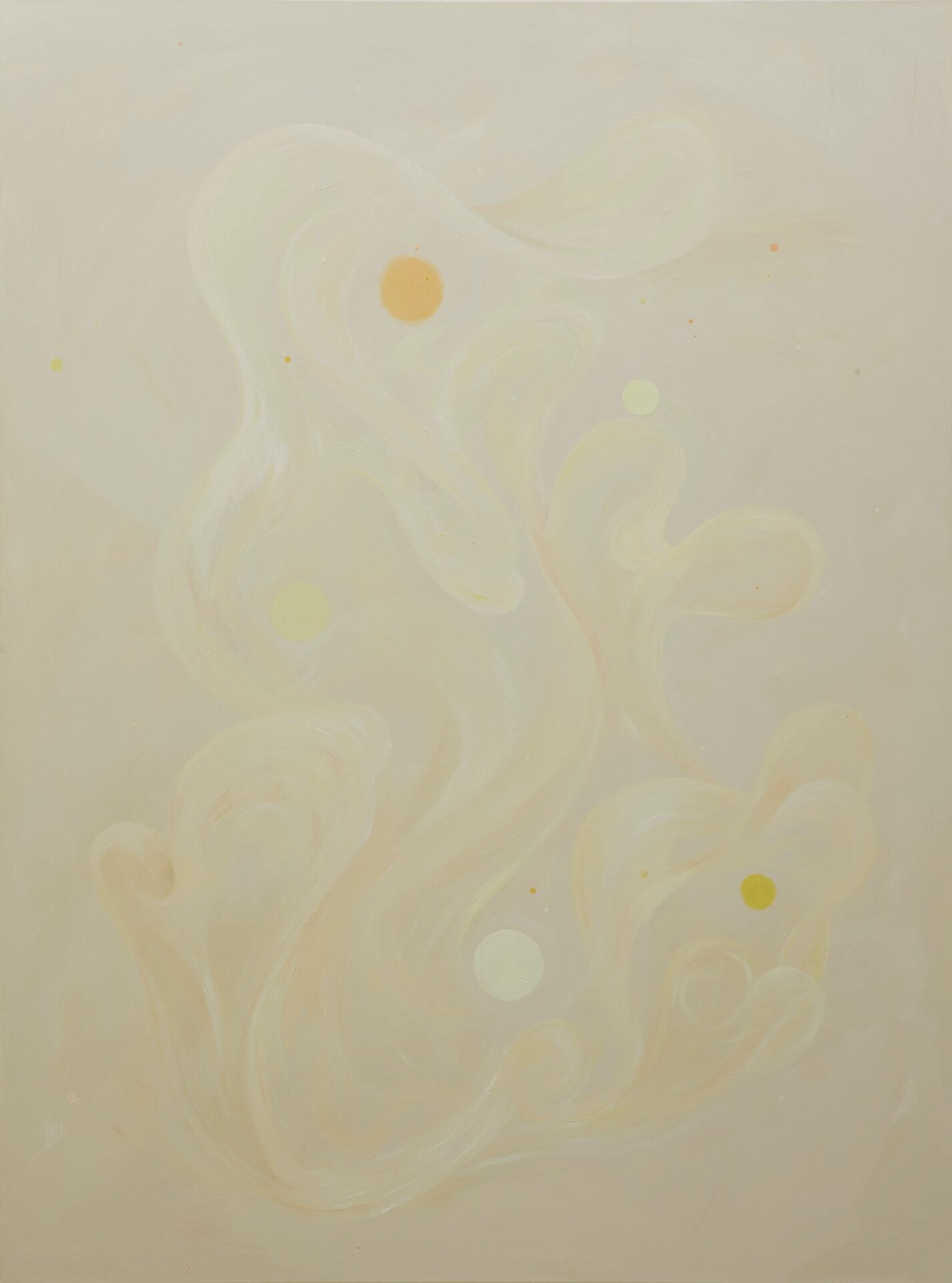As traces are the abstract forms of her paintings and tapestries. Forms sometimes sinuous, ecstatic, dancing, sometimes diaphanous in their almost monochromaticity, and volatile as thoughts, light as ghosts: Mind Playing with Thoughts; sometimes, as in the jacquard Water Spirits (Fauna), they are vibrant with energy realized through vivid colors; always mental and physical at the same time.