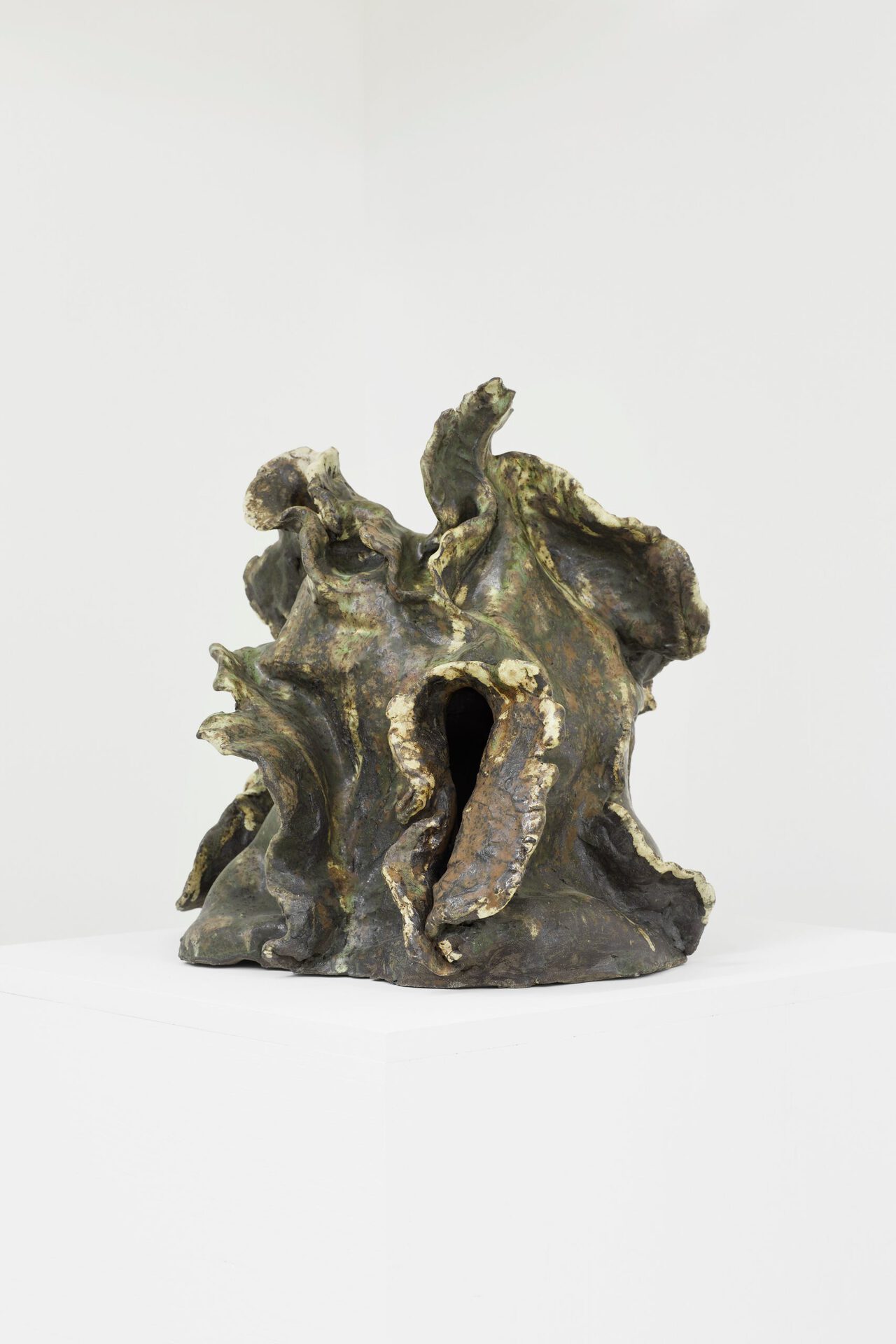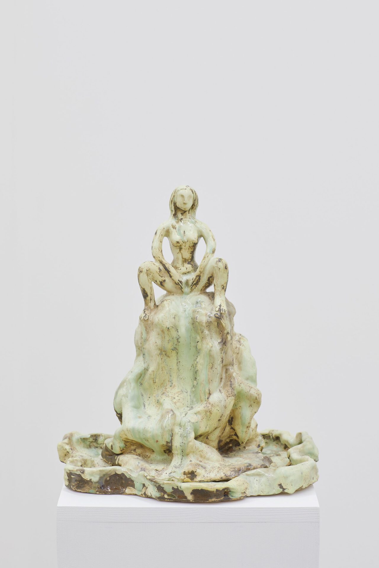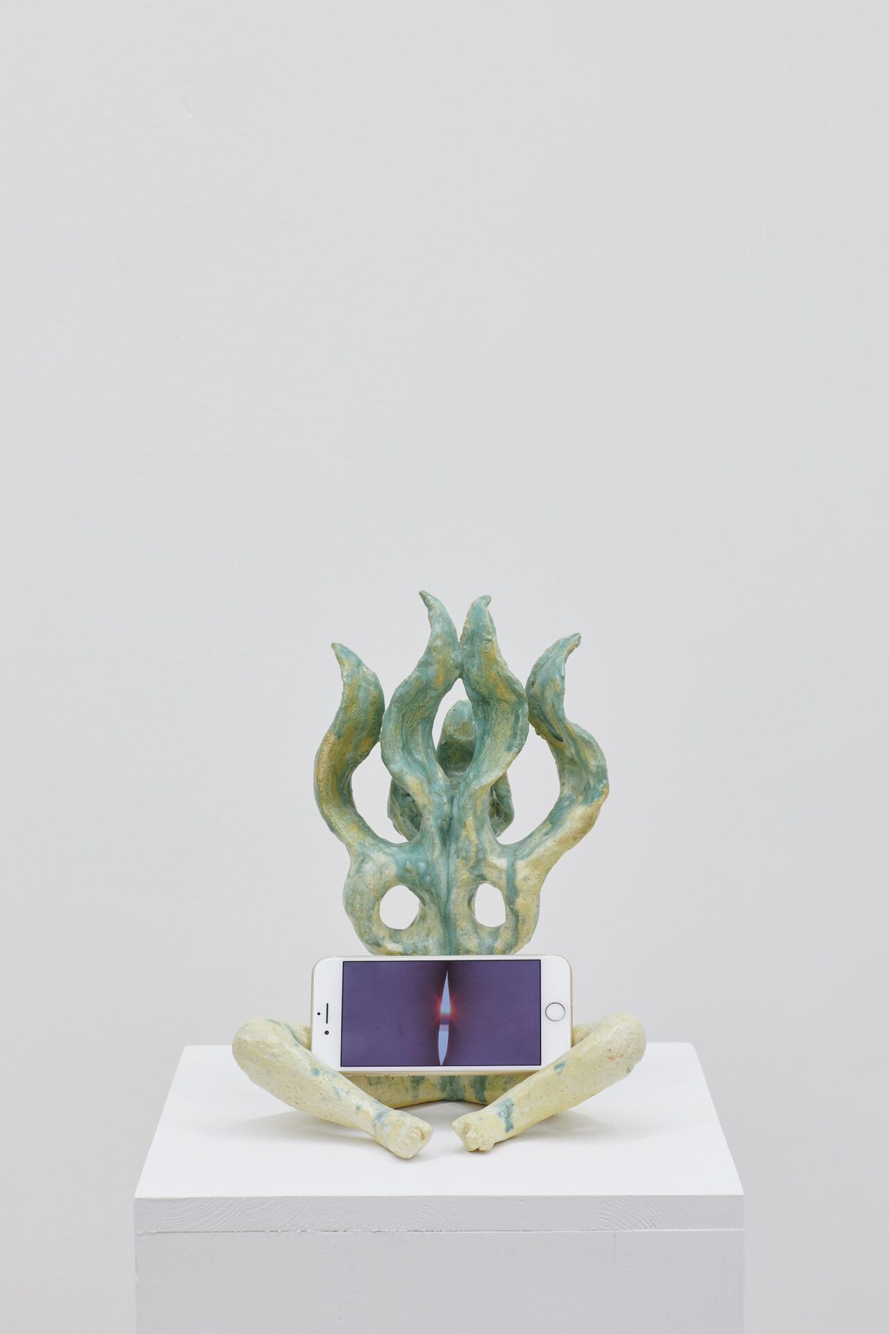 This is also the case when looking at a small ceramic sculpture titled Elf. It represents a female figure, an alien or a hybrid between a sea creature and a human being: thighs wide open with bent knees, her epidermis mottled with a watery green and her raised arms which become multiple and fluid like algae. Elf was conceived of as a support for tablets, but it is a result of a mental short-circuit that touches upon different references: the attraction for the aquatic world, the immersion in the digital present, and the perception of a female humanity placed between worlds and endowed with metamorphic powers.