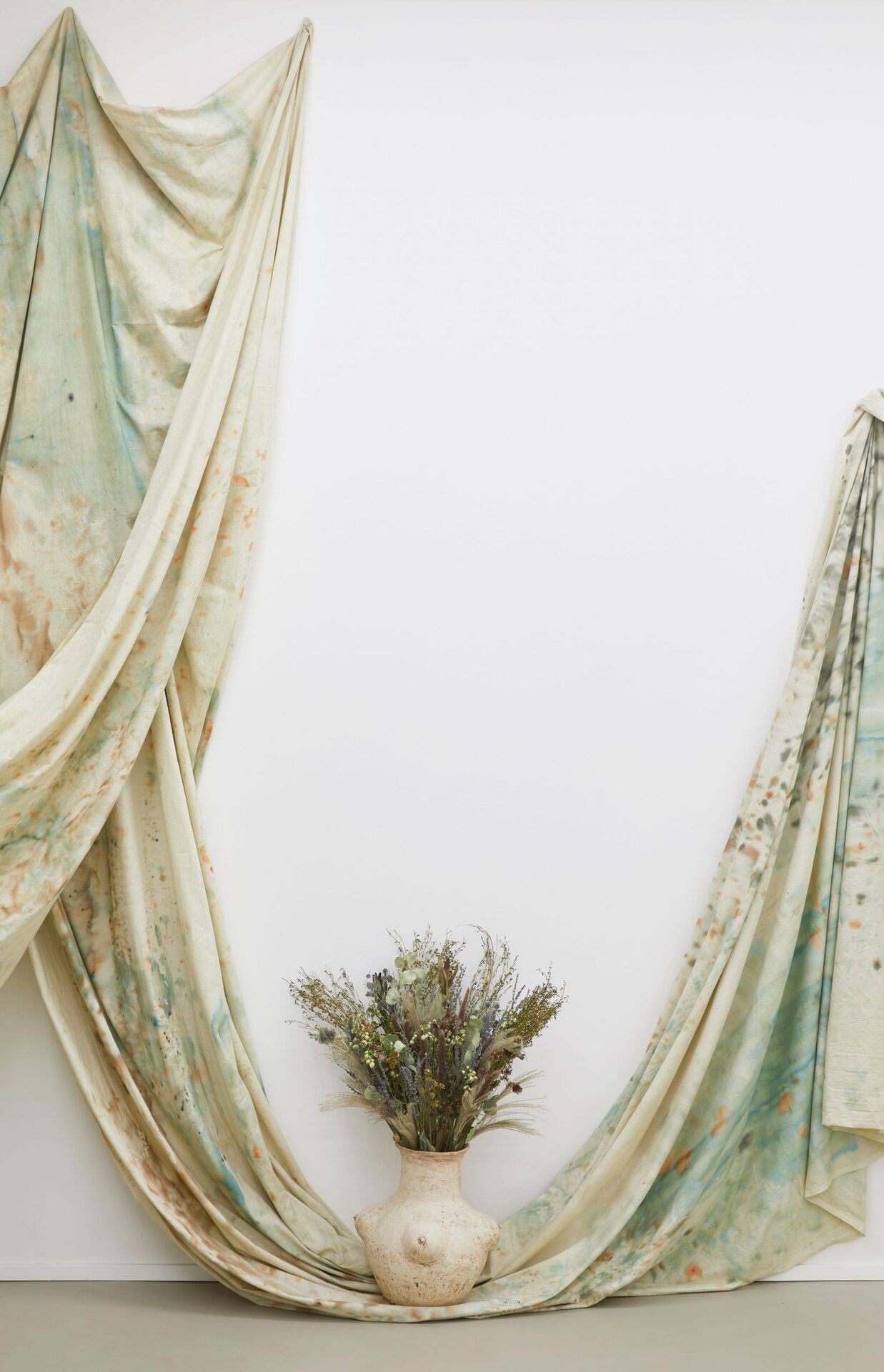 Aquatic ecosystems, and above all the figure of the river, constitutes an important element in Brzeżańska’s work. A notion clearly present in the emblematic 25 meters long The Vistula Textile, made by immersing the cotton fabric in the river, which deposited its organic matter onto it, creating a natural background for Brzeżańska’s abstract painting. The work was made during Flow / Przepływ, an annual water-based artistic residency on a raft organized by the artist, who encourages her guests to immerse themselves into this unique watery experiment of being together and living within nature.